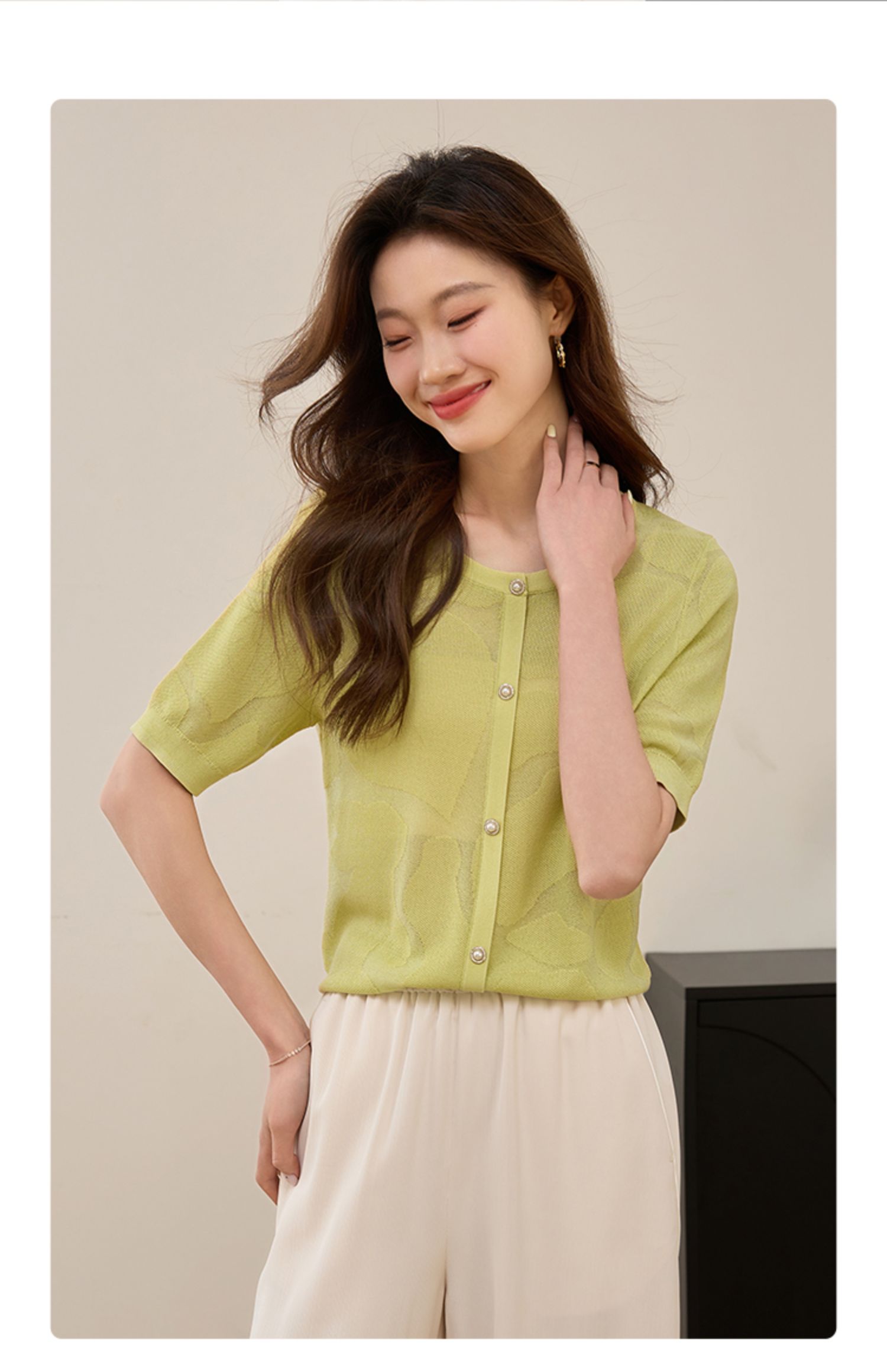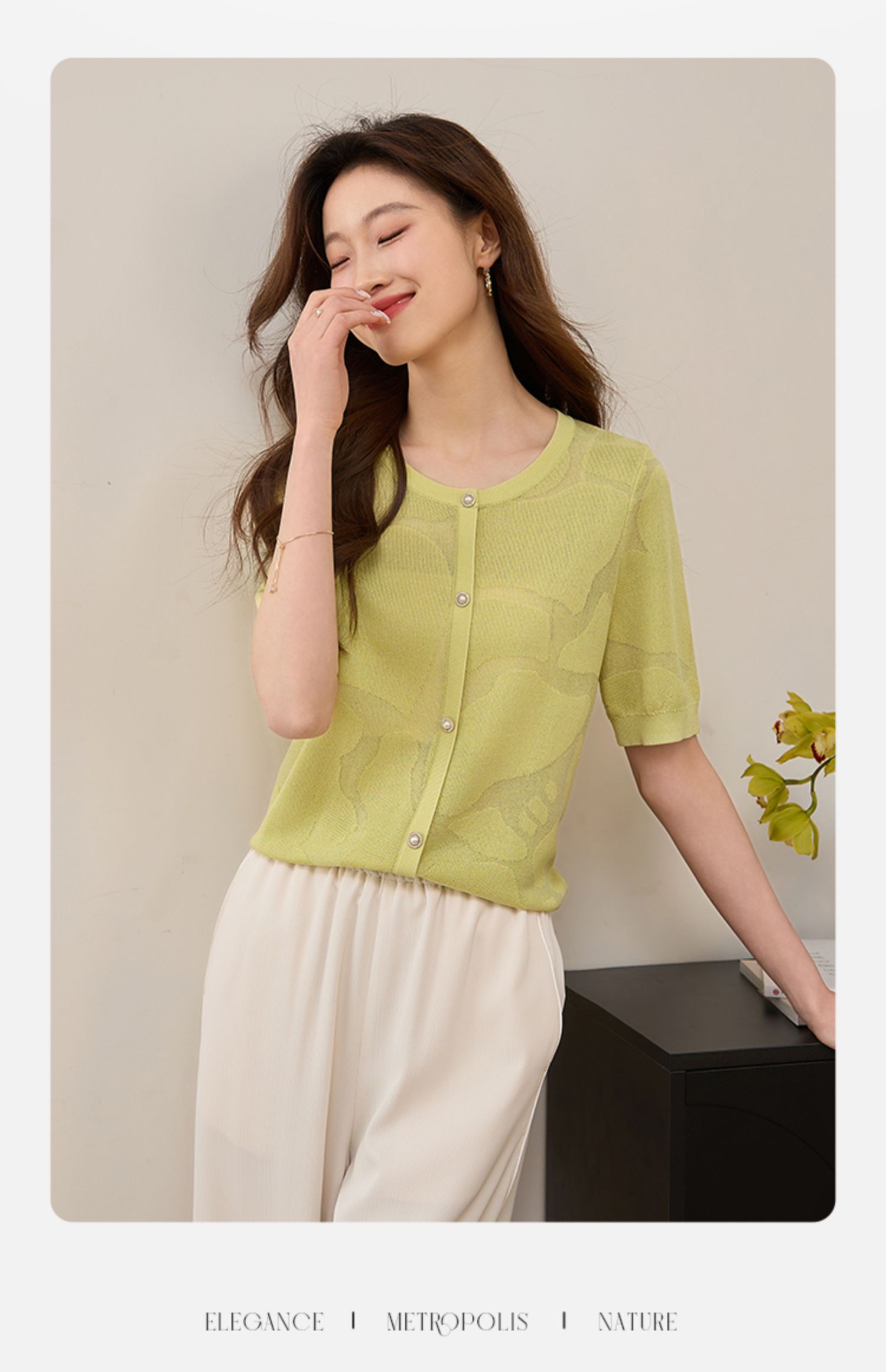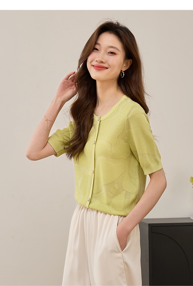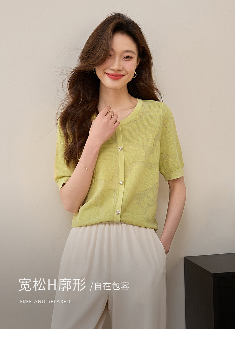 【专属特价】熙世界薄款短袖针织衫女2025夏天新款气质提花圆领正肩冰丝上衣