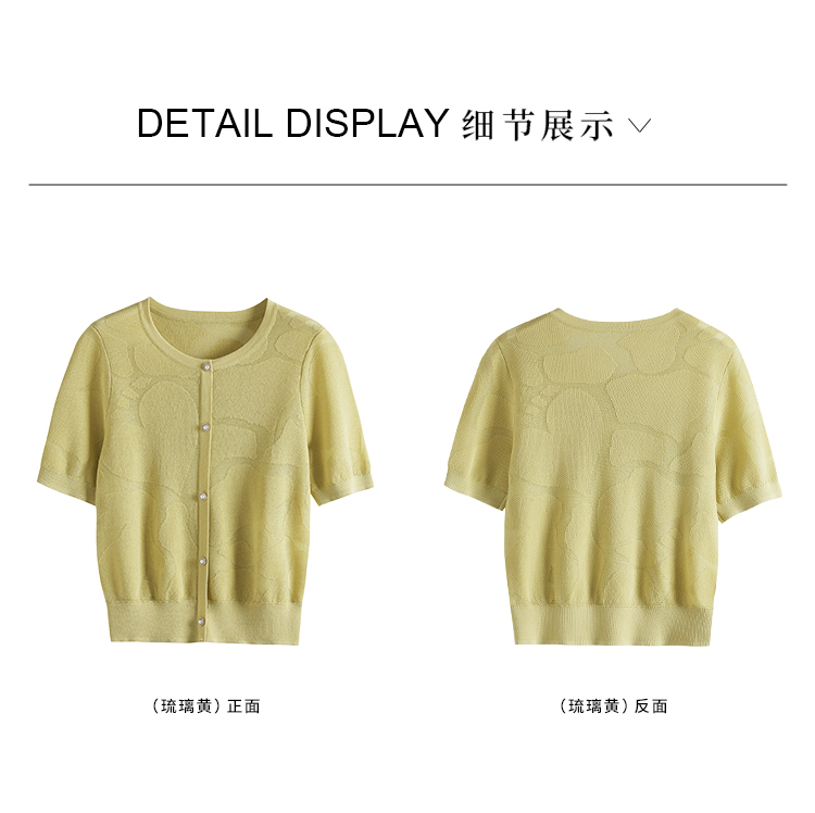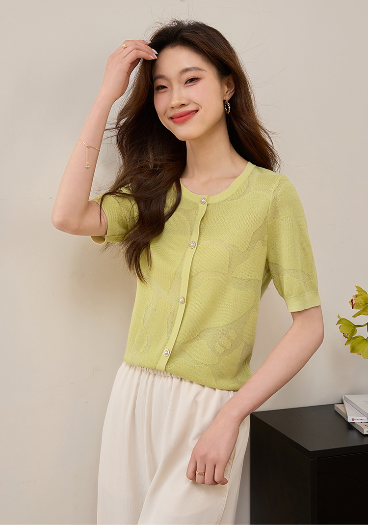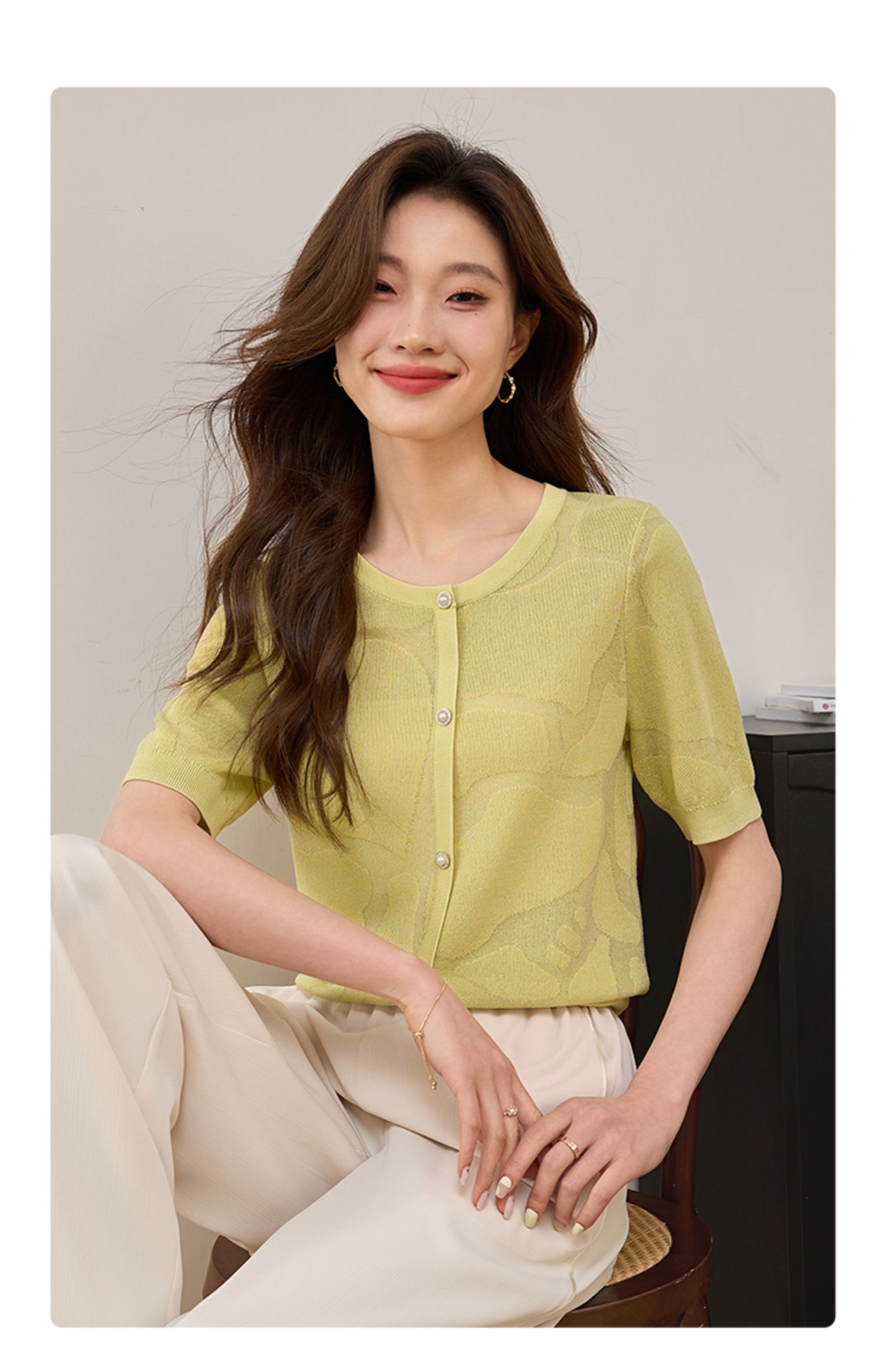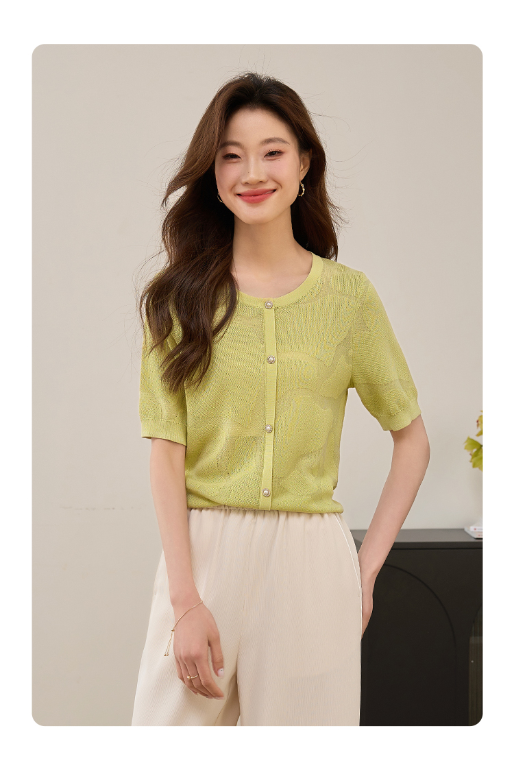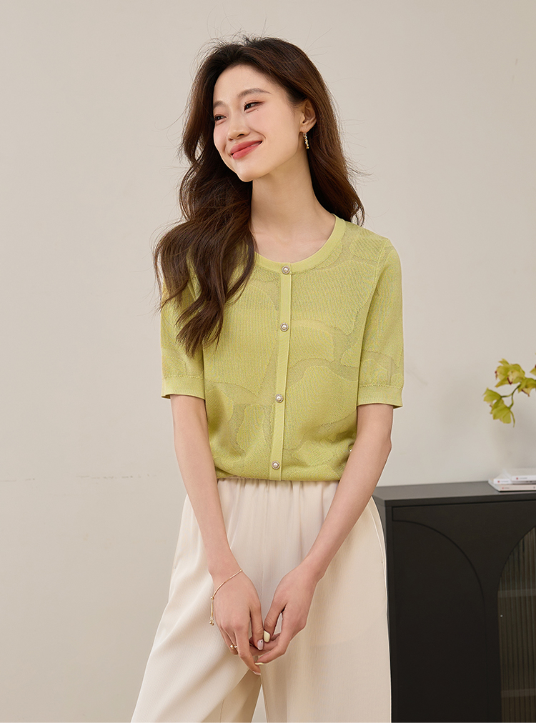【专属特价】熙世界薄款短袖针织衫女2025夏天新款气质提花圆领正肩冰丝上衣