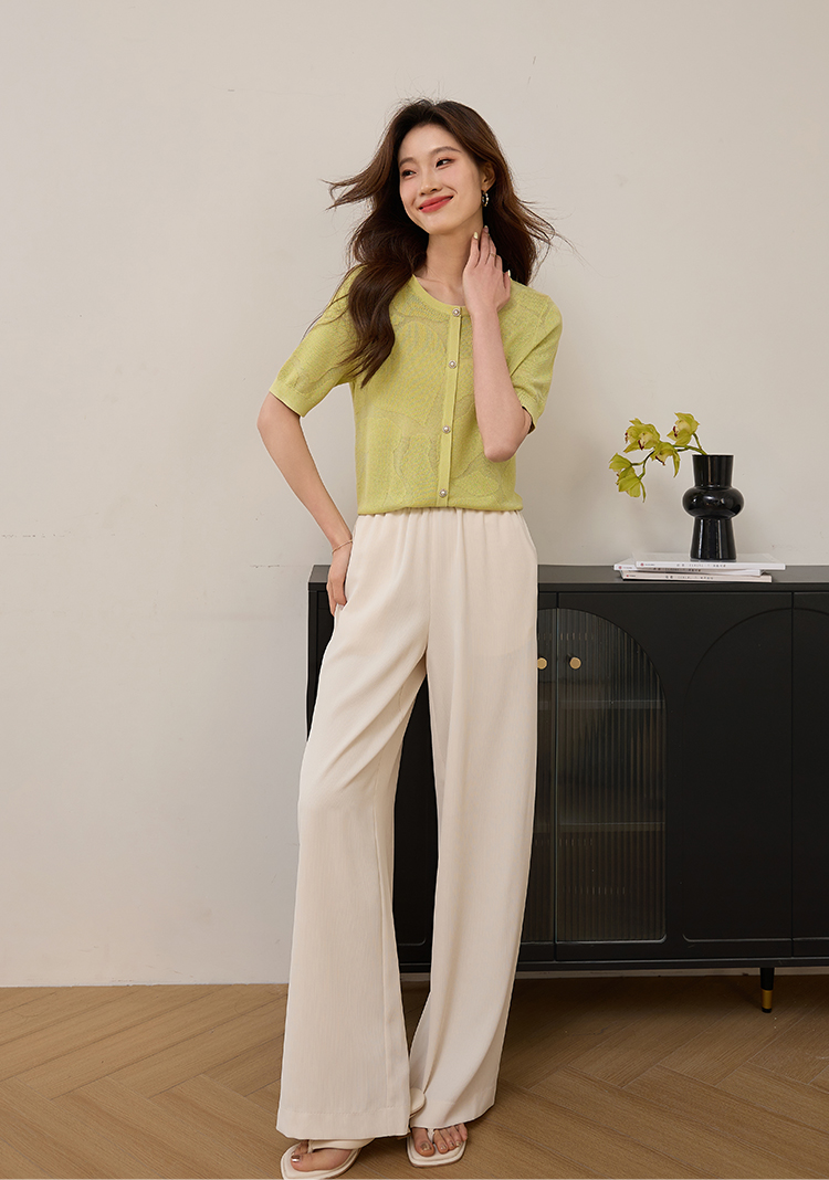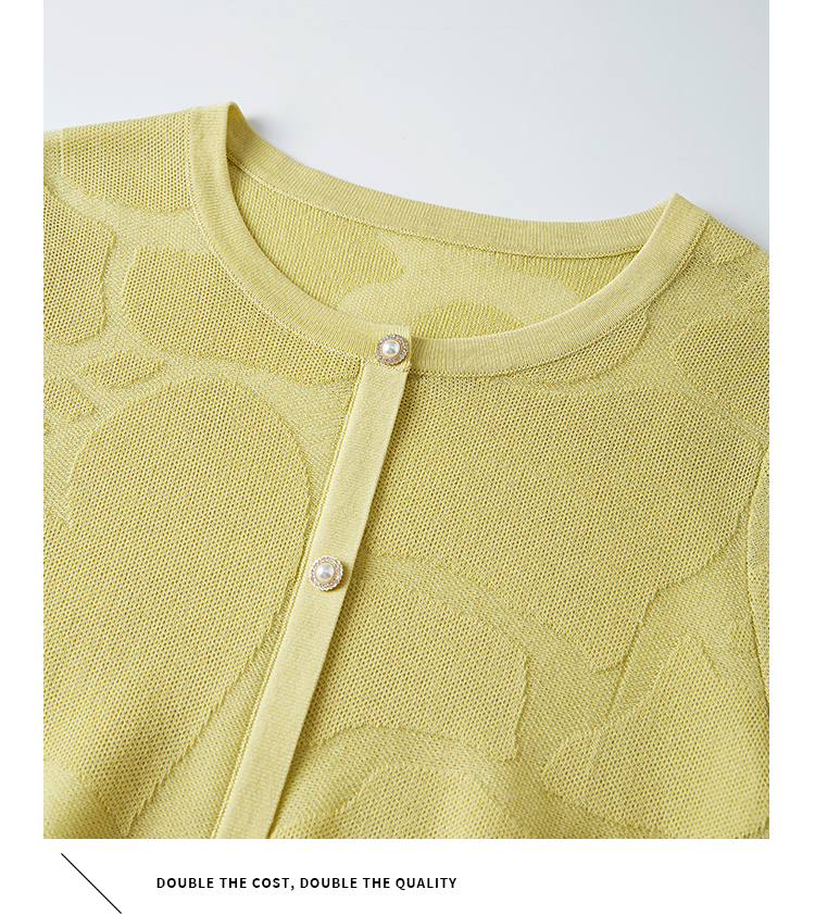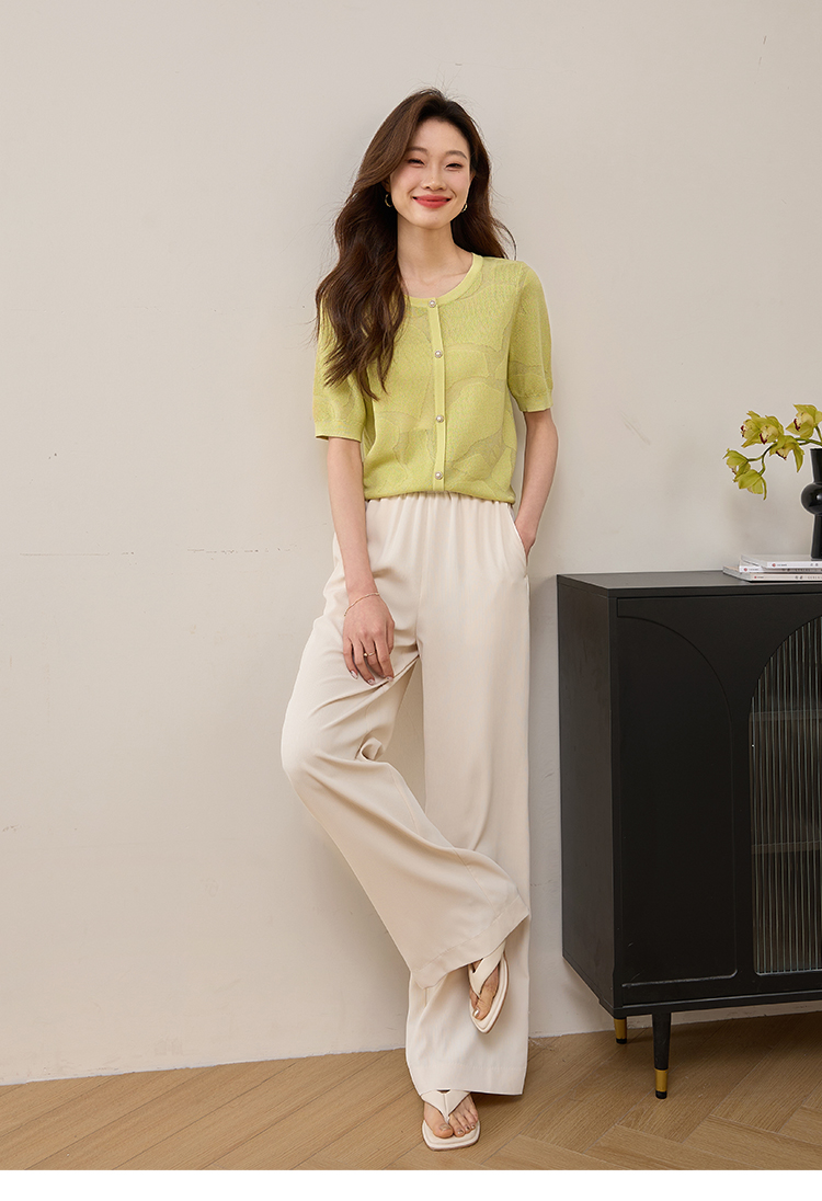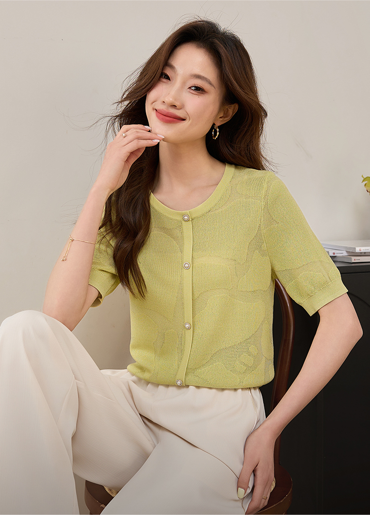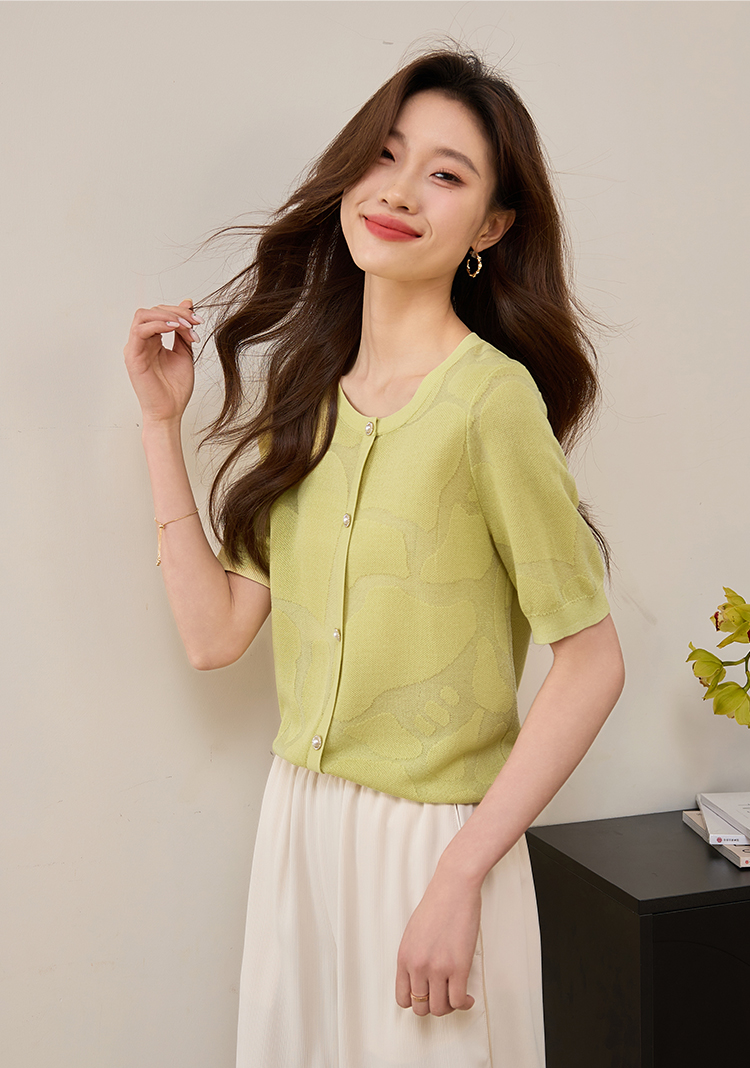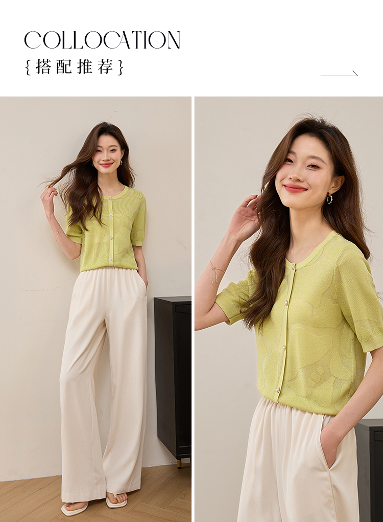 【专属特价】熙世界薄款短袖针织衫女2025夏天新款气质提花圆领正肩冰丝上衣