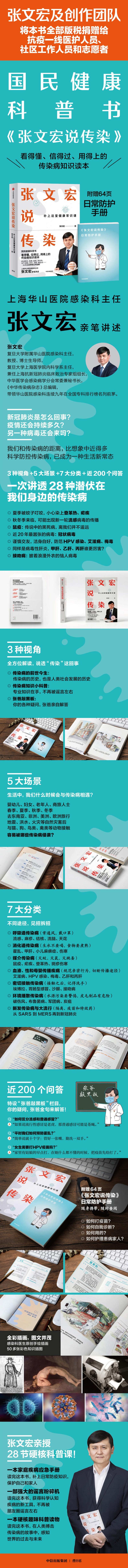 所以就有了《张文宏说传染》这本书。如何用大众乐于接受的方式,普及传染病专业知识,是我一直在想、在做的事。编写《张文宏说传染》的时候,敲下每句话之前,我会问自己:没有医学常识的普通人能看懂吗?我们生活中处处可能受到传染病的侵袭:家里有老人、孩子,旅行的时候,换季的时候,自然灾害后……对每一种传染病,本书对其历史和现实中的暴发流行进行了全面的介绍。在让大家了解疾病流行的同时,还提供了翔实的生活防护贴士,让我们既在历史中看清未来的走向,也在现实生活中过得更加安全。相信随着科学的发展,人类控制住传染病也只是时间的问题。