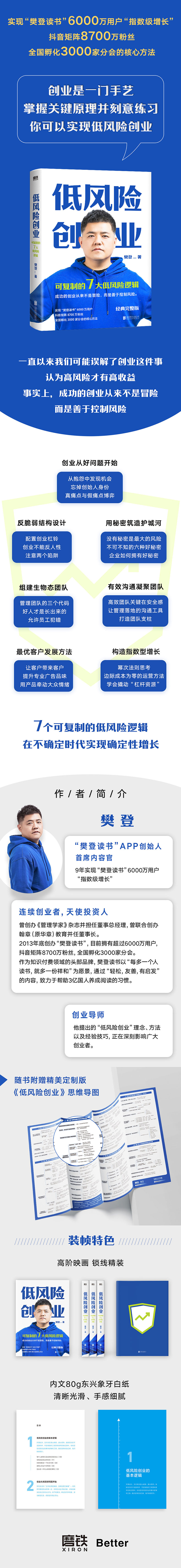 "★实现“樊登读书”6000万用户“指数级增长”, 抖音矩阵8700万粉丝, 全国孵化3000家分会的核心方法。 ★创业是一门手艺,掌握关键原理并刻意练习,你可以实现低风险创业。 ★一直以来我们可能误解了创业这件事,认为高风险才有高收益。事实上,成功的创业从来不是冒险,而是善于控制风险。 ★7个可复制的低风险逻辑,在不确定时代实现确定性增长,你可以实现低风险创业。"
