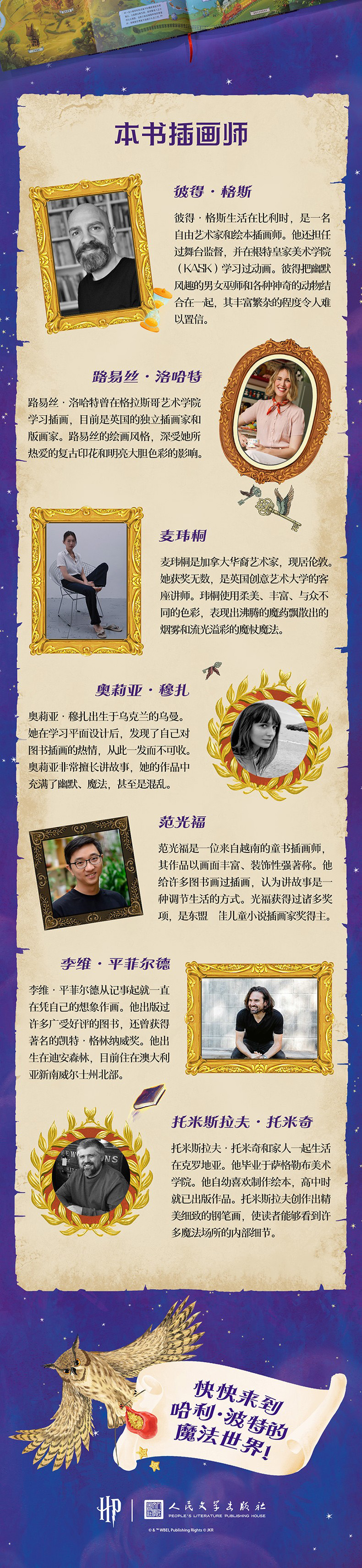 《哈利·波特魔法图鉴》是“哈利·波特”官方魔法周边书,邀请了七位重量插画师以各色风格呈现J。K。罗琳笔下的魔法世界。这本终极魔法汇编可以视作官方授权彩绘版“哈利·波特”百科全书,每幅跨页图都从不同维度对“哈利·波特”原著故事中的各种细节进行了梳理,汇集了七部故事中的经典角色和难忘时刻,整理了涵盖各类魔法知识的名录、图表、地图,编目清晰,便于探索。在这本适合全年龄段阅读的“哈利·波特”彩绘周边书中,你可以尽情探寻魔法场所,研究魔杖的奥秘,遇见神奇动物,了解杰出巫师的精彩人生。从分院帽到各种咒语,与魔法相关的一切尽在其中!一册图鉴在手,你就是魔法“万事通”!
