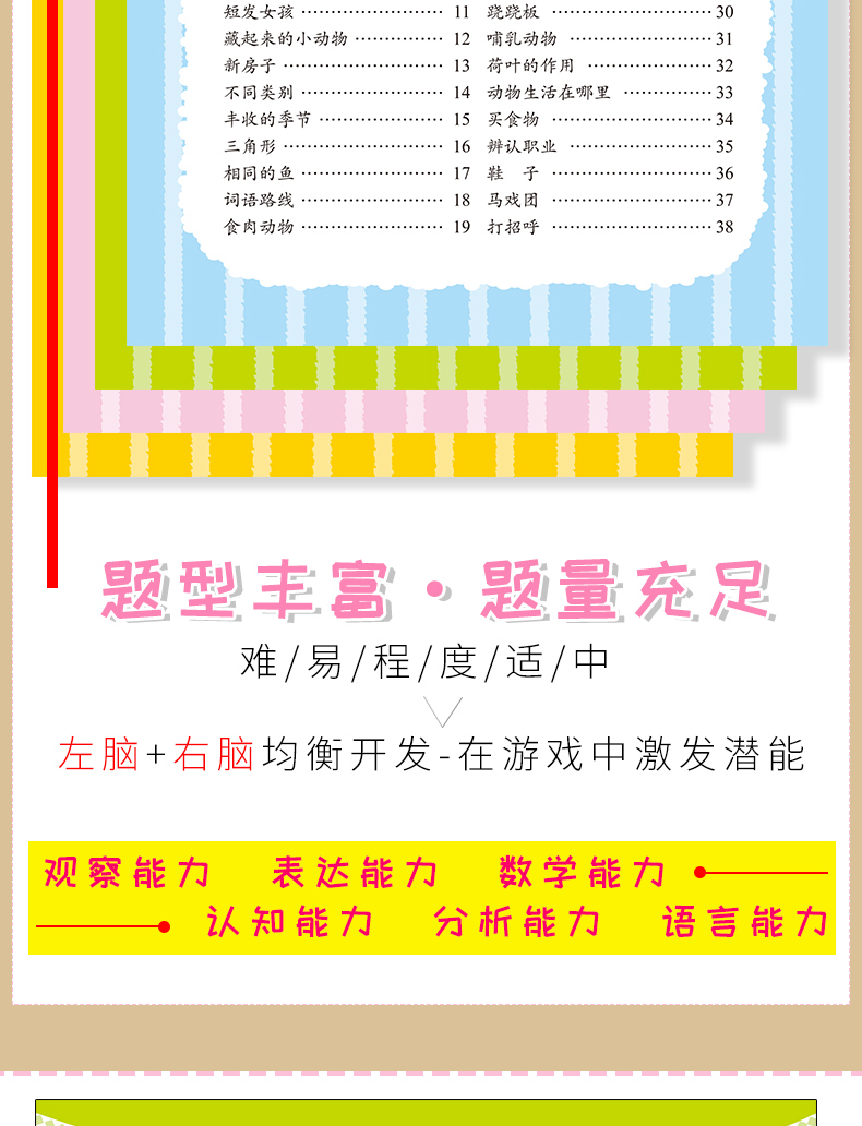这是一套专为3-6岁幼儿设计的亲子只智力游戏书,丛书分为4册,在通过丰富多彩、轻松有趣,培养孩子的数学空间知觉、观察、认知、语言,分析和判断等多种能力、培养孩子专注力有效激发孩子的大脑潜能。家长只需要每天花半个小时与孩子一起玩这些游戏,就能实现高品质的亲子陪伴,给孩子优质的家庭教育。