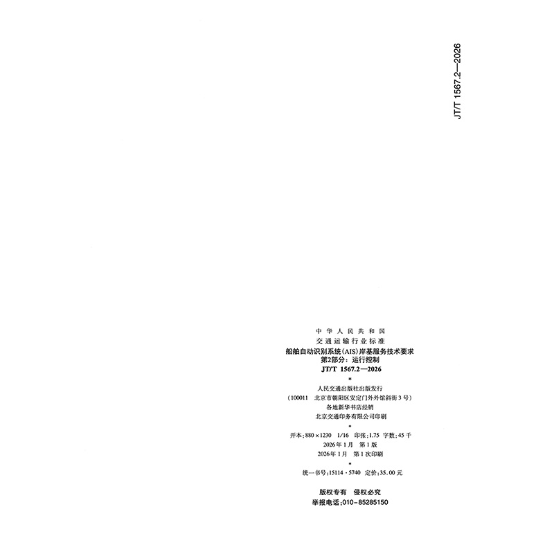 书名:船舶自动识别系统(AIS)岸基服务技术要求 第2部分:运行控制(JT/T 1567.2—2026)