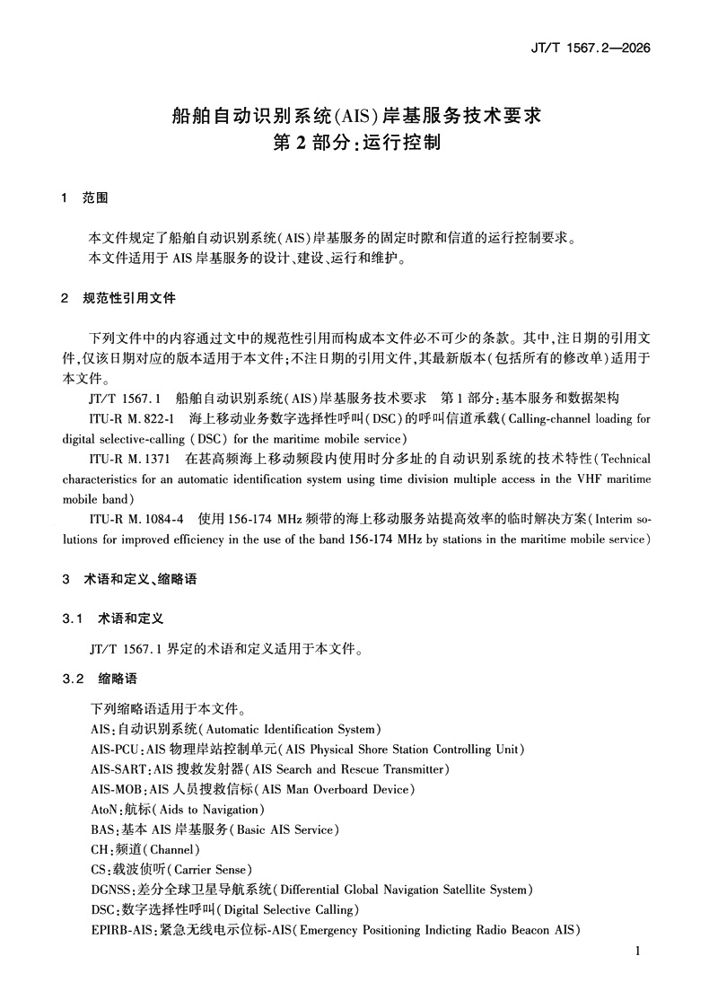 船舶自动识别系统(AIS)岸基服务技术要求 第2部分:运行控制(JT/T 1567.2—2026)