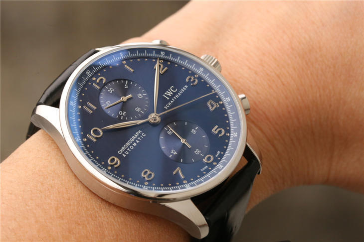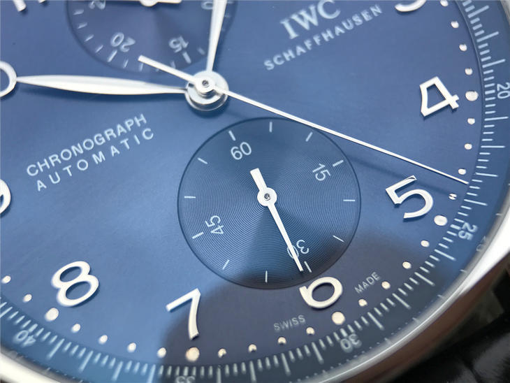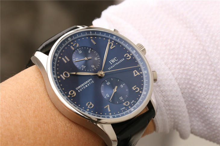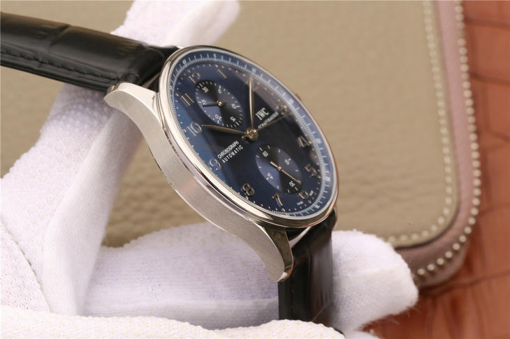 YL万国V7版本蓝面葡计上市,40.9mm,12.3mm厚。特点:1,时分秒针高度与正品一致,紧贴表盘,只有YL,weiyi一家能够做到;2,表盘字钉圆润光滑,刻度点才有CNC雕刻工艺。克服市面现有葡计版本字钉不像的问题,可以放大对比;3,市场weiyi葡计机芯上雕刻瑞士制造和摆轮下方带有机芯编码。