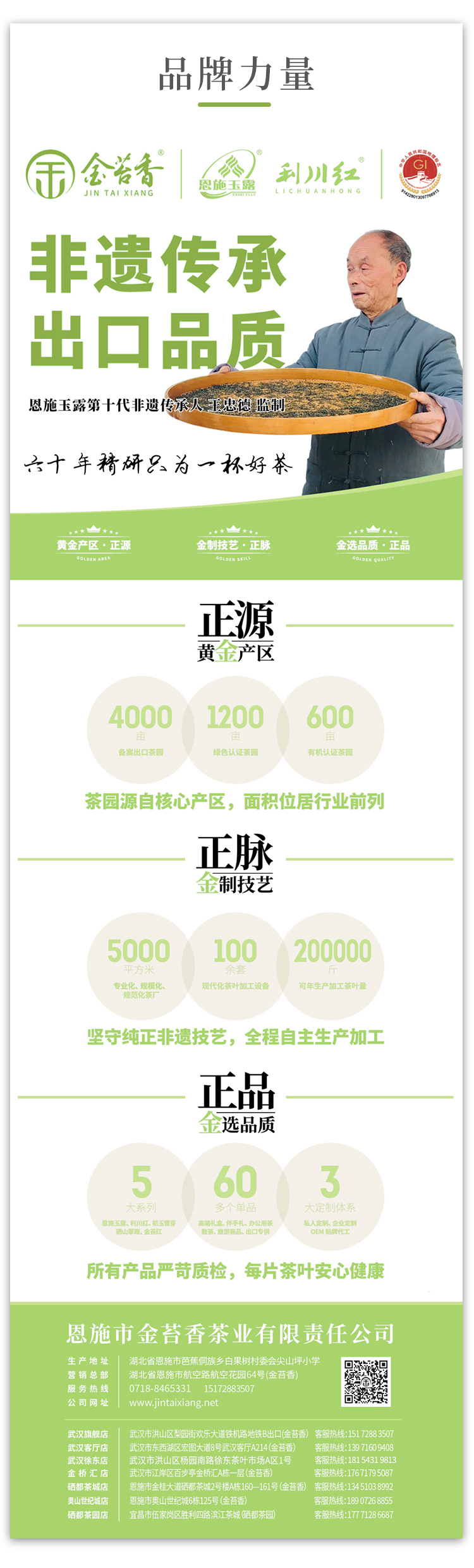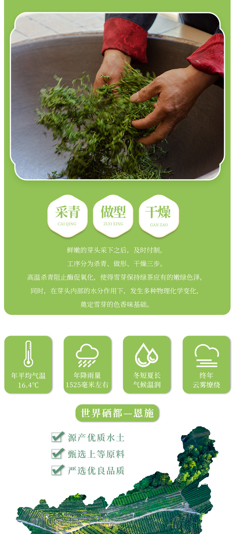 恩施明前茶极好,还好在它工艺独到、品质精粹。就拿金苔香名茶恩施玉露来说——6斤鲜叶,50000多颗一芽一叶,先蒸后炒,历经八大工序。最终才只得1斤干茶。