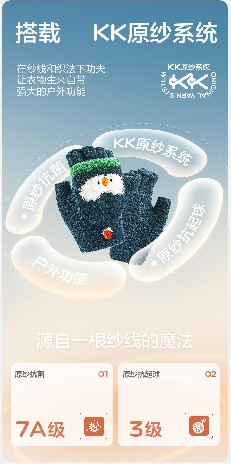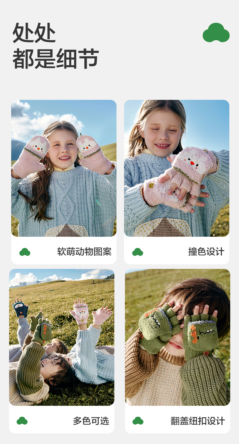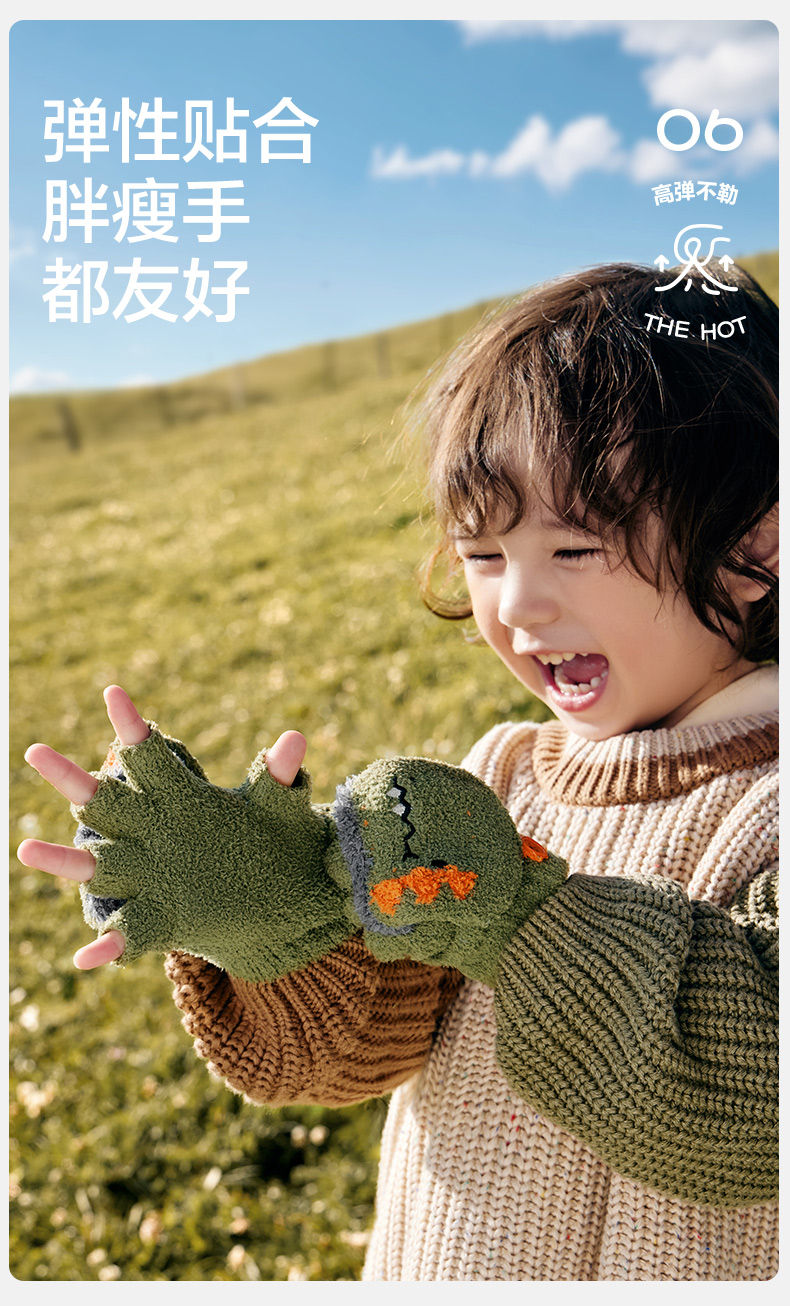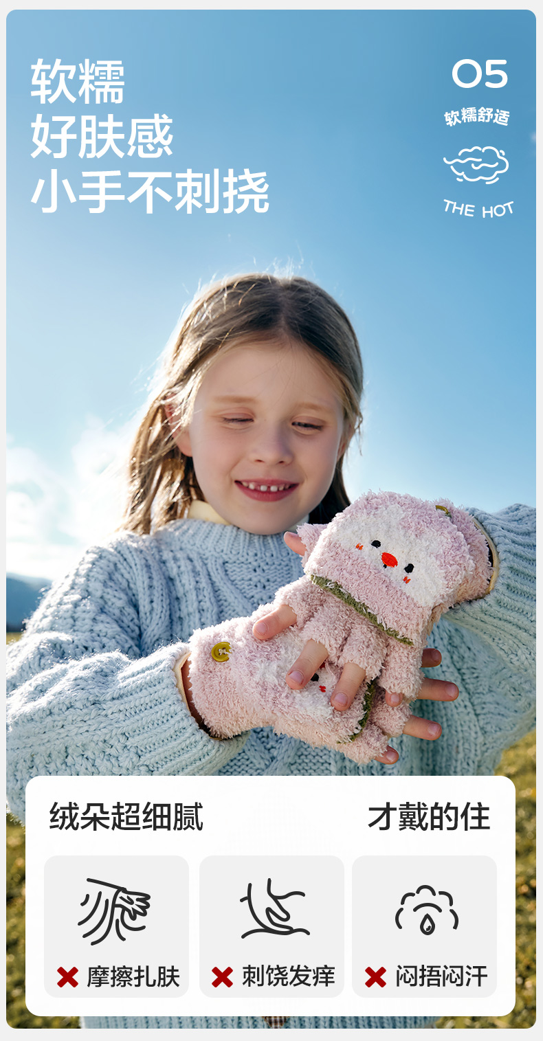 KK树儿童手套秋冬季男女童半指翻盖原纱保暖半边绒小学生写字手套超好rua翻盖手套