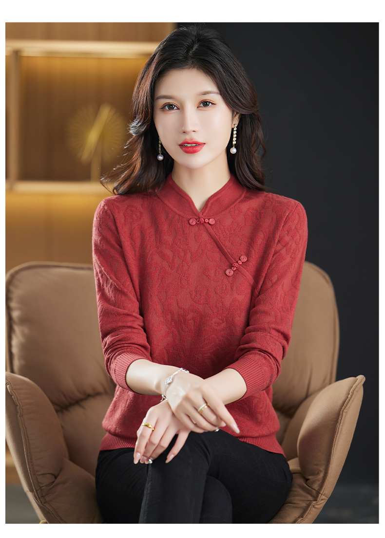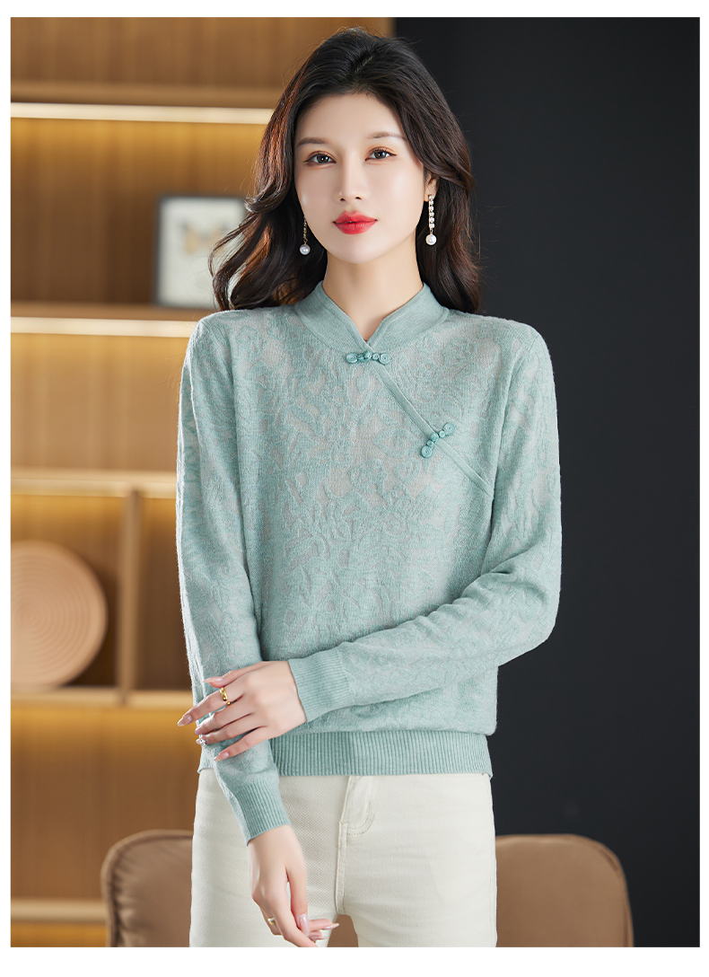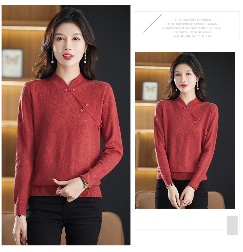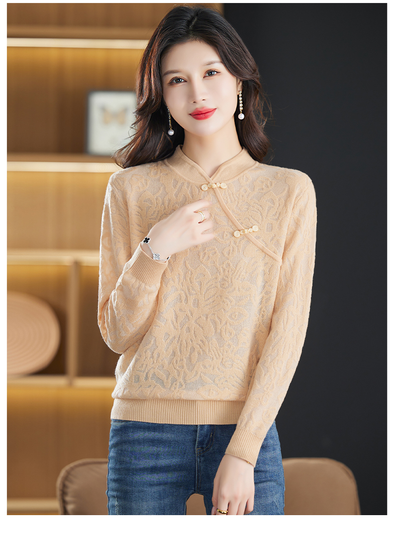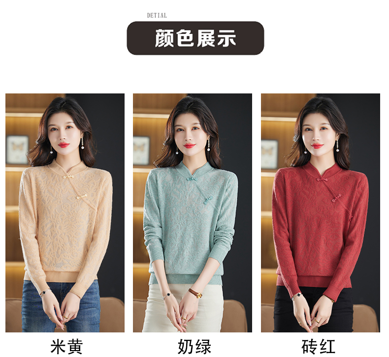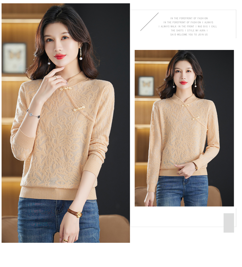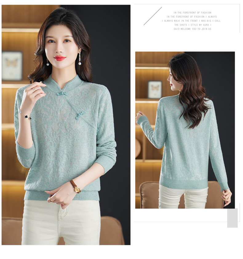 立领长袖上衣秋装女,新款针织衫旗袍扣妈妈蕾丝毛衣打底衫洋气CC-9506