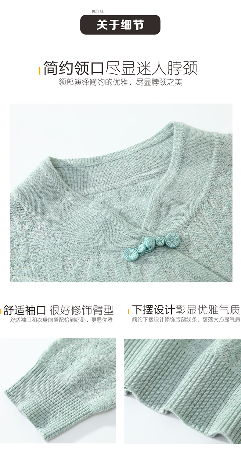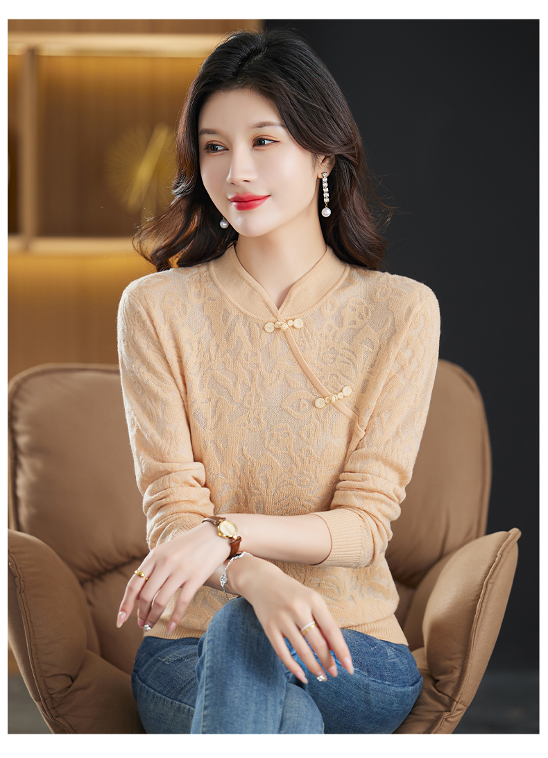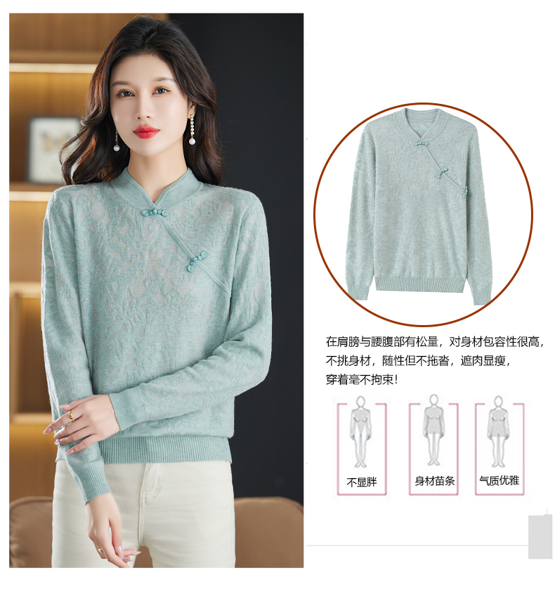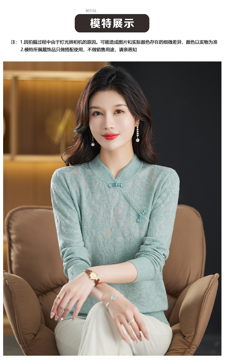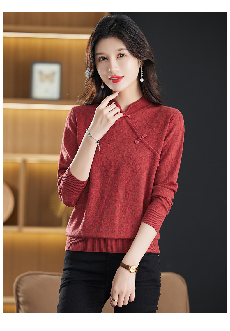 立领长袖上衣秋装女,新款针织衫旗袍扣妈妈蕾丝毛衣打底衫洋气CC-9506