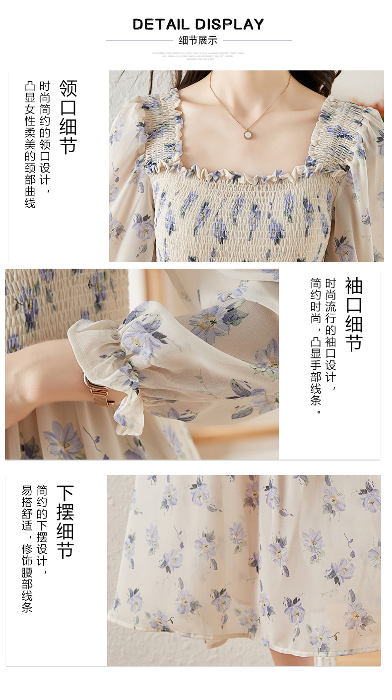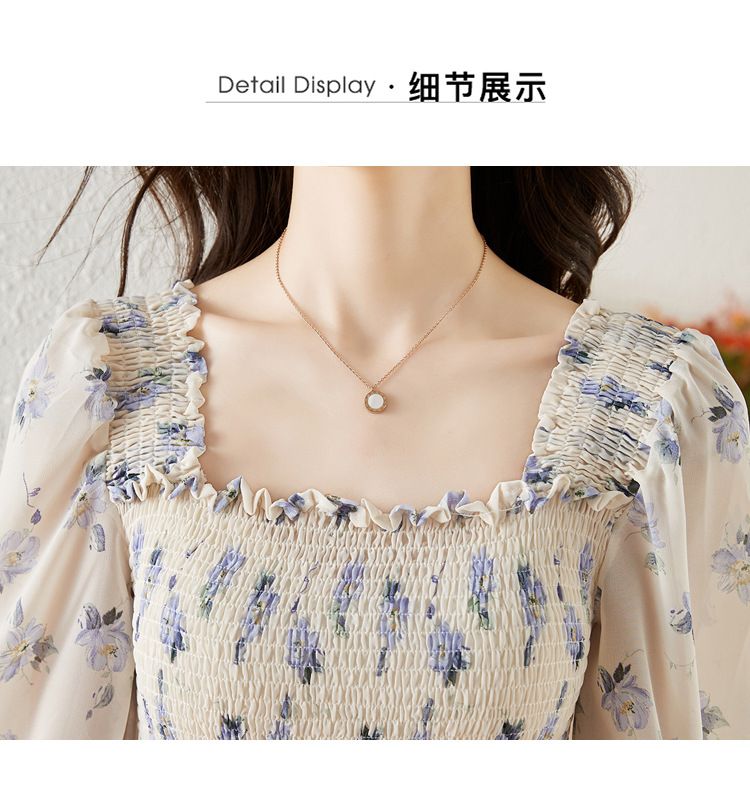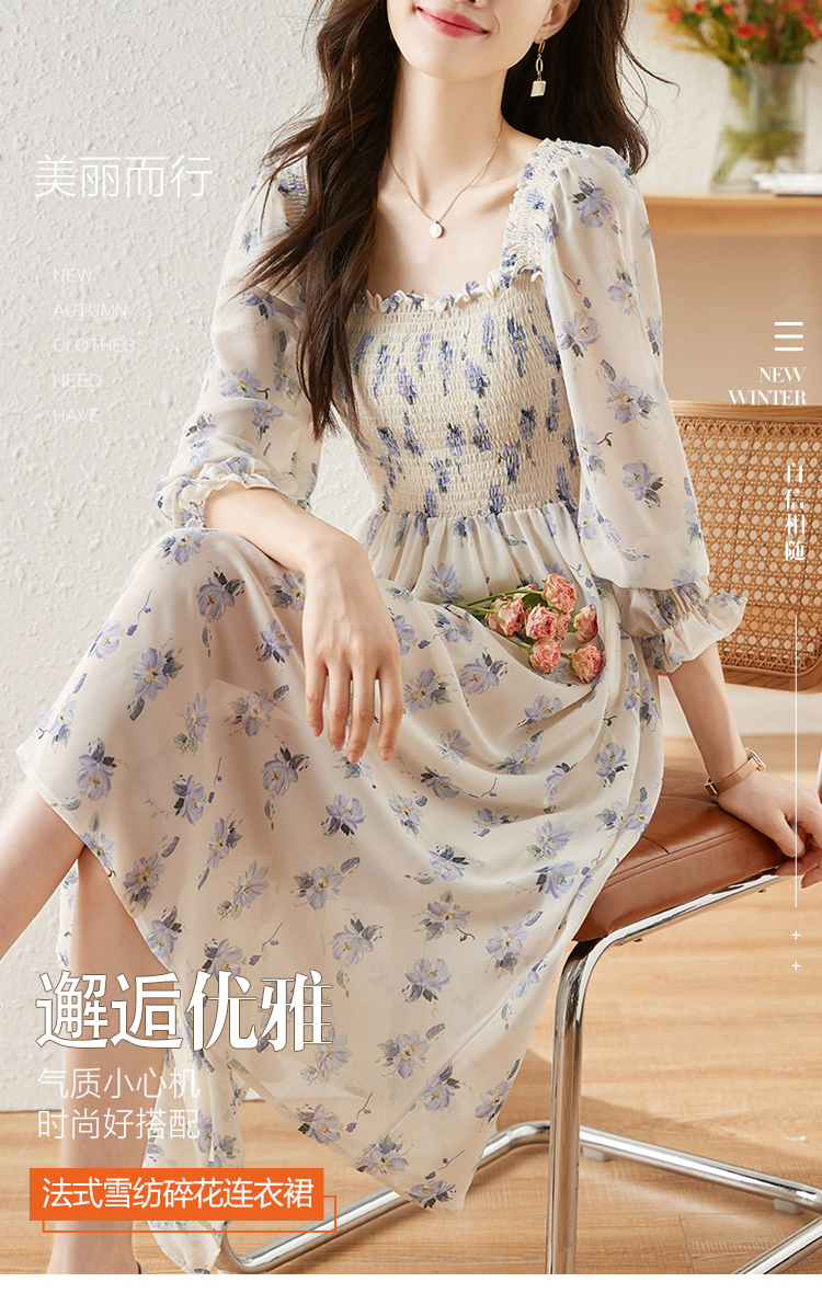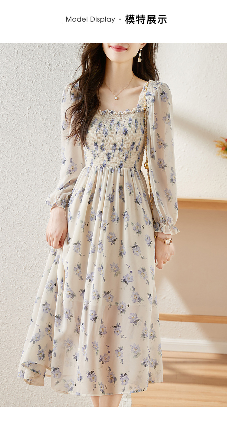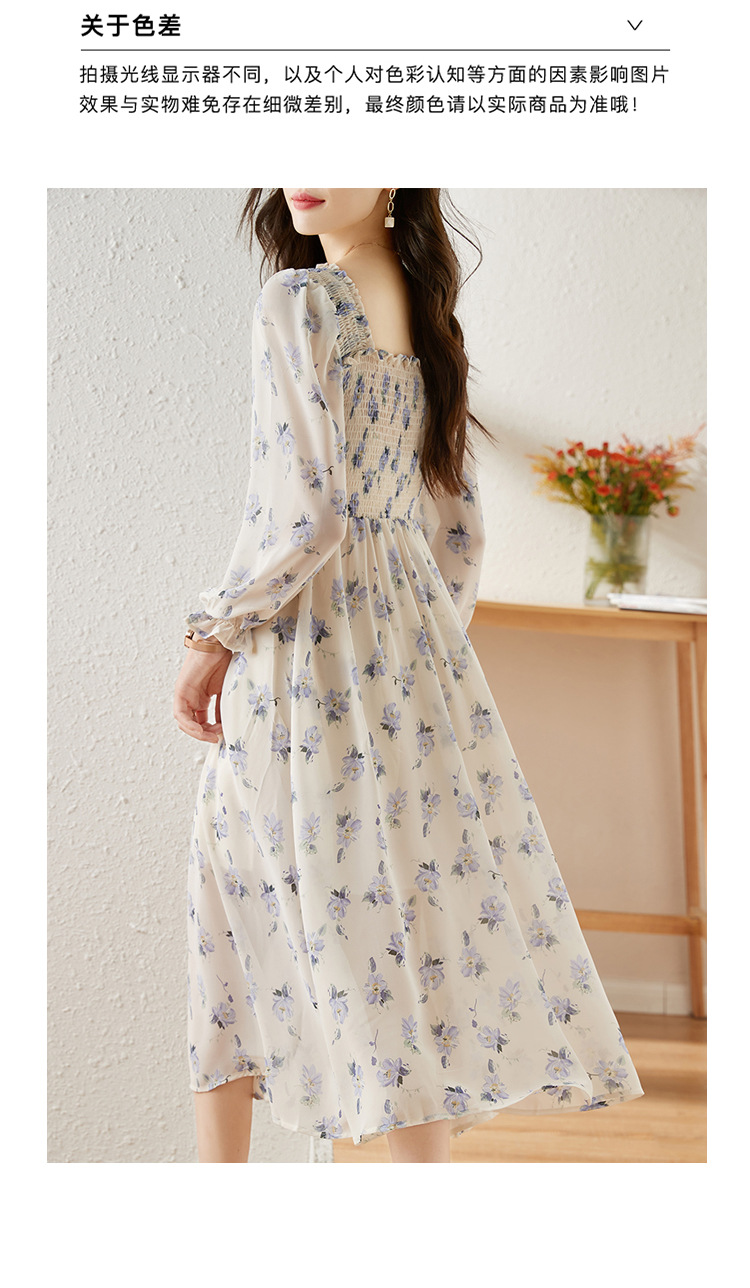 甜美法式雪纺碎花连衣裙长款2022秋新款设计感小众方领裙子 DL1922