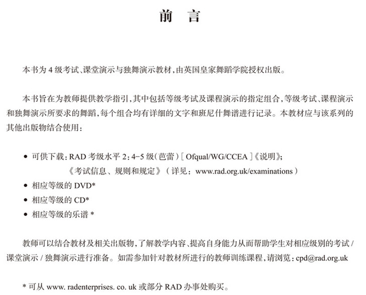 本书是英国皇家舞蹈学院舞蹈等级考试的近期新版教材。英国皇家舞蹈学院考级课程在靠前上受到一致认可,内容新颖,更注重孩子个性的培养。此次出版的内容包括启蒙级—初级、1—3级、4级、5级的教程,其中包括舞蹈等级考试与课堂演示及独舞演示所使用的详细文字与班尼什舞谱,并配有丰富精致的音频和视频,方便老师与学生教学使用。