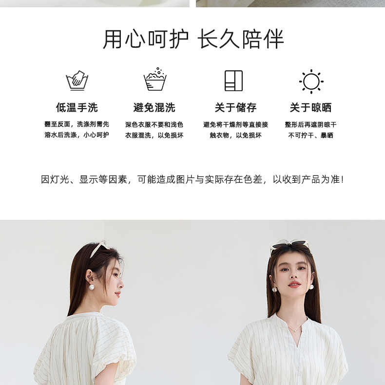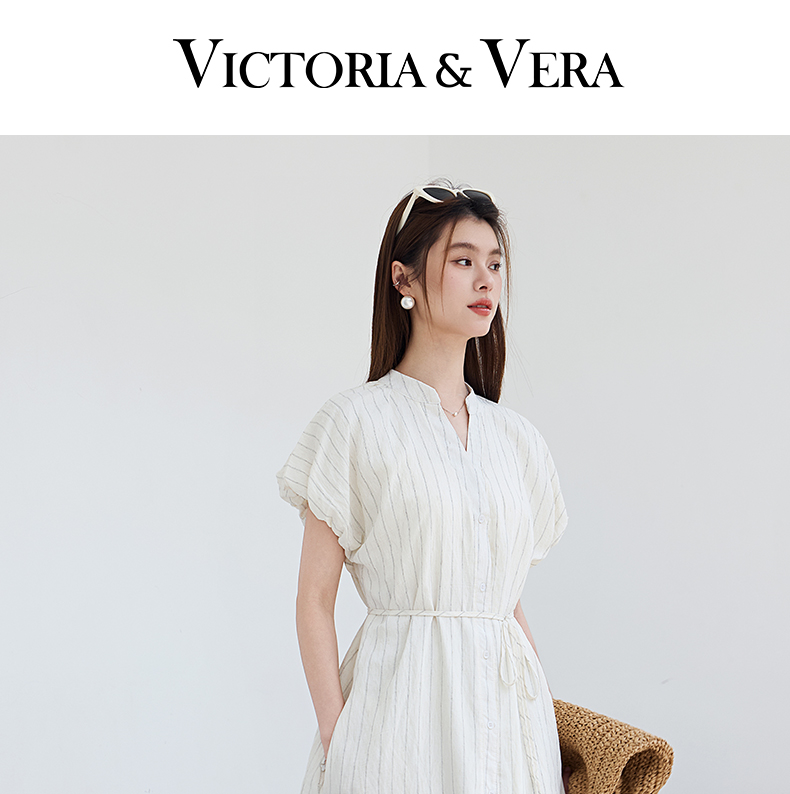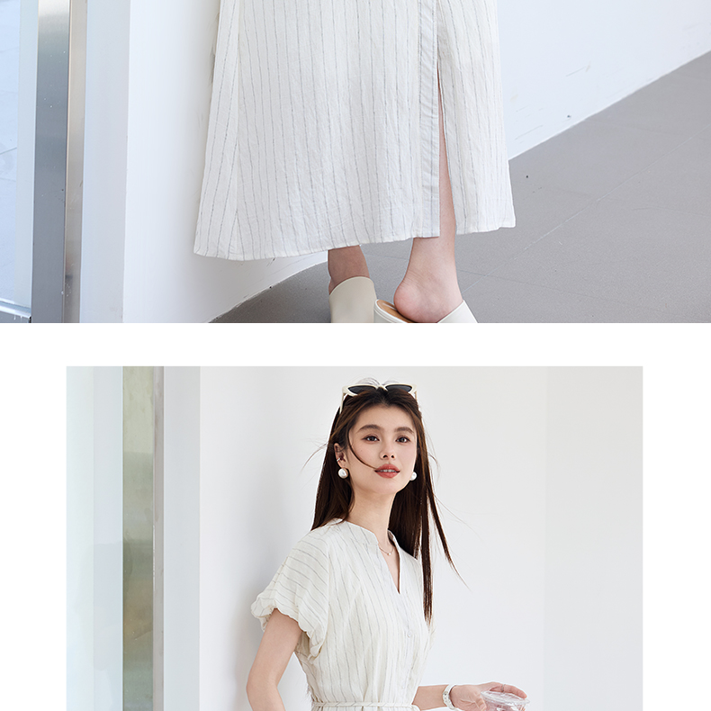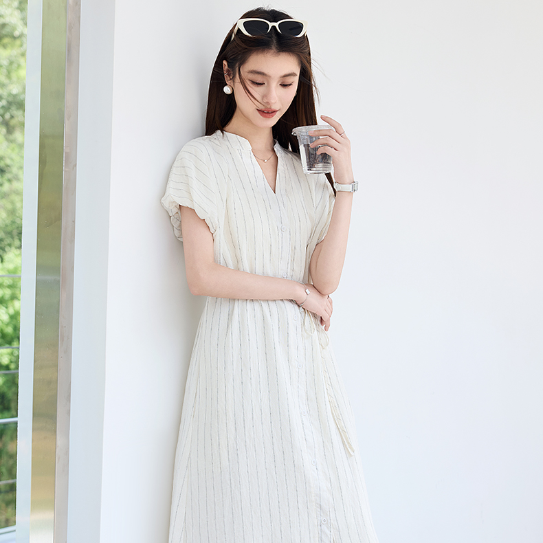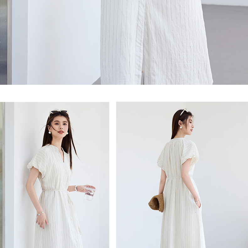 VICTORIA&VERA夏季“氧气少女”系列竖条纹连衣裙小V领绑带收腰泡泡飞袖通勤约会显瘦遮副乳---V9013L05