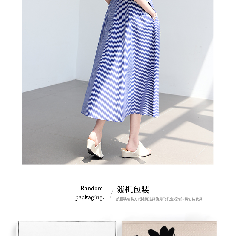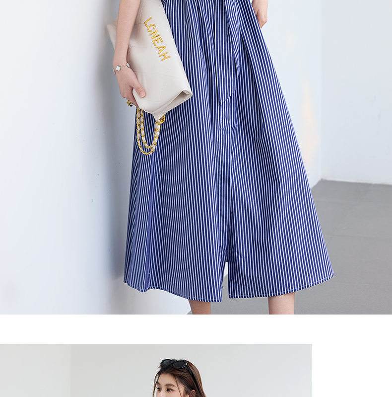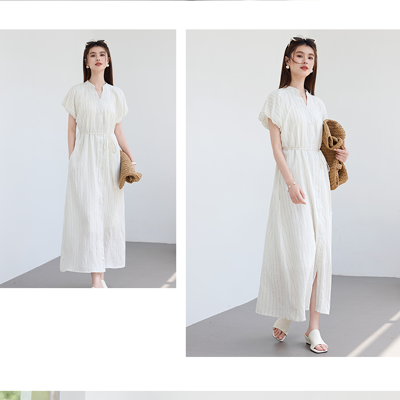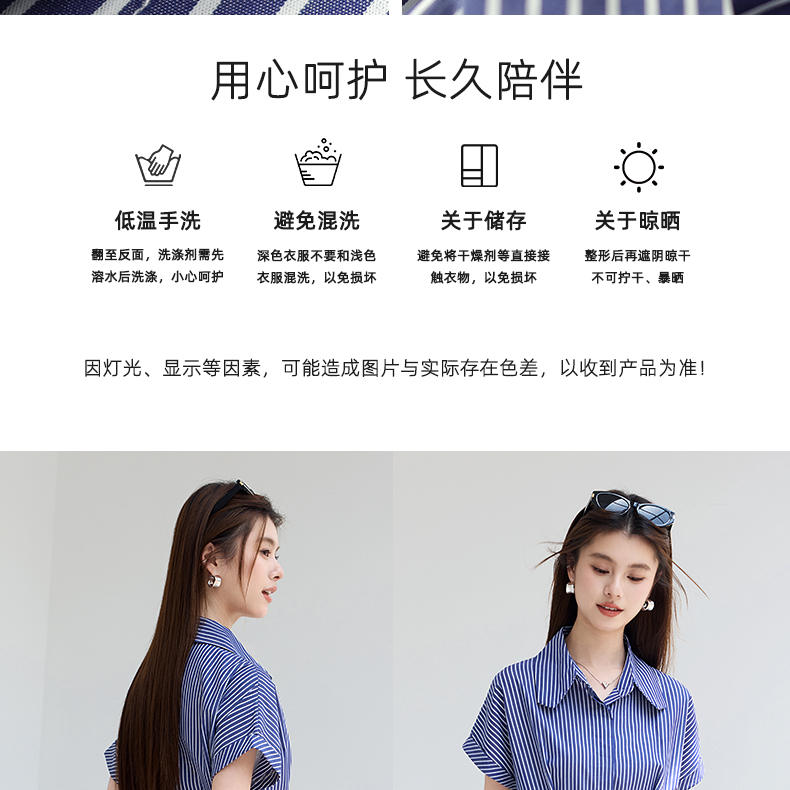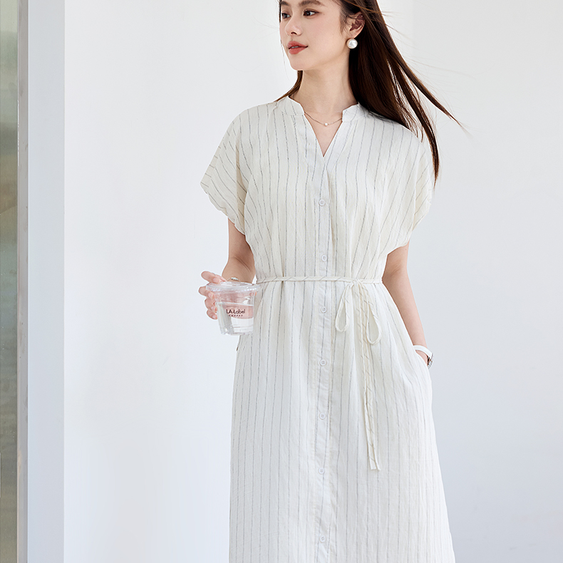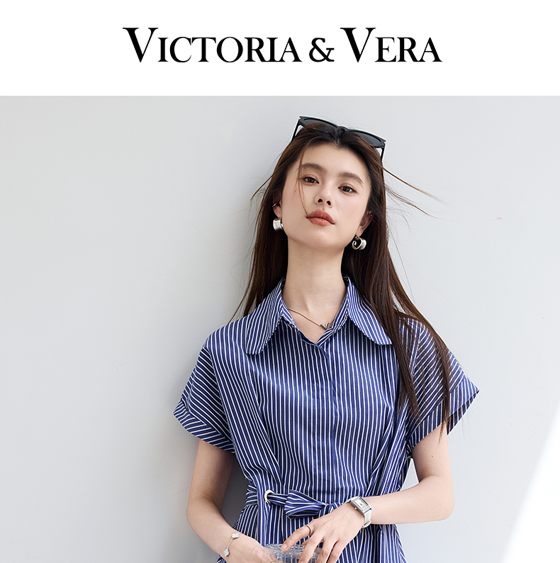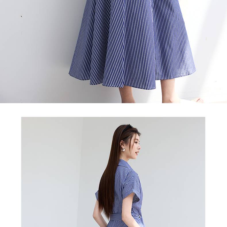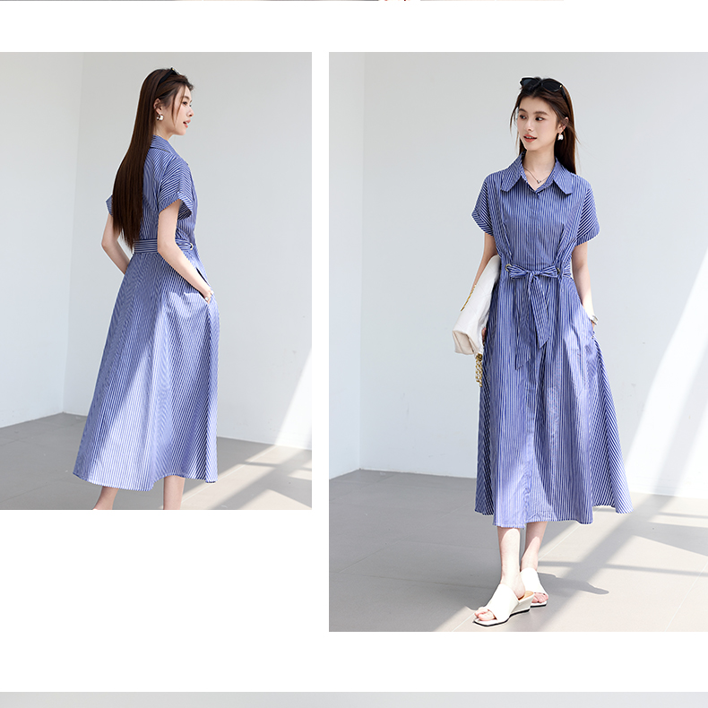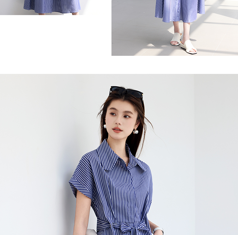 VICTORIA&VERA夏季“蓝屿诗纹”条纹翻领连衣裙中长款绑带收腰短袖气质裙---V9013L07