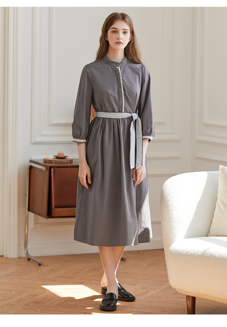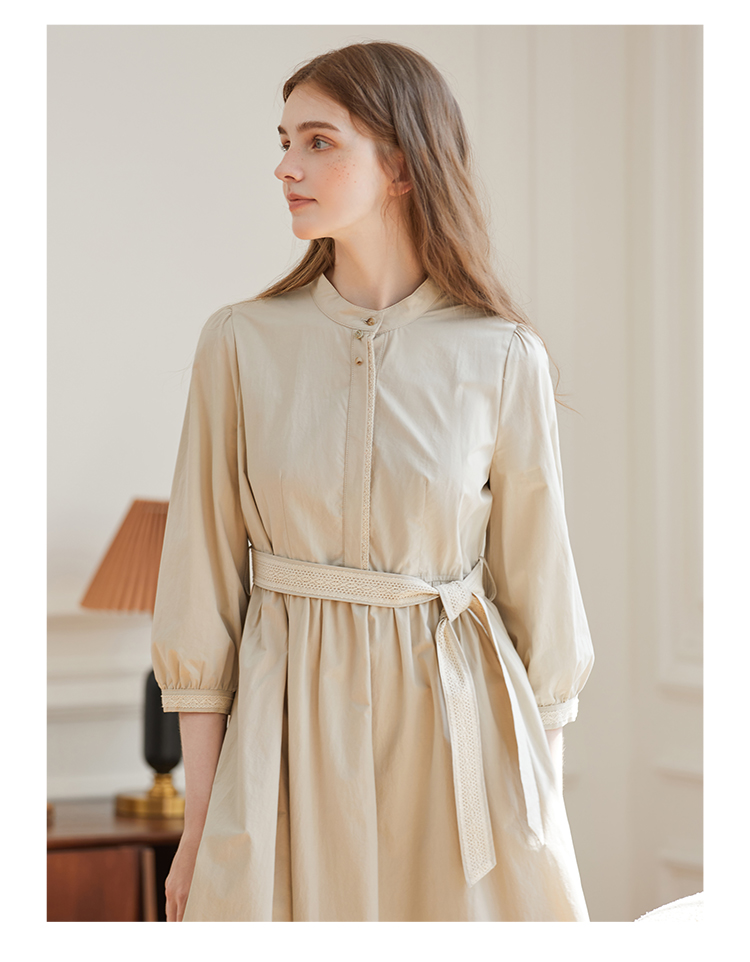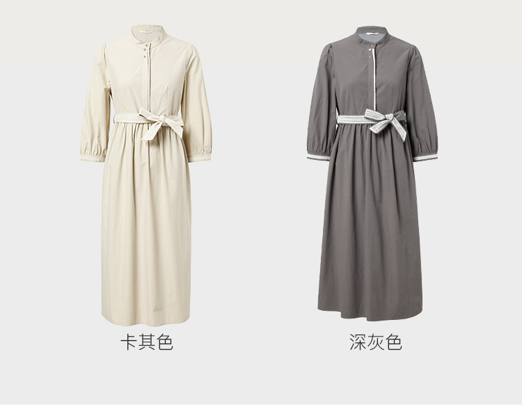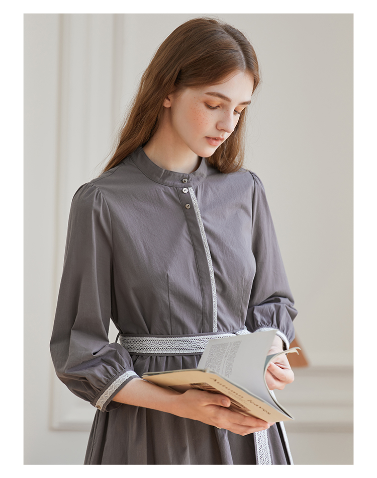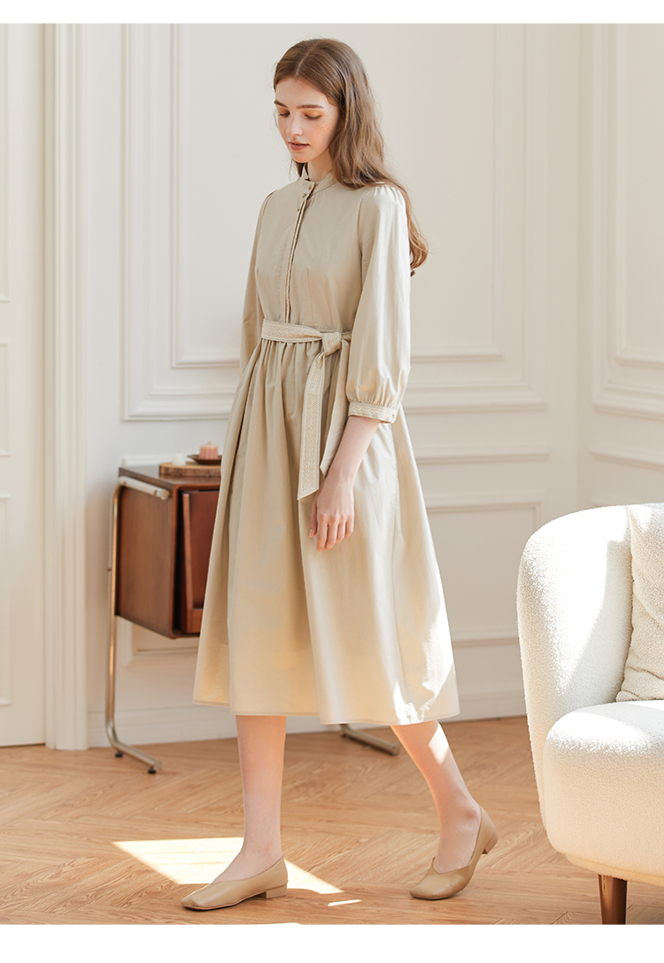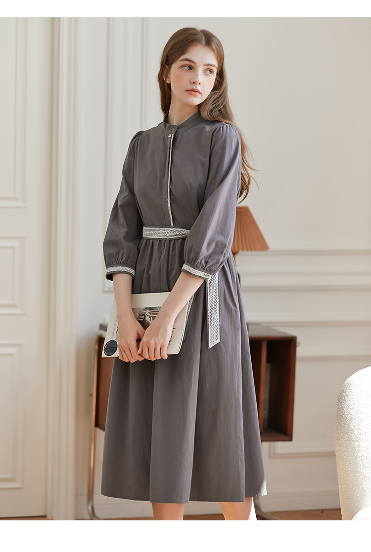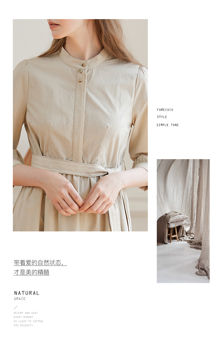 Famecoco范可儿立领极简收腰连衣裙女士秋季收腰花边长款衬衫裙F225FA005