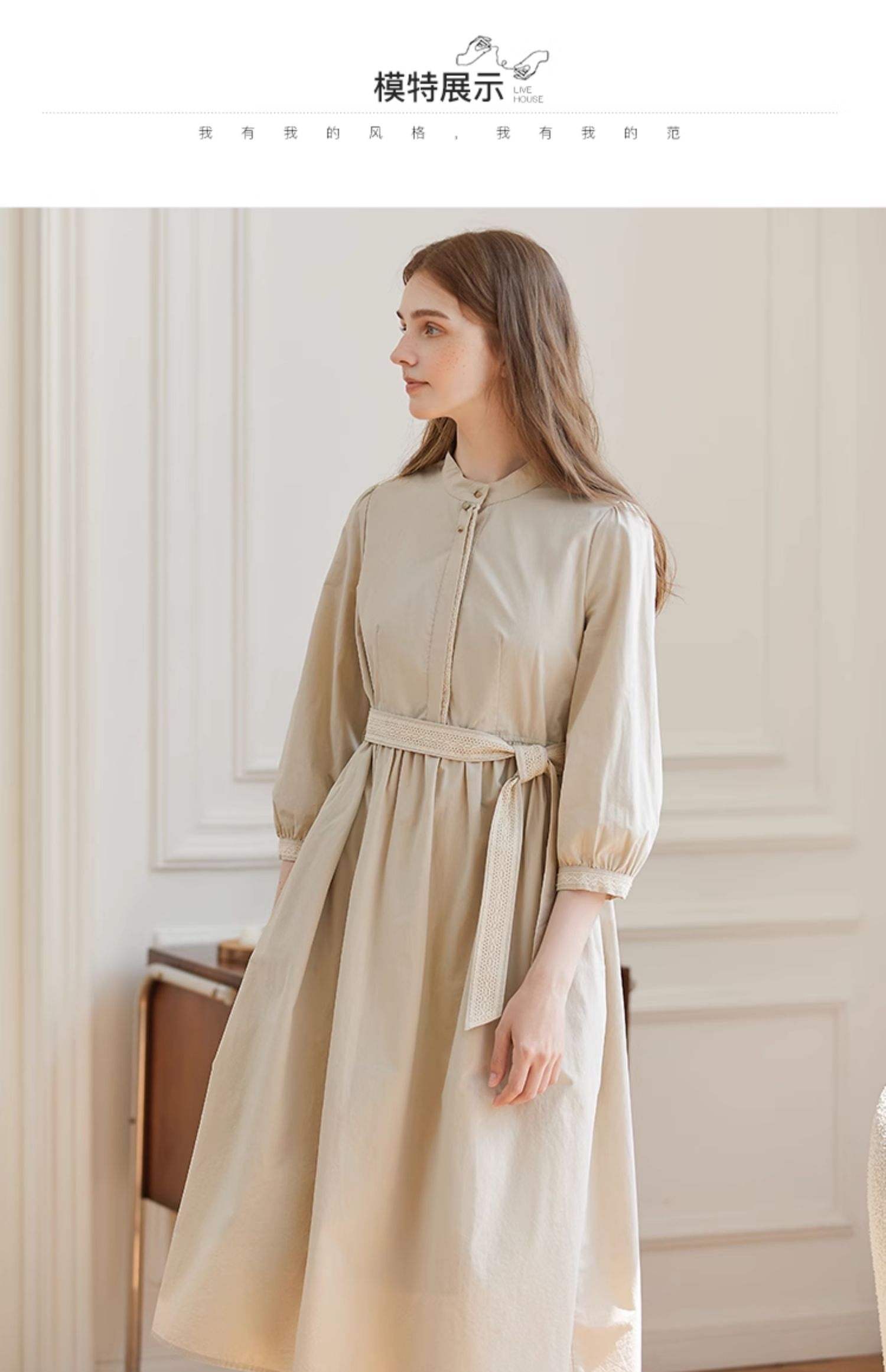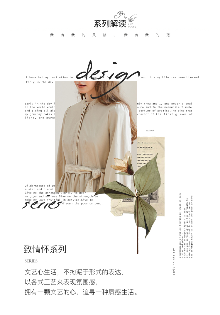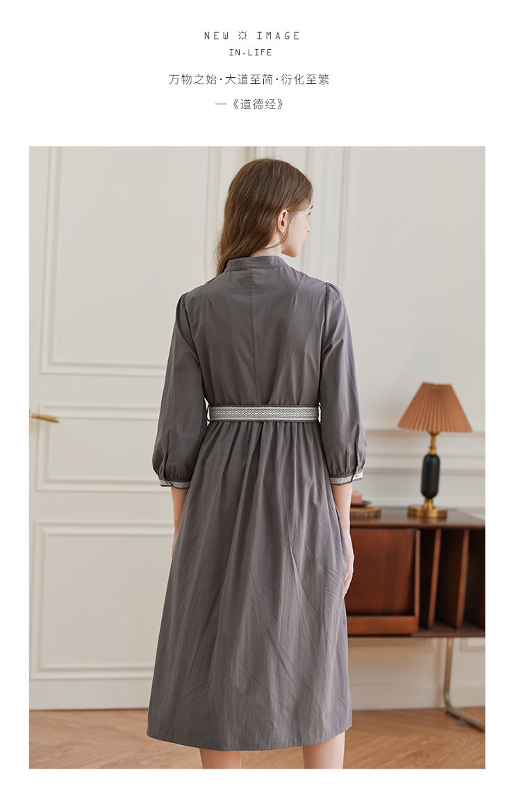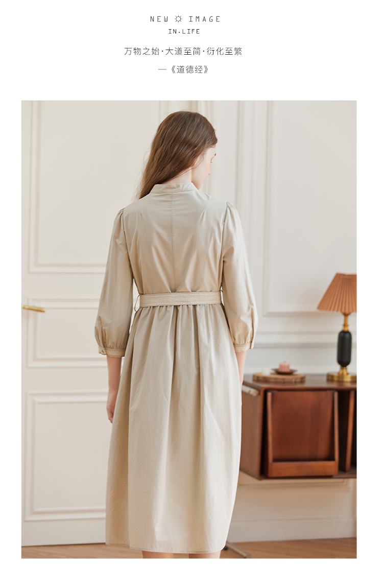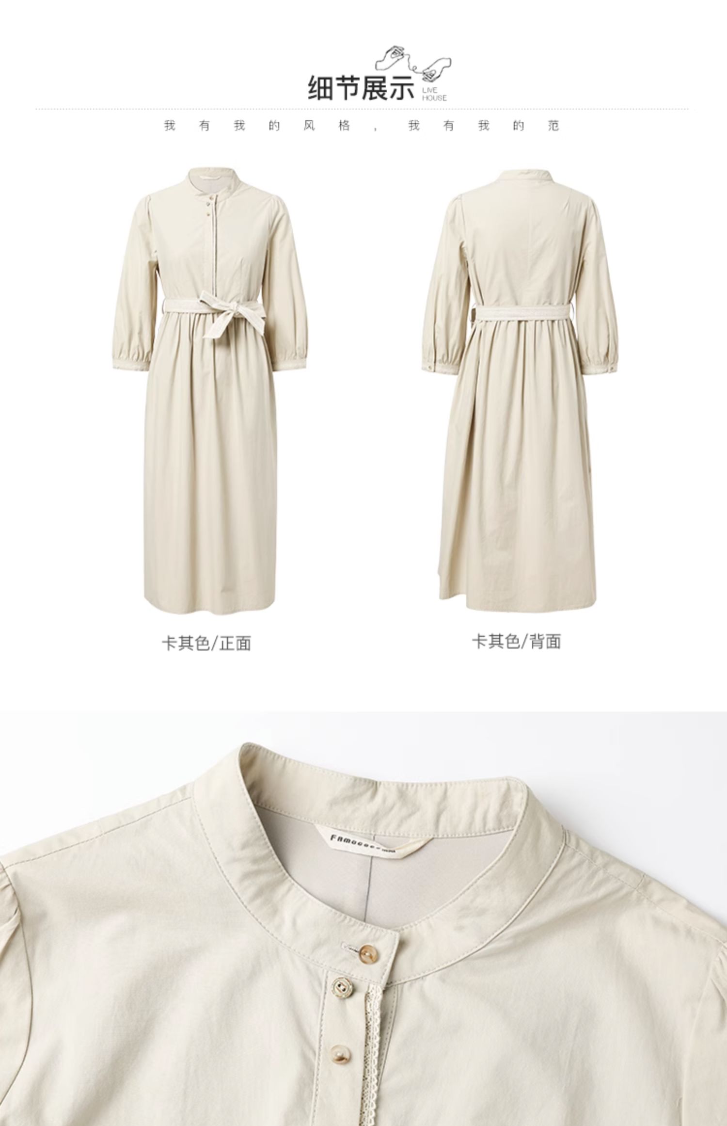 Famecoco范可儿立领极简收腰连衣裙女士秋季收腰花边长款衬衫裙F225FA005