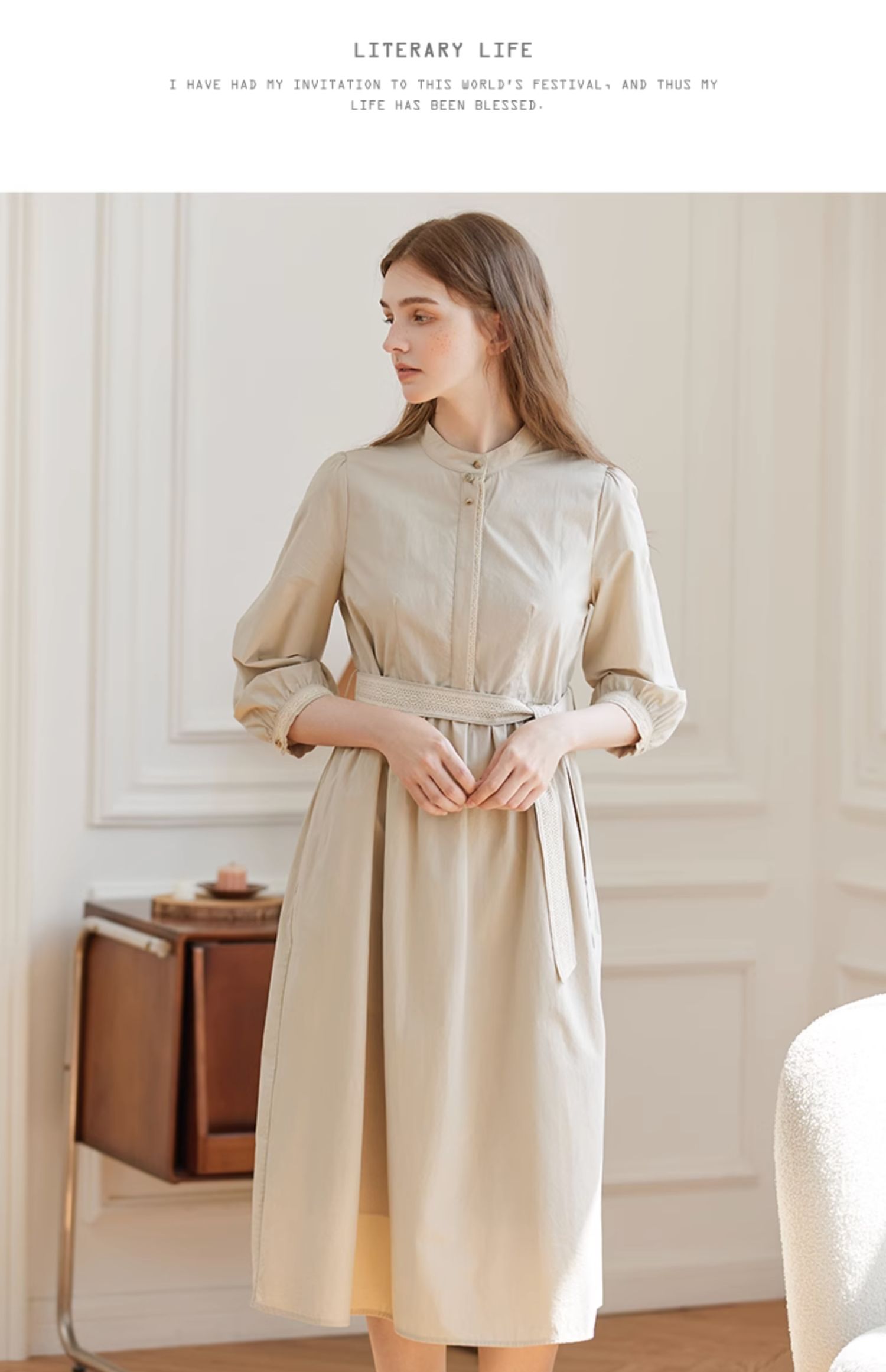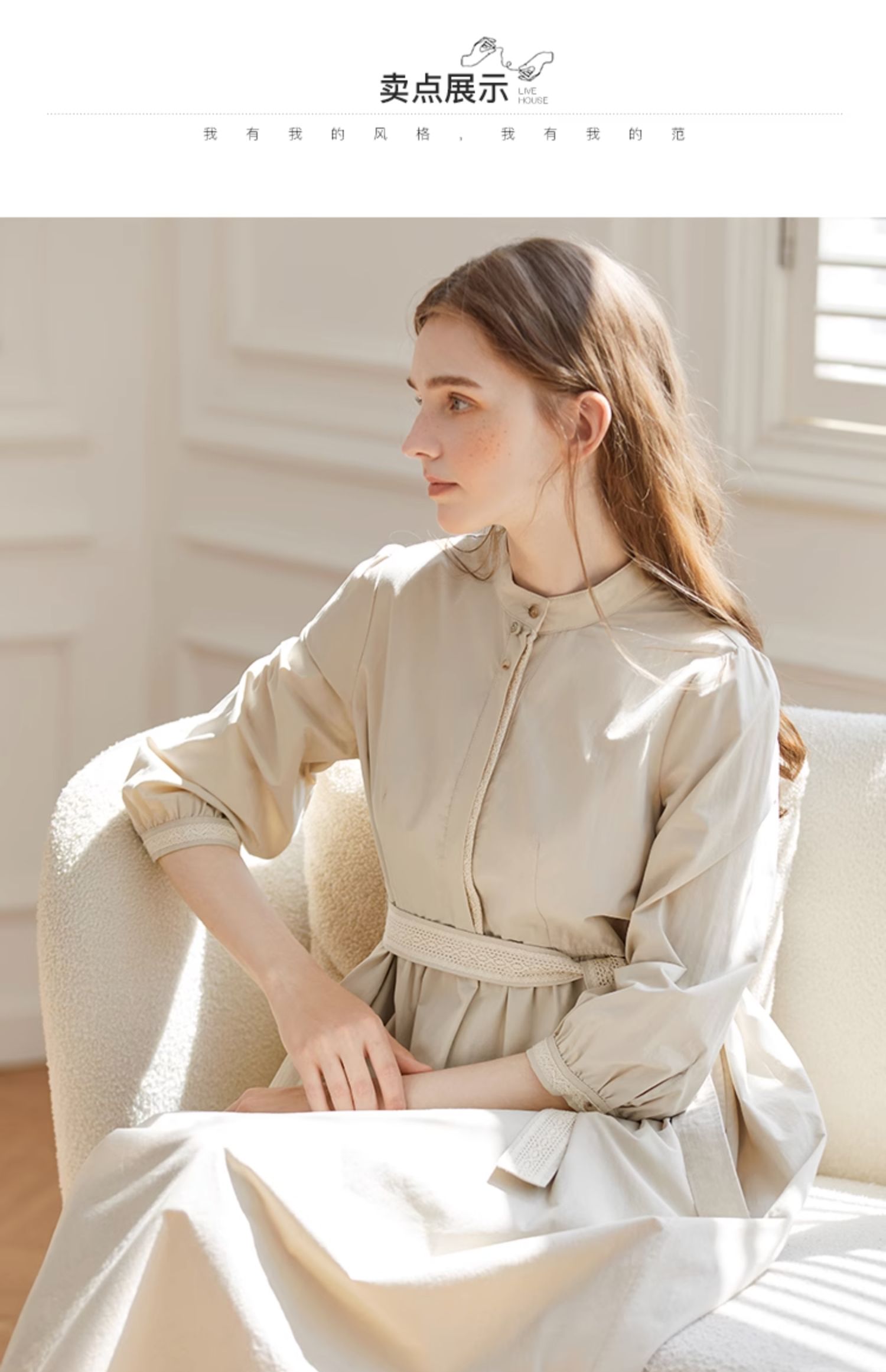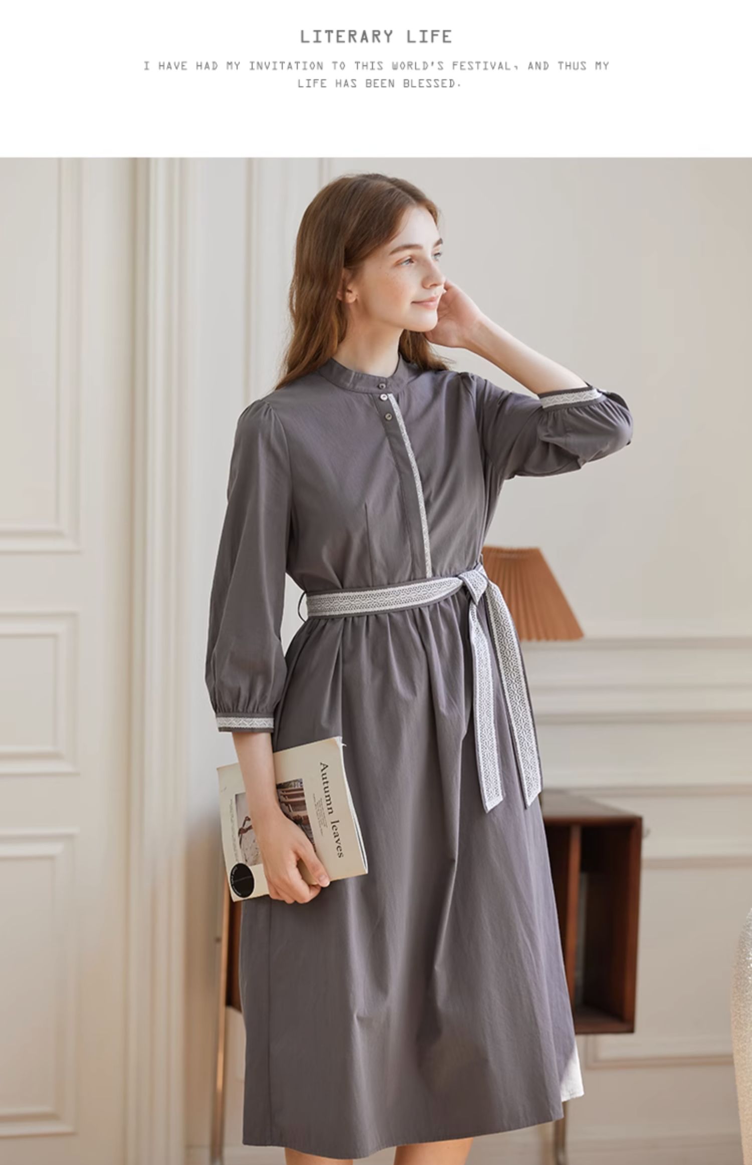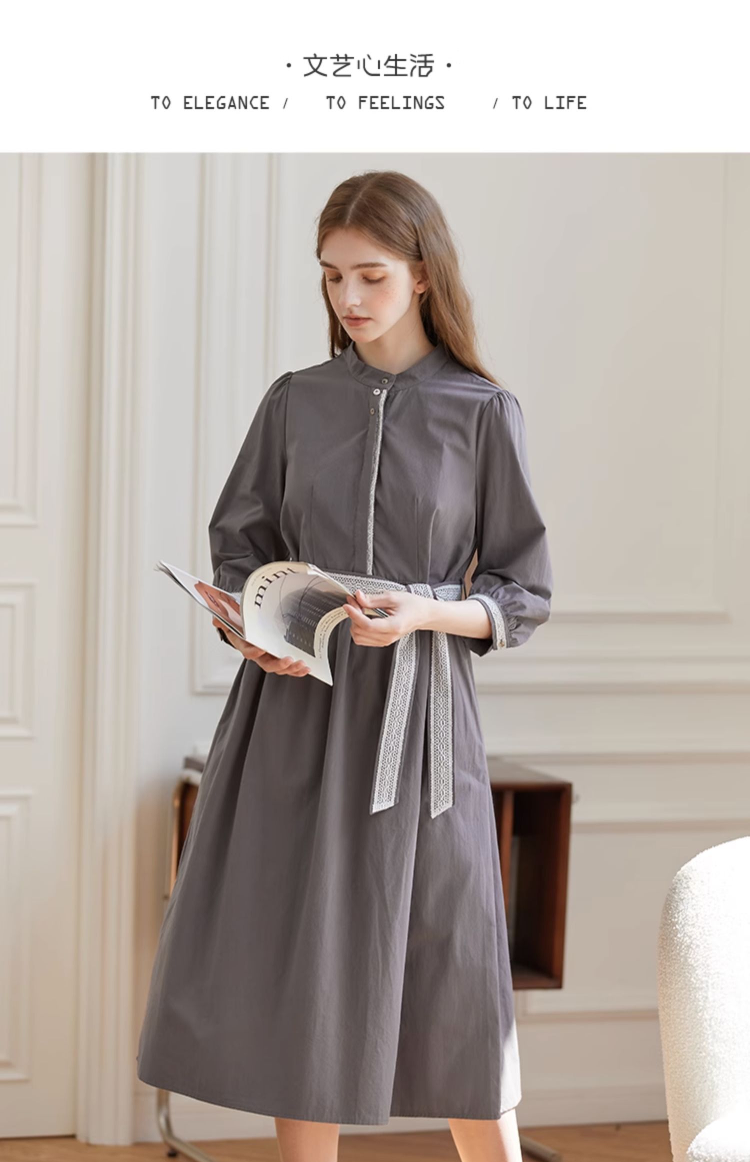 Famecoco范可儿立领极简收腰连衣裙女士秋季收腰花边长款衬衫裙F225FA005
