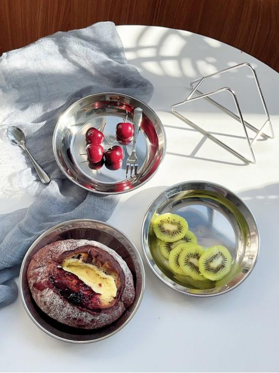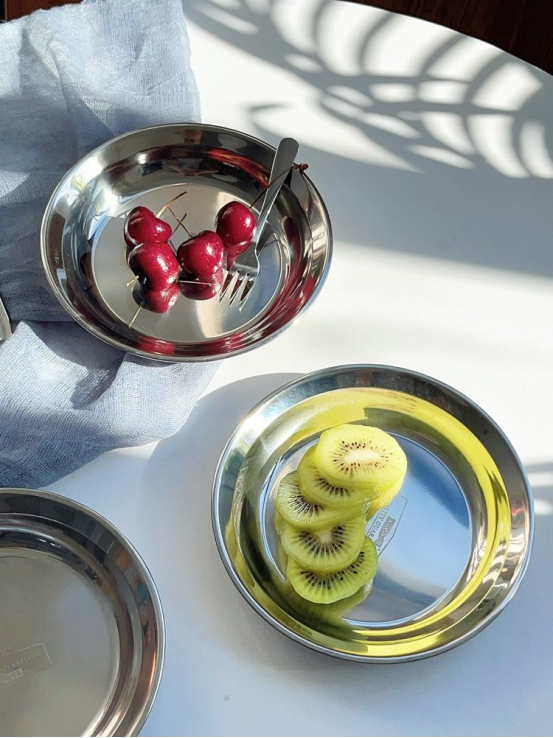 ☑️日常必备 「三餐四季的安心陪伴」 谁懂啊!这款不锈钢圆盘用了半年还跟新的一样✨ 🔴经超声波二次清洗,内里不会发黑!食品级不锈钢材质摸着很厚实,边缘打磨得圆润不划手,洗完水一冲就干净! 🔴晨起装煎蛋不粘油,中午盛糖醋排骨不串味,晚上当水果盘颜值也在线~ 🔴不锈钢不像陶瓷盘怕摔,孩子端着跑也不怕碎,家里有老人小孩的闭眼入,三餐都吃得更安心