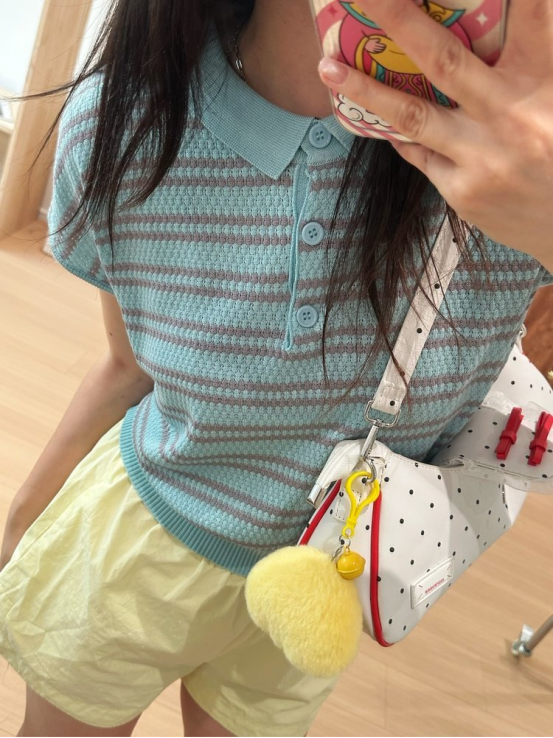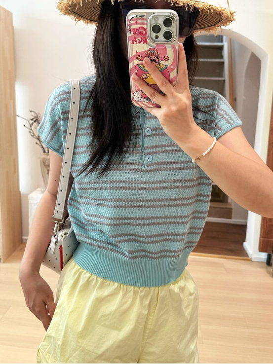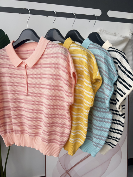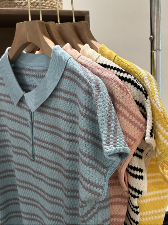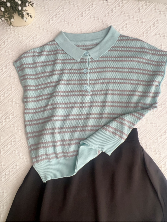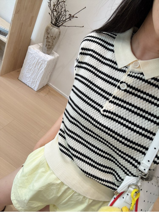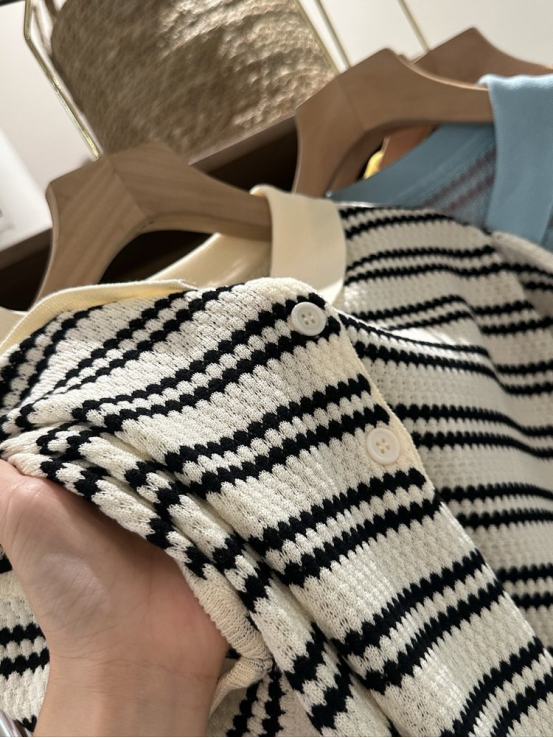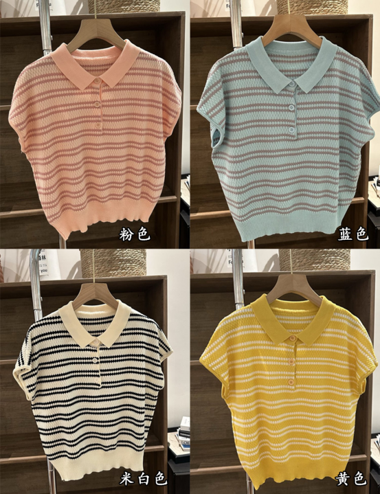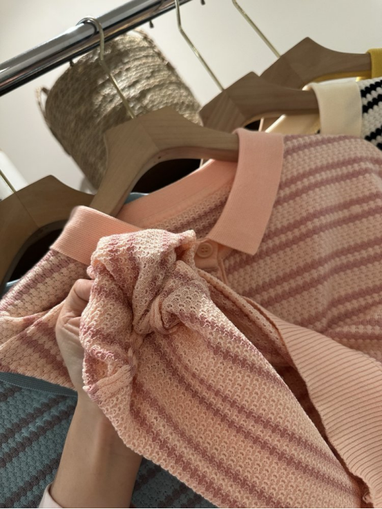 💥【MOMOTIABIN翻领半系扣条纹T恤YMC170】🌻不废话!没有任何套路!💗 韩系小翻领飞飞袖针织衫!✨ 超值!必入啊 宝子们!