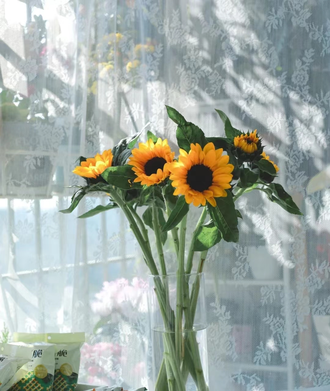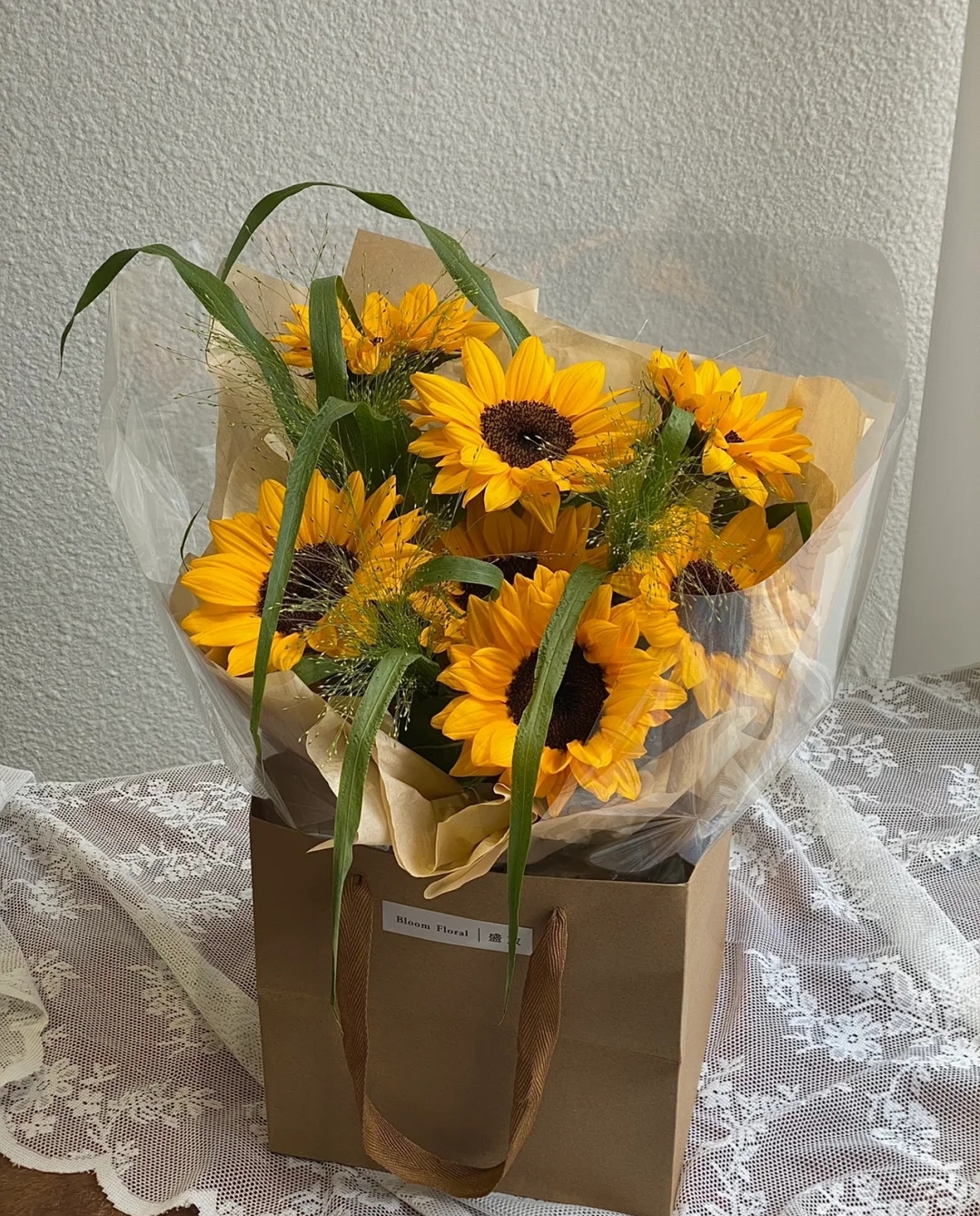 日常拍向日葵也是超级出片的,而且向日葵的花期在超级炎热的夏天,也可以养个7天左右,你也可以像图片这样,搭配一个牛皮纸袋,铺上花泥,搭配点喷泉草,这些叶材,就是好看的一个向日葵花盒了