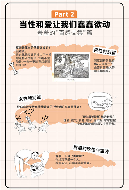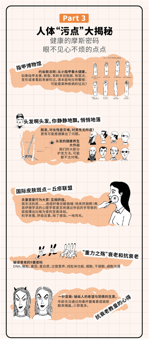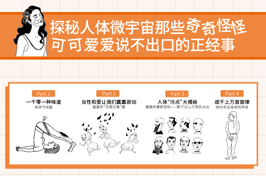 这是一本有关人体私密话题的特辑。本书作者,阿德勒博士,带着一位皮肤科医生的“科学关怀”为我们开启了这个神秘话题。科学与严谨赋予了本书持久的生命力,妙趣横生的文字和幽默诙谐的插图令每一位读者都忍俊不禁、难以释卷。不得不说,这是一本少有的兼具科学性与可读性,能让人在轻松愉悦中一口气读完的医学科普图书。我真的非常好奇,让热情奔放的西方人都感到羞涩的话题,会在含蓄内敛的东方读者心中碰撞出怎样的精彩?