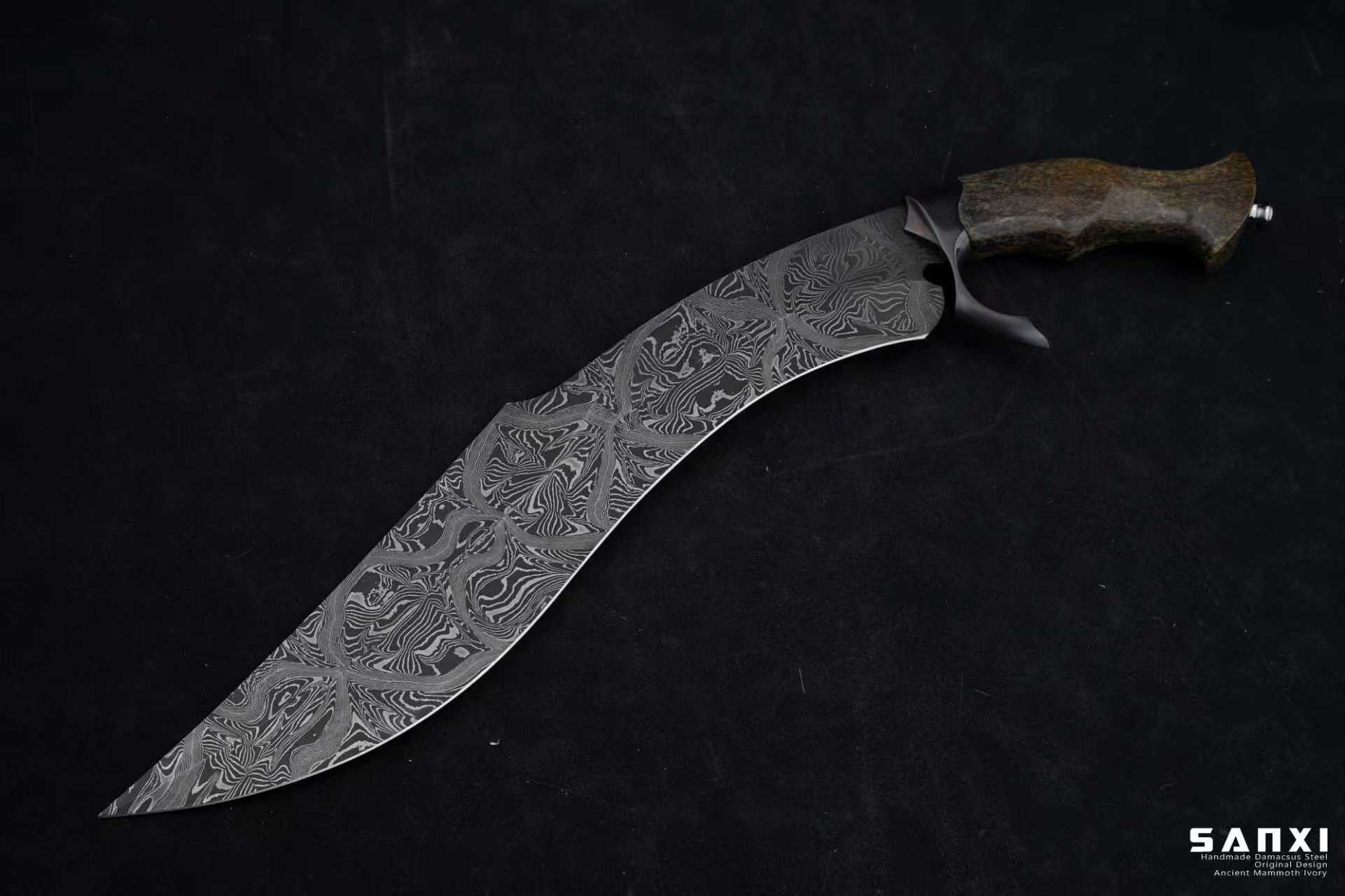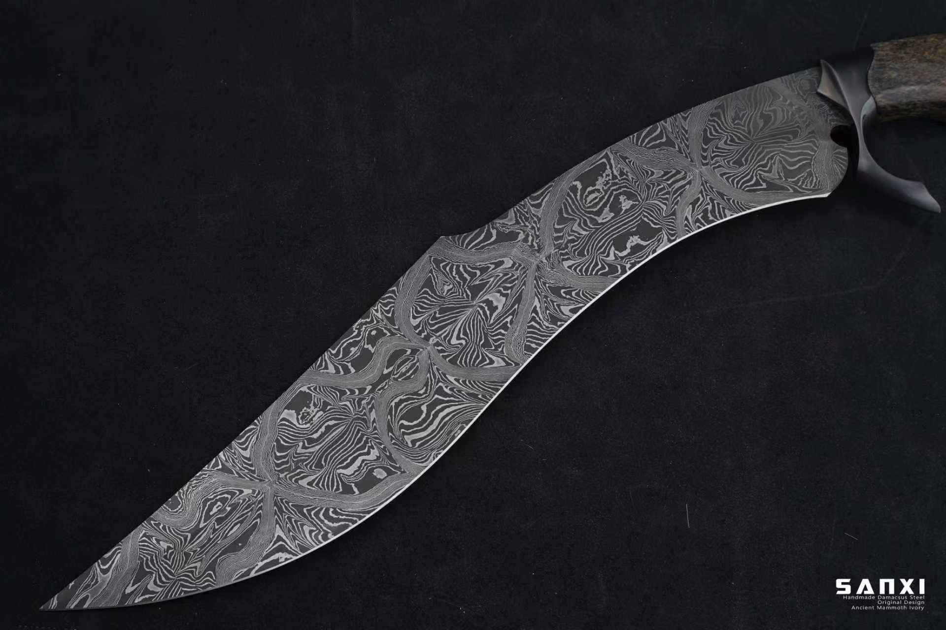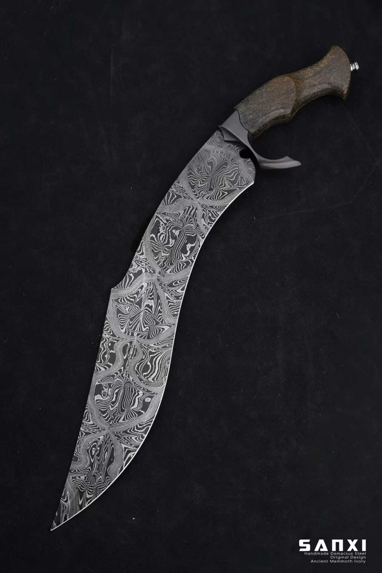 可以根据自己需求定制,这个非常大,特别锻打的加宽加大刀条,用了一块玉化猛犸料,高工师傅全手工打磨,做的比较漂亮