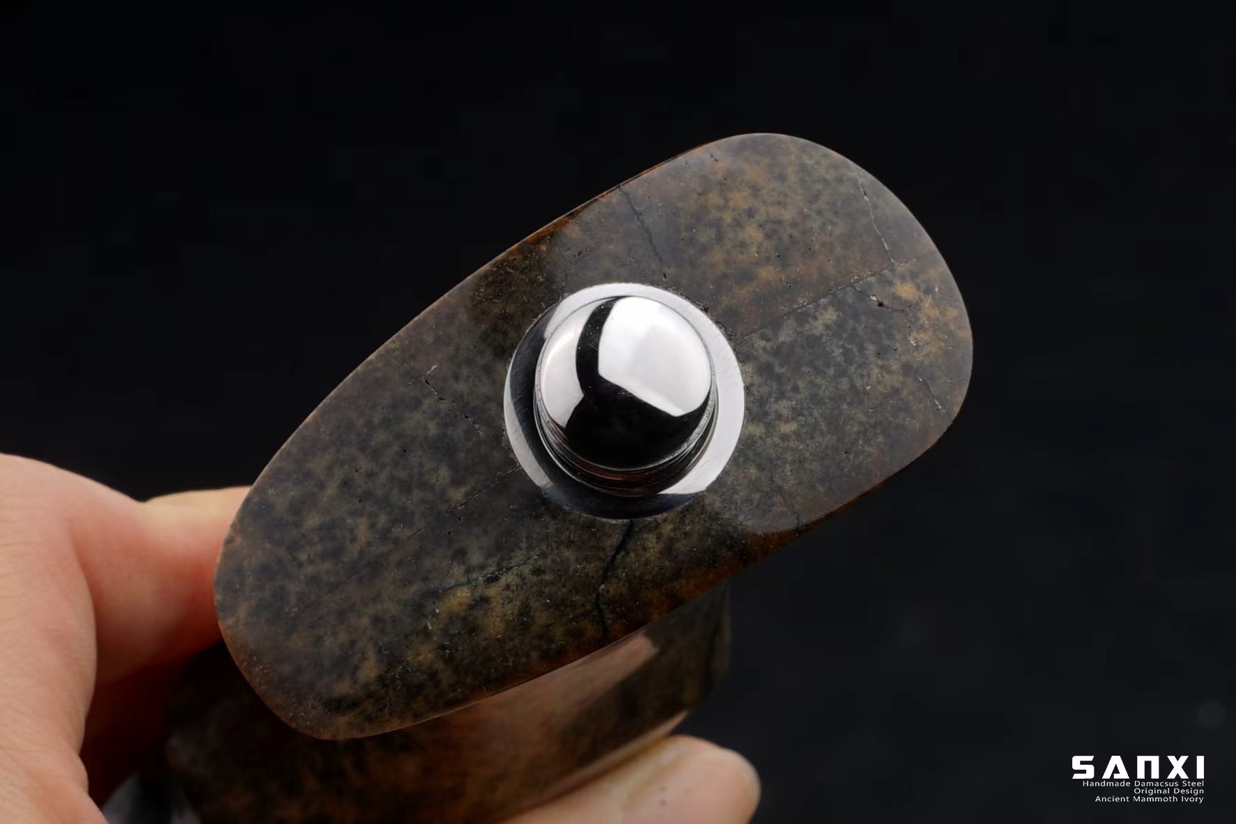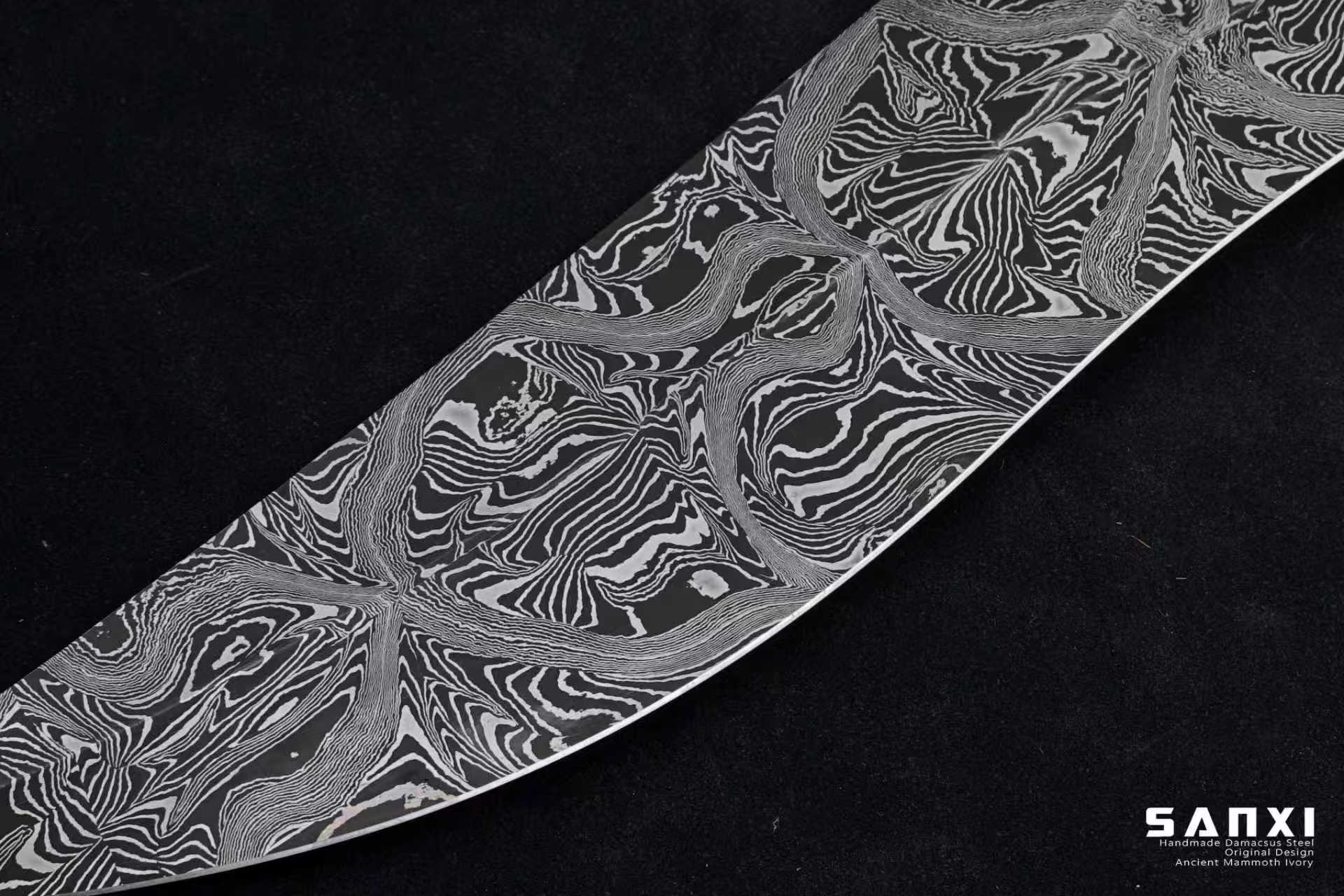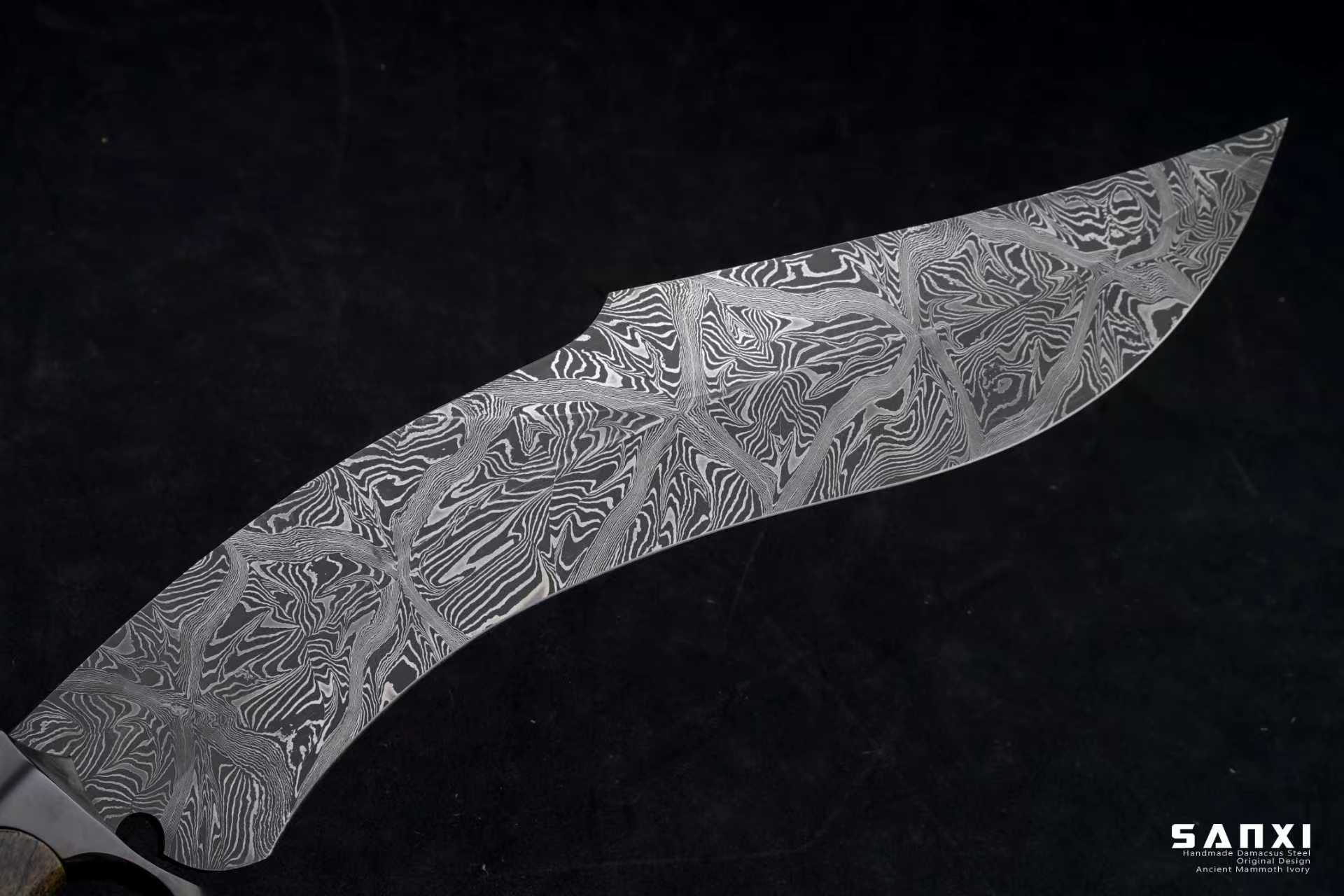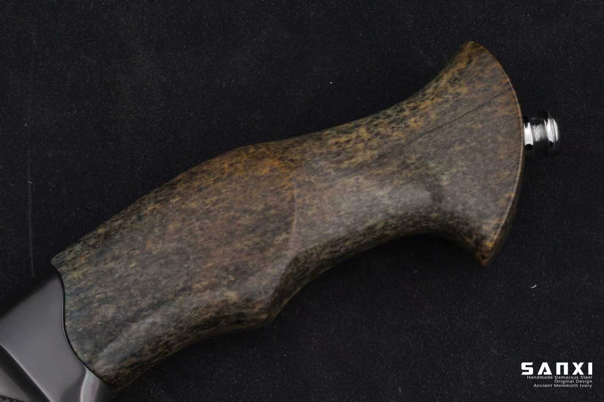 可以根据自己需求定制,这个非常大,特别锻打的加宽加大刀条,用了一块玉化猛犸料,高工师傅全手工打磨,做的比较漂亮