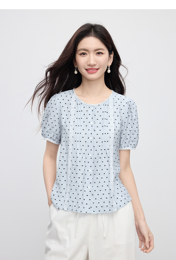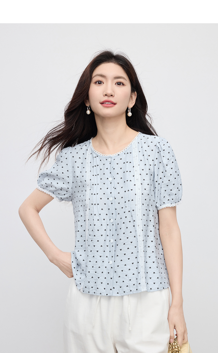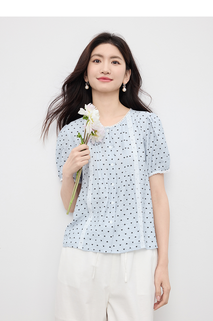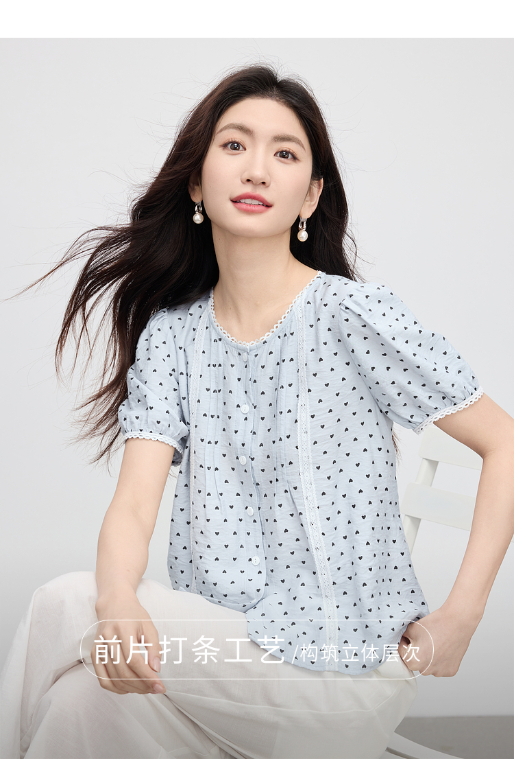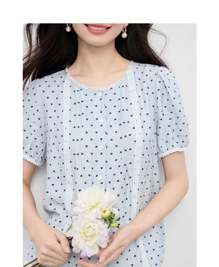 熙世界爱心印花泡泡袖衬衫女夏季设计感小众蕾丝花边圆领气质小衫