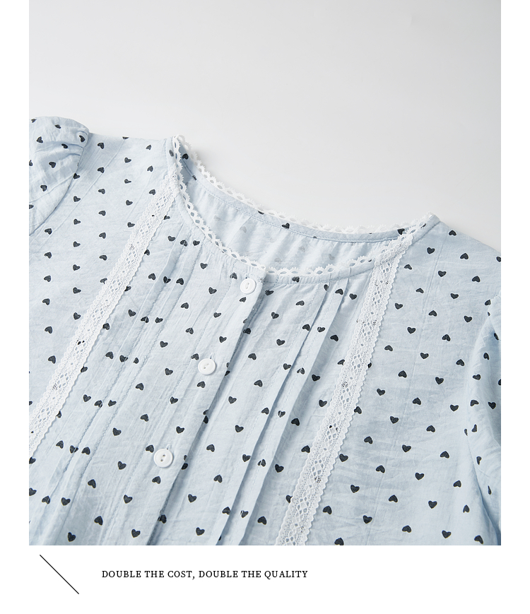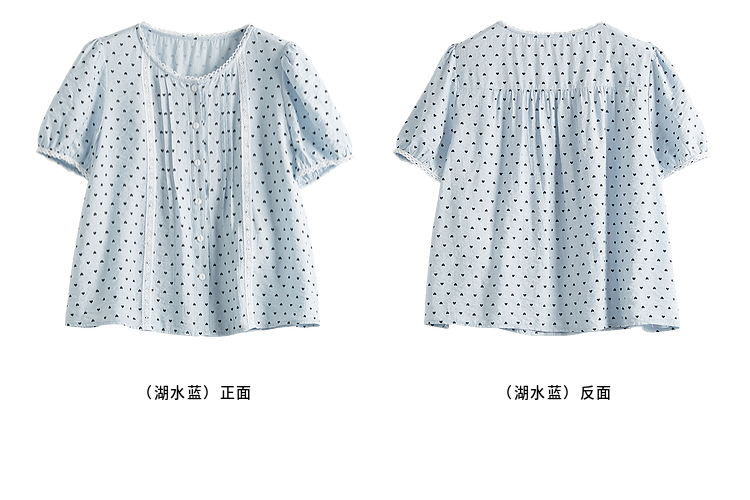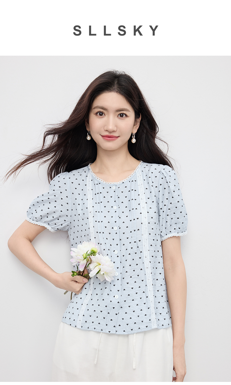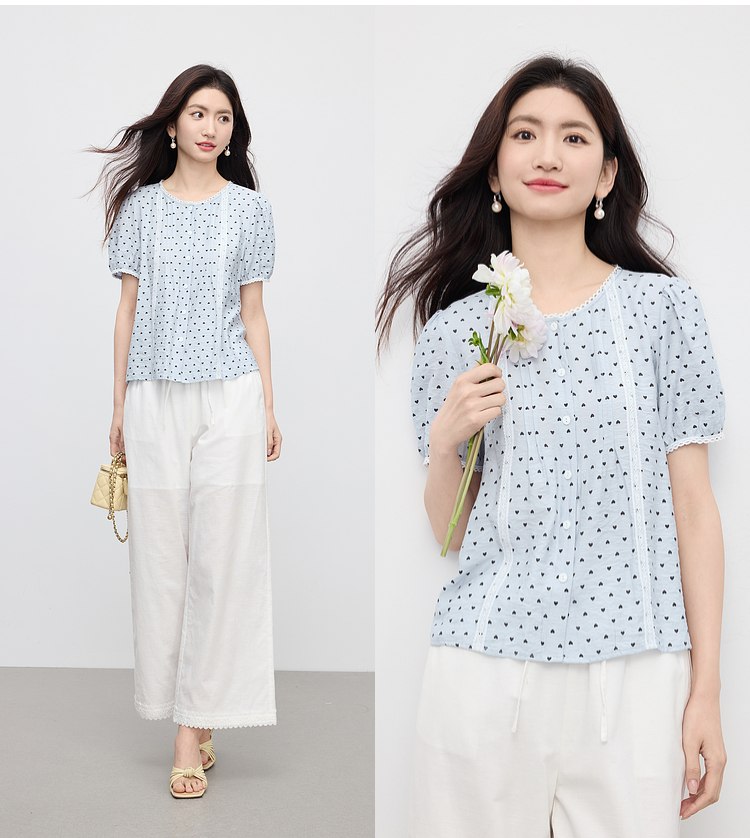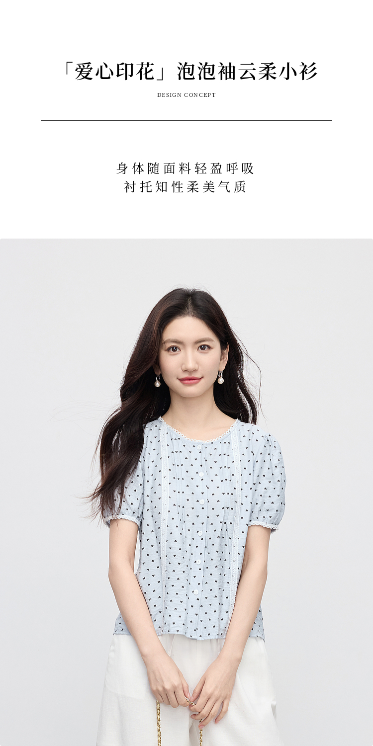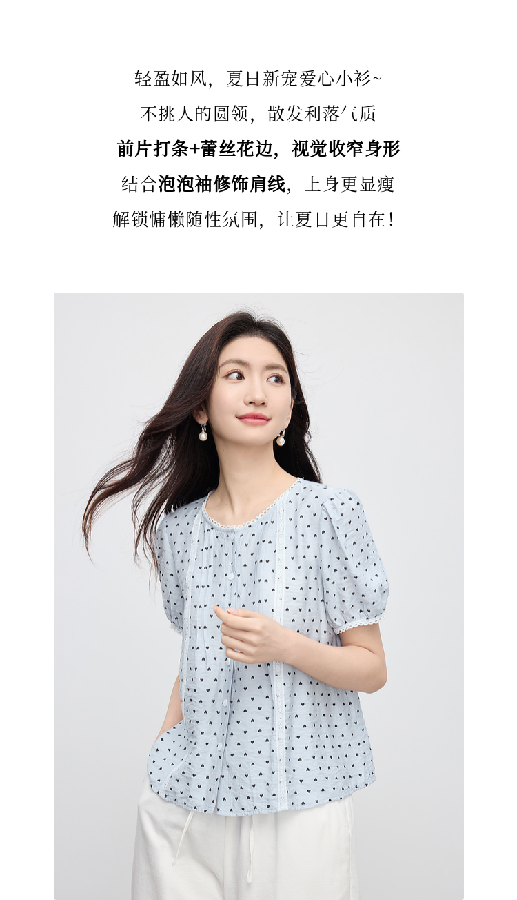 熙世界爱心印花泡泡袖衬衫女夏季设计感小众蕾丝花边圆领气质小衫