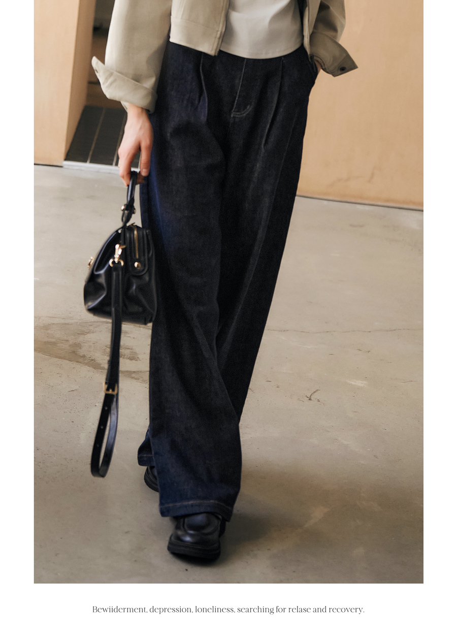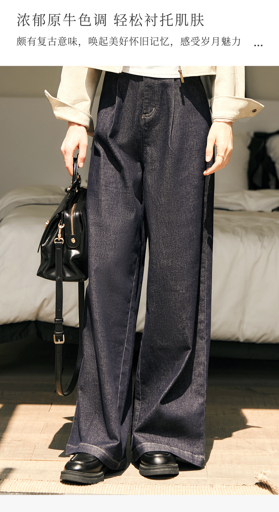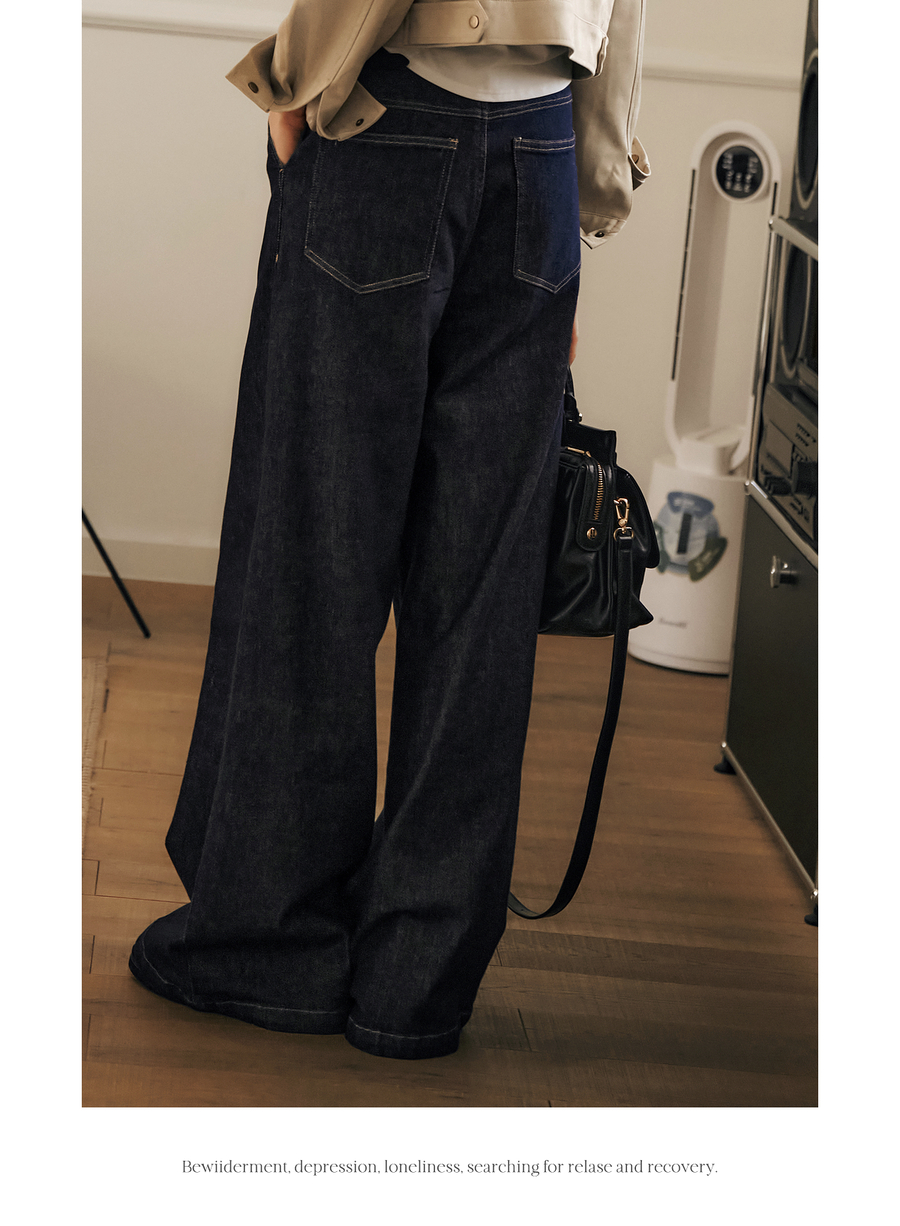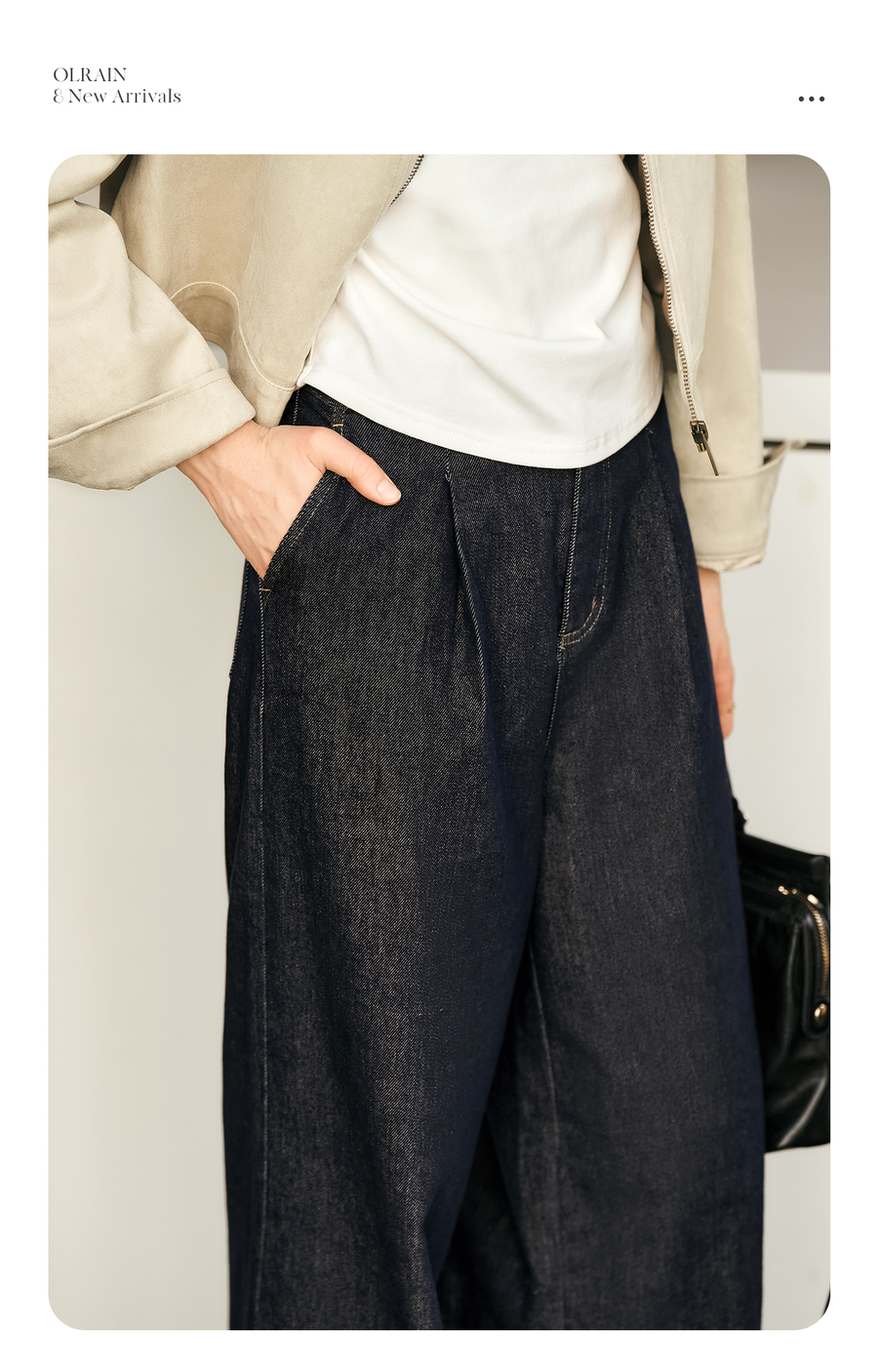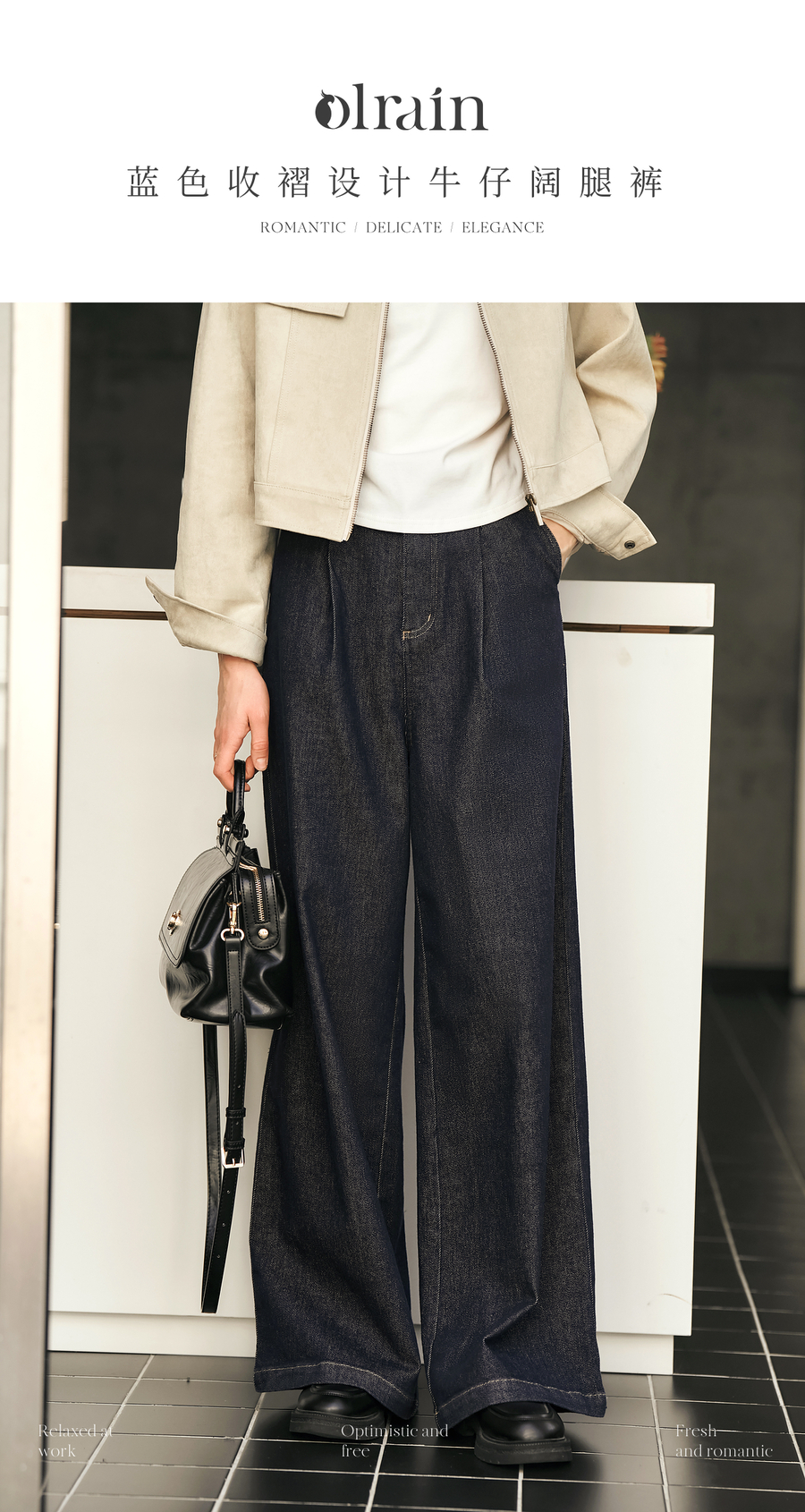 OLrain欧芮儿蓝色牛仔裤女春季2025年新款通勤设计感收褶阔腿裤