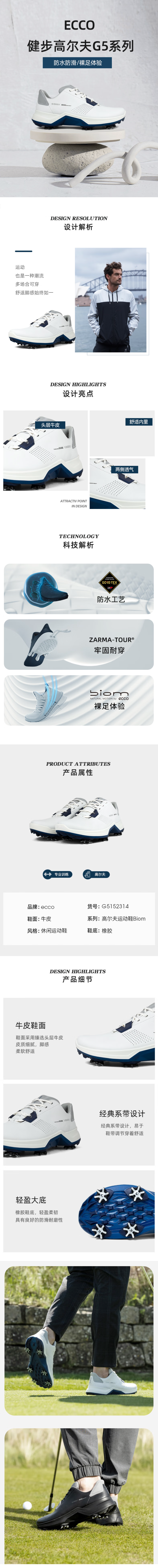 【高尔夫健步G5】ECCO爱步男子高尔夫球鞋 有钉152314透气排湿软弹
