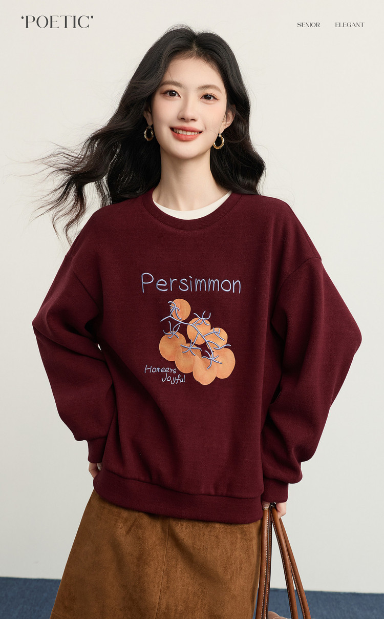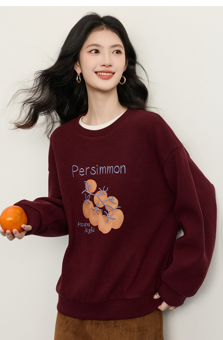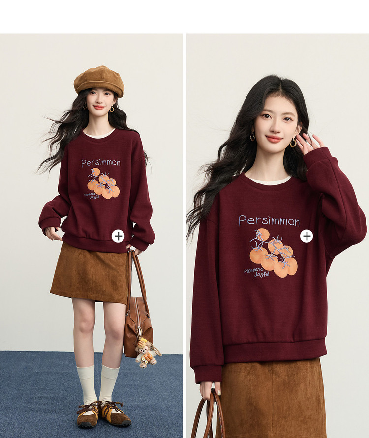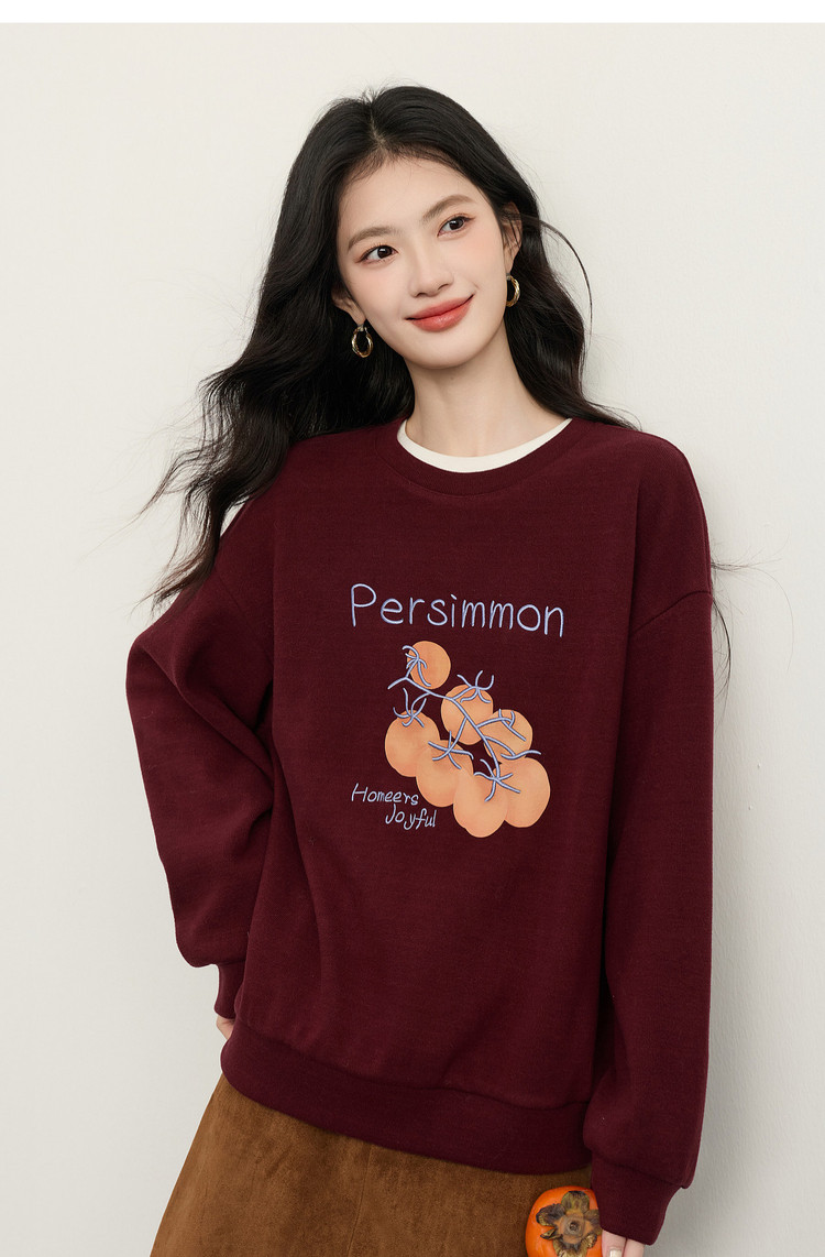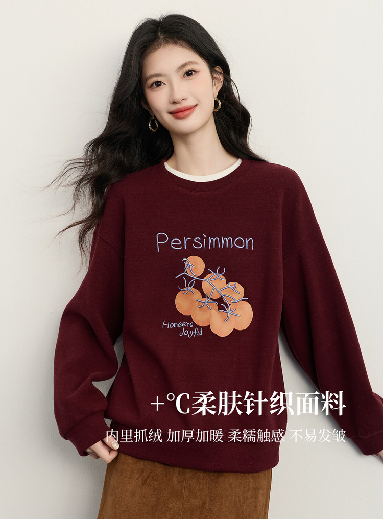 【12/31新品】熙世界【柿柿如意】印花加绒卫衣卫衣女款冬季加厚慵懒风圆领上衣