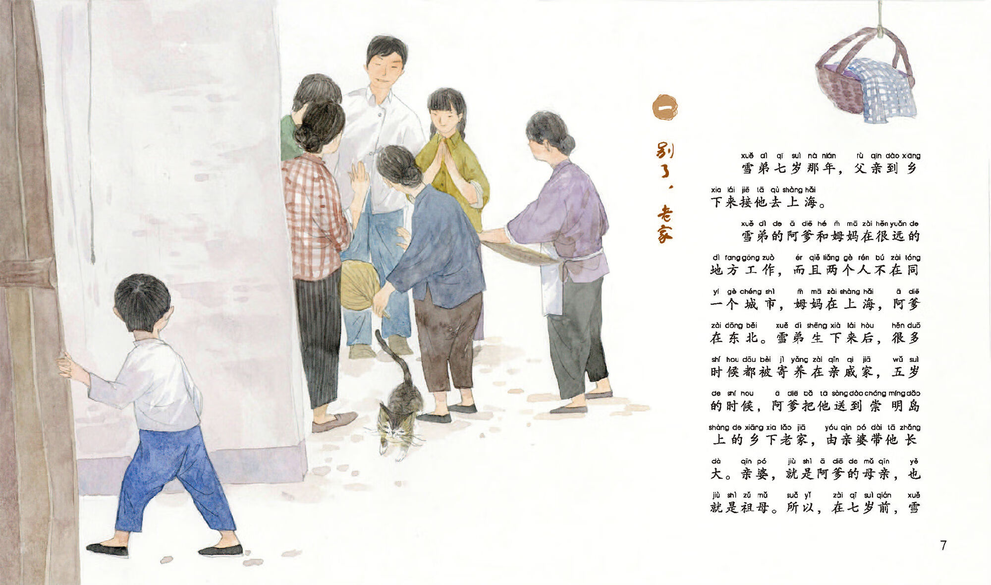 阿爹告诉雪弟,这两个男孩是隔壁家的孩子,他们知道雪弟要来上海住,都很好奇。小胖子叫牛加亮,小孩都叫他牛嘎糖,住在楼下亭子间。小个子住在雪弟家隔壁,名叫米峰,小孩喜欢叫他小蜜蜂。