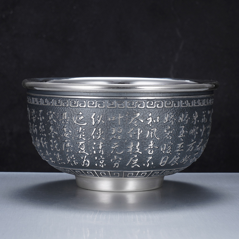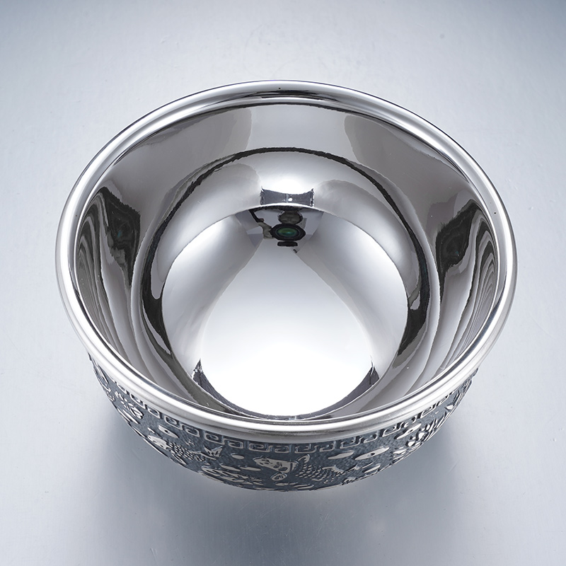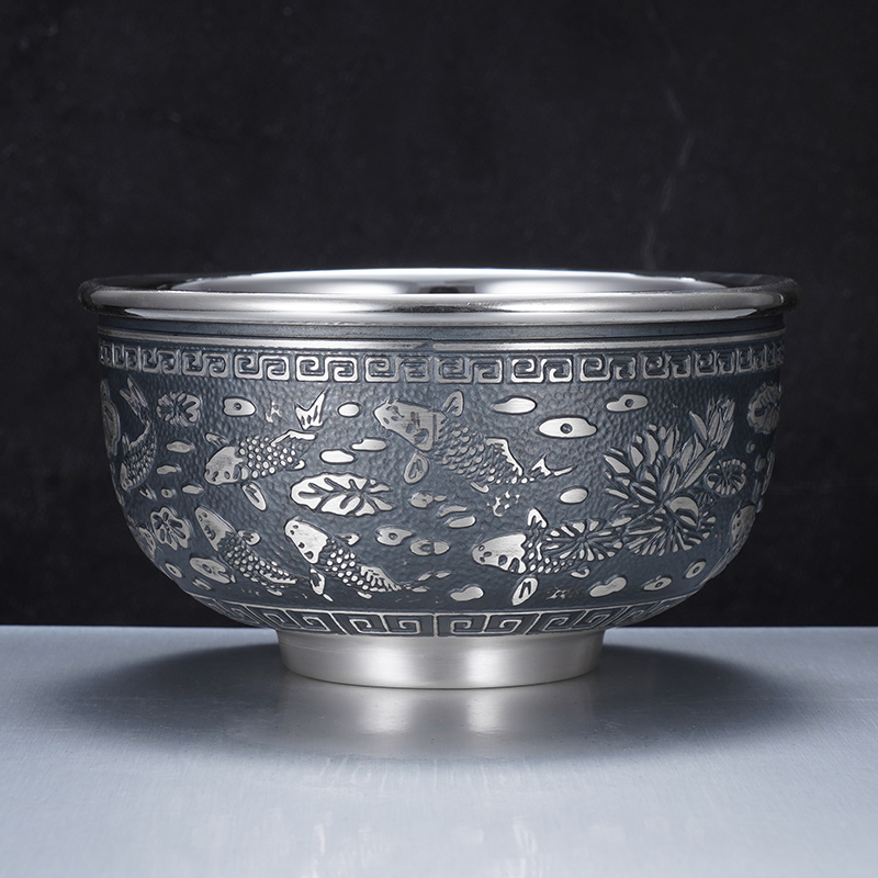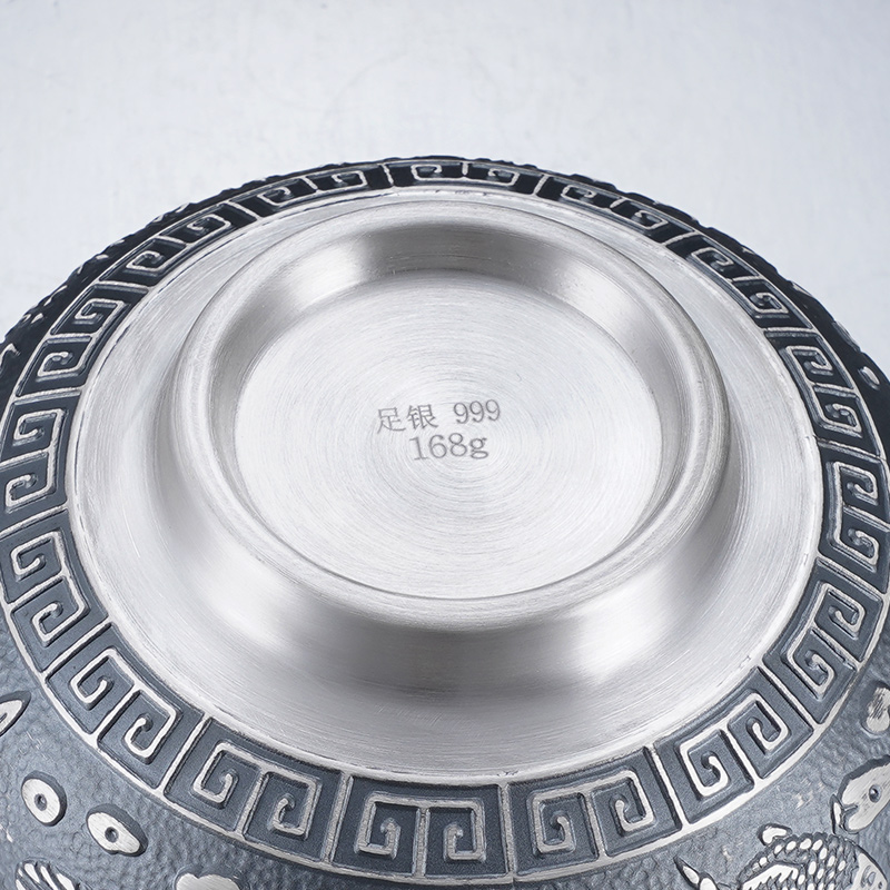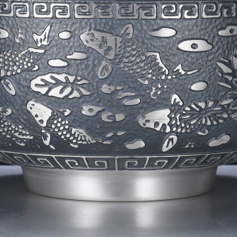 【寓意】:腊八节至,佳肴还需配美器。“年年有余”银碗,精选足银打造,运用錾刻仿古工艺,塑造一幅生机盎然的荷塘盛景,寄予着年年有余、富贵吉祥的美好愿景。