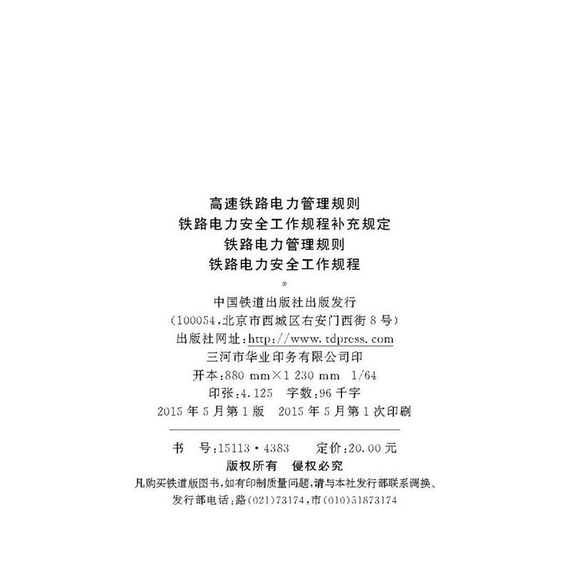 15113.4383高速铁路电力管理规则 铁路电力安全工作规程补充规定 铁路电力管理规则 铁路电力安全工作规程