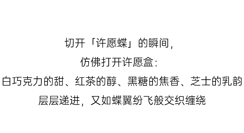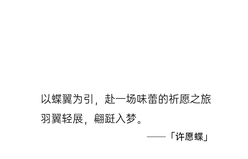 “以蝶翼为引,赴一场味蕾的祈愿之旅 羽翼轻展,翩跹入梦。”