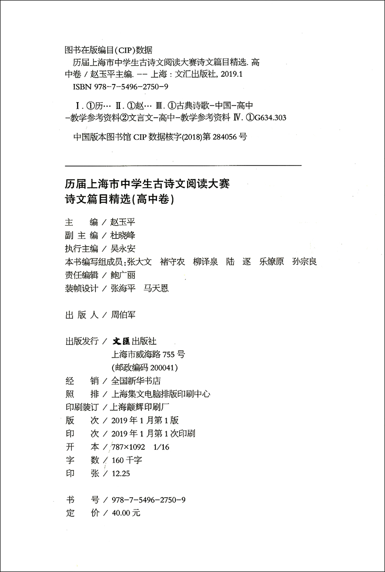 历届上海市中学生古诗文阅读大赛诗文篇目精选(高中卷)赵玉平编 古诗词鉴赏赏析 文言文阅读高中语文学习教辅 文汇出版社