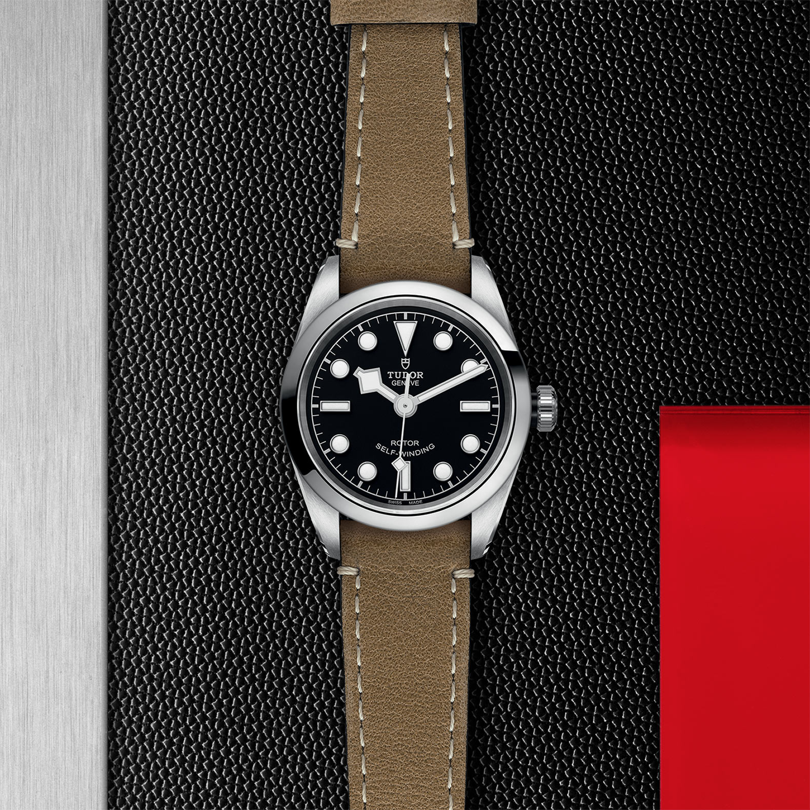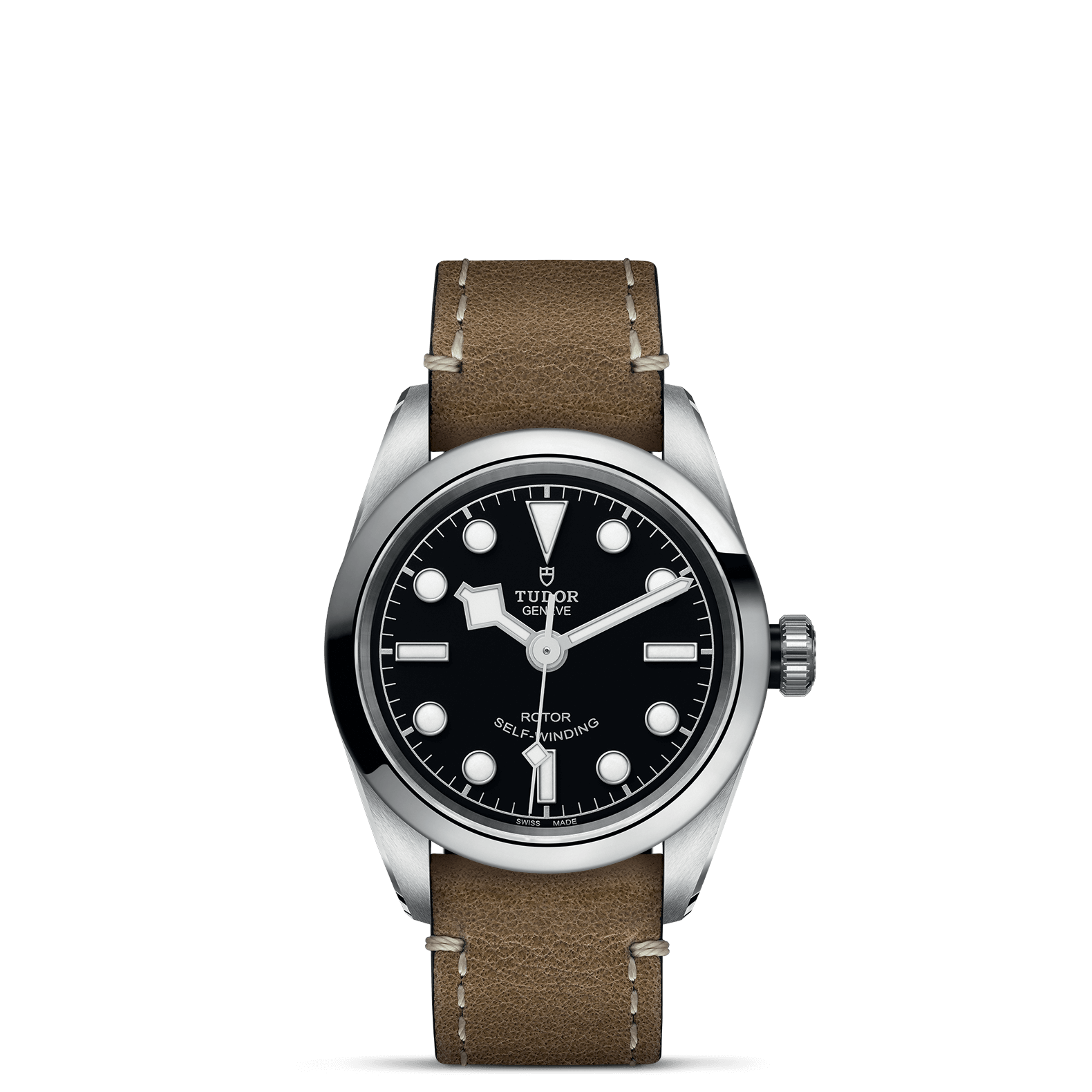 不锈钢旋入式上链表冠,饰以浮雕帝舵表玫瑰标志,配黑色阳极氧化铝上链表冠轴