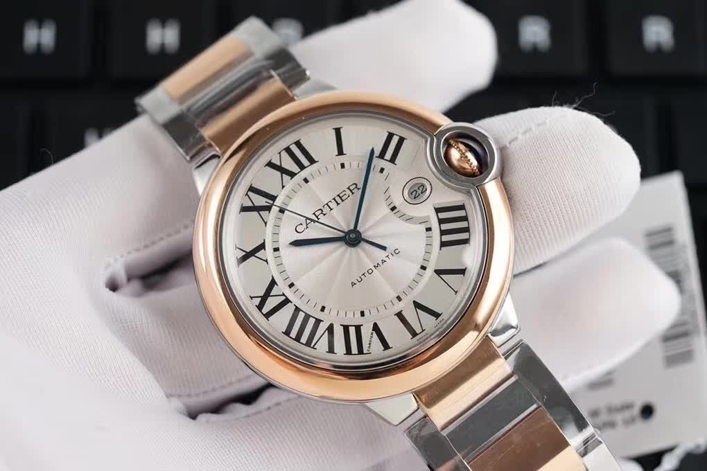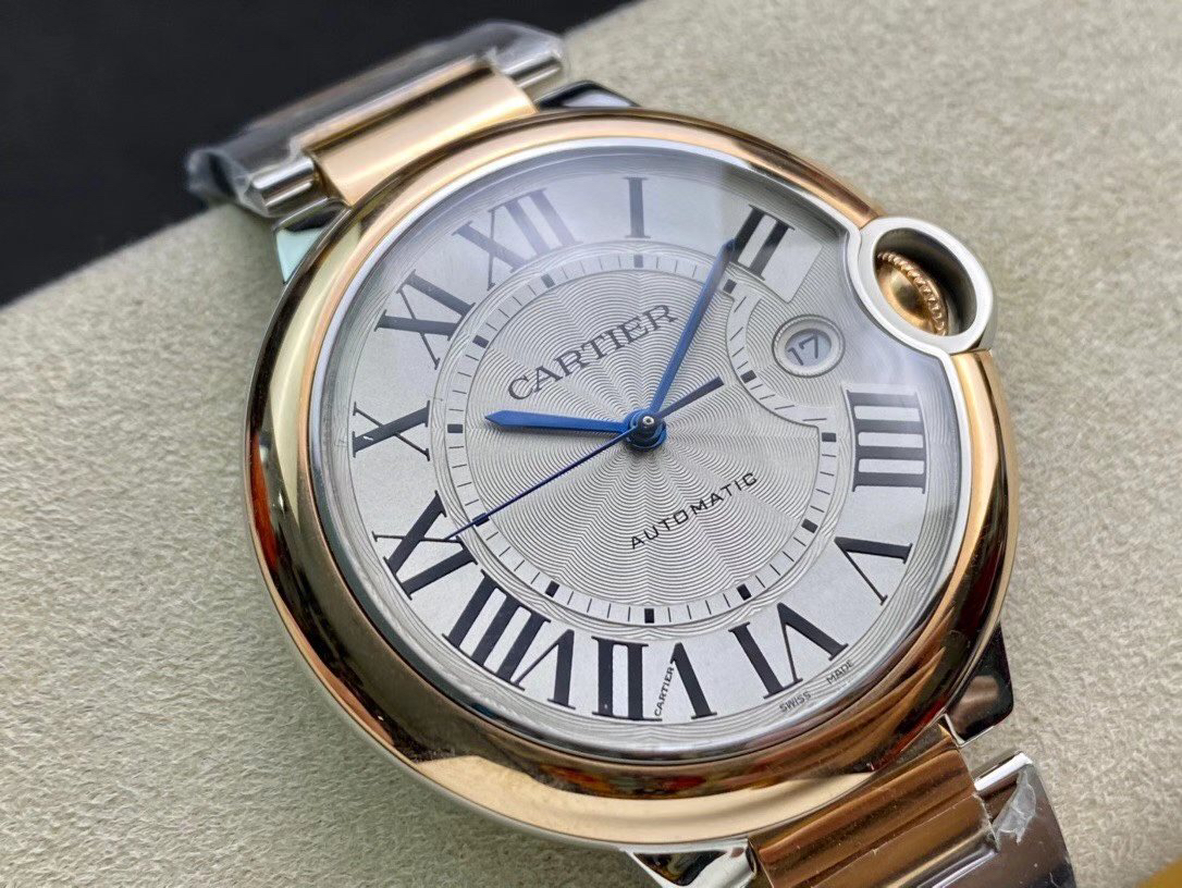 Ballon Bleu de Cartier卡地亚蓝气球腕表,42毫米表款,市面top级2824精制自动上链机械机芯。精钢表壳,玫瑰金表圈,玫瑰金凹槽式表冠,镶嵌一颗凸圆形合成尖晶石。镀银雕纹阳光射线纹饰漆面表盘。剑形蓝钢指针。蓝宝石水晶镜面。玫瑰金与精钢表链。手腕尺寸:180毫米。表壳厚度:13毫米。防水深度3巴(约30米/100英尺)。