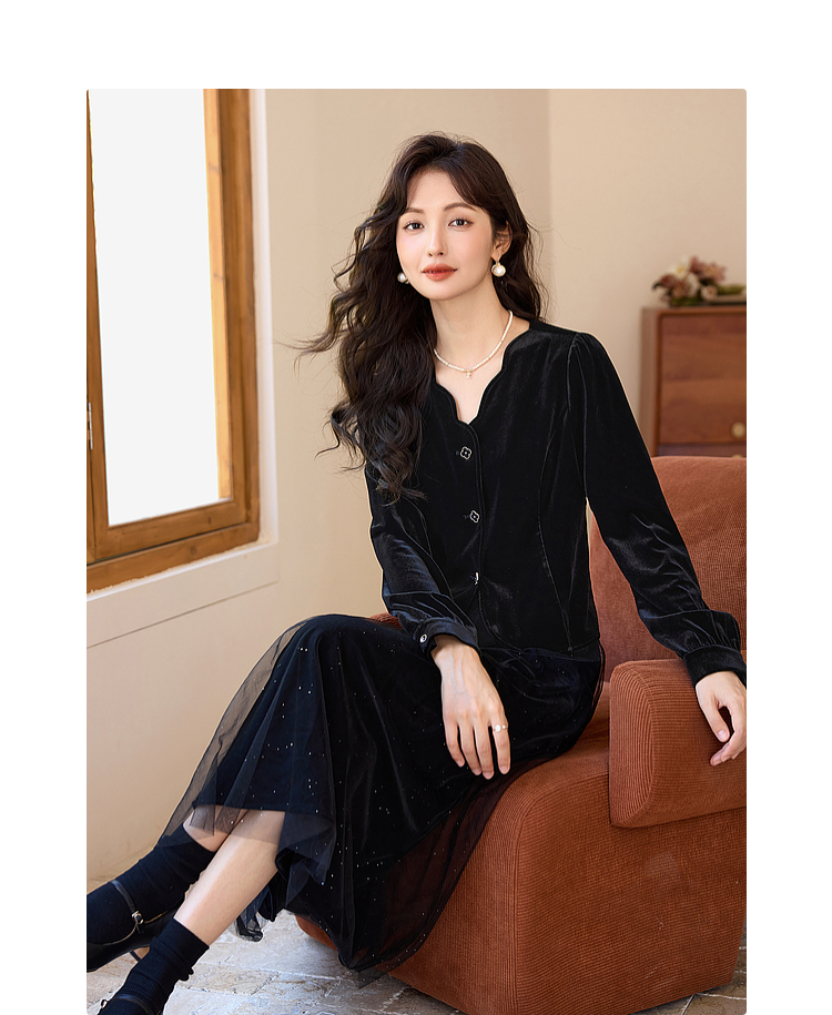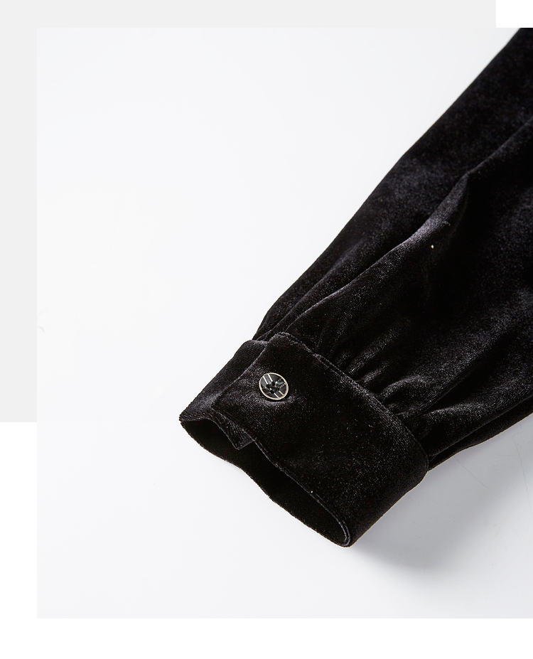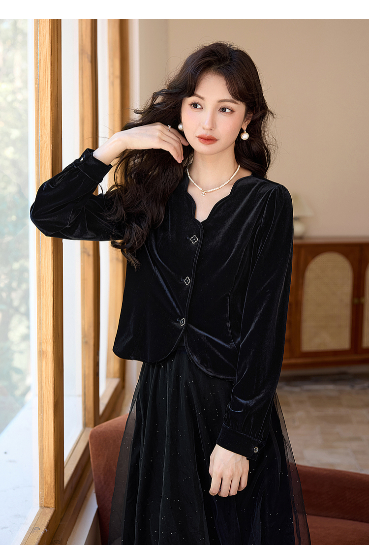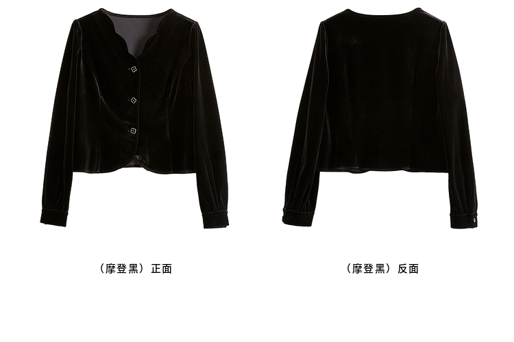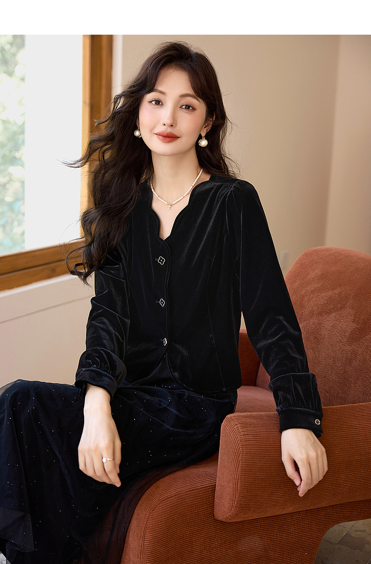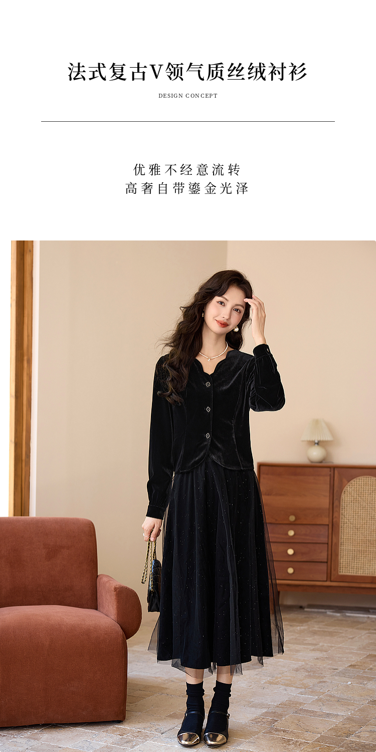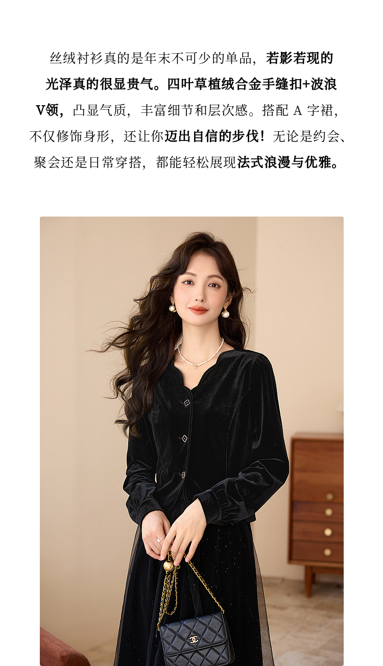 熙世界法式复古黑色丝绒衬衫长袖气质V领洋气小衫2025秋冬新款