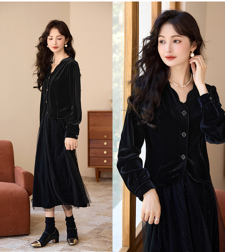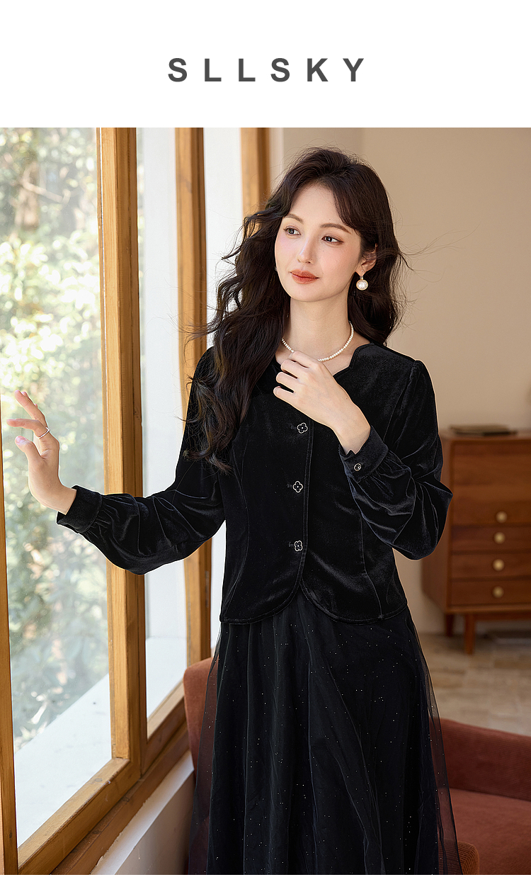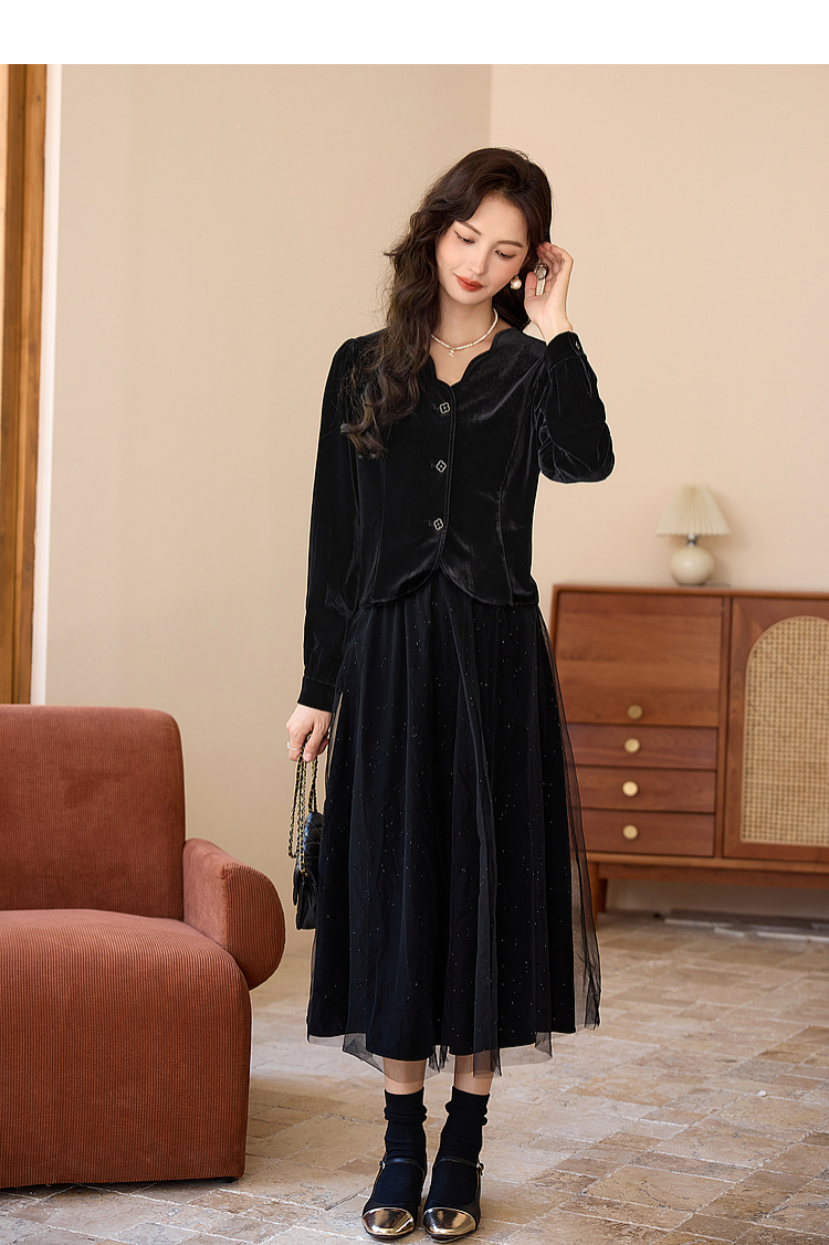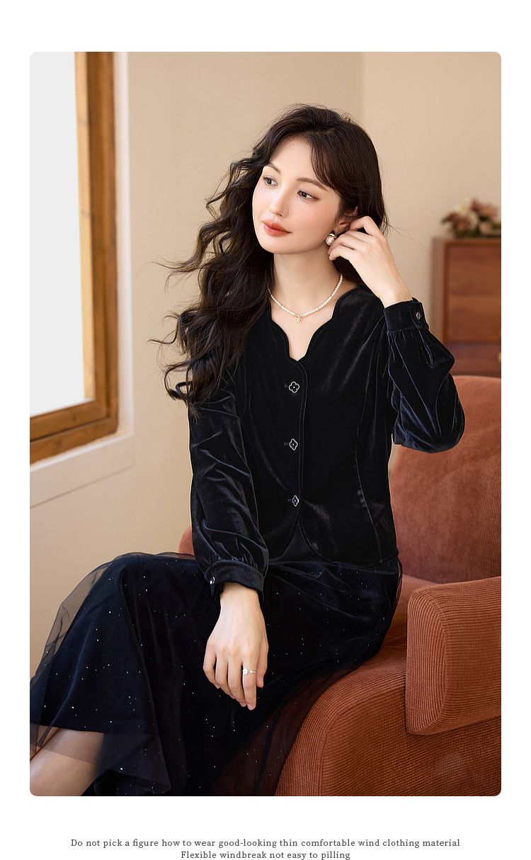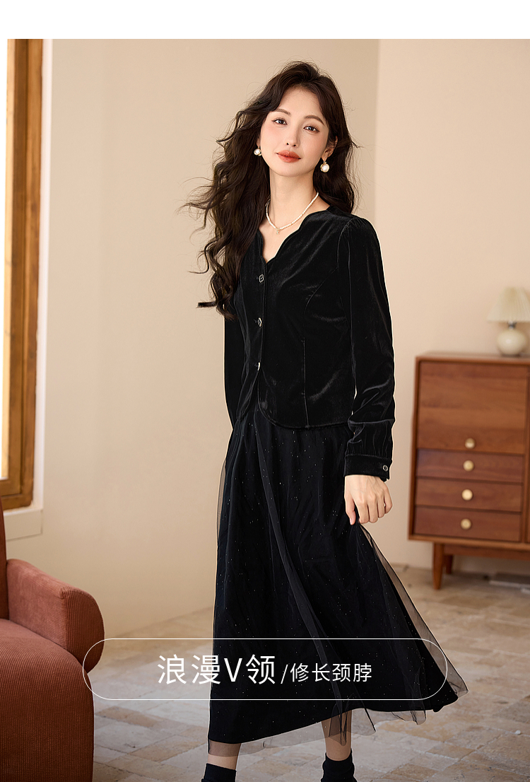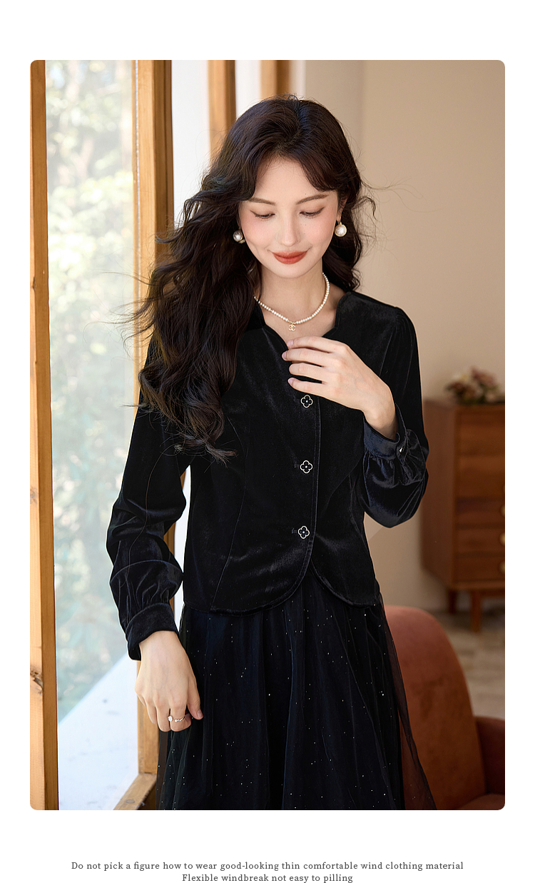 熙世界法式复古黑色丝绒衬衫长袖气质V领洋气小衫2025秋冬新款