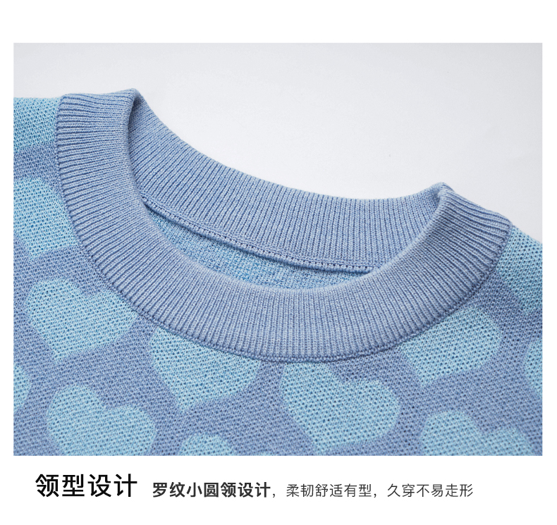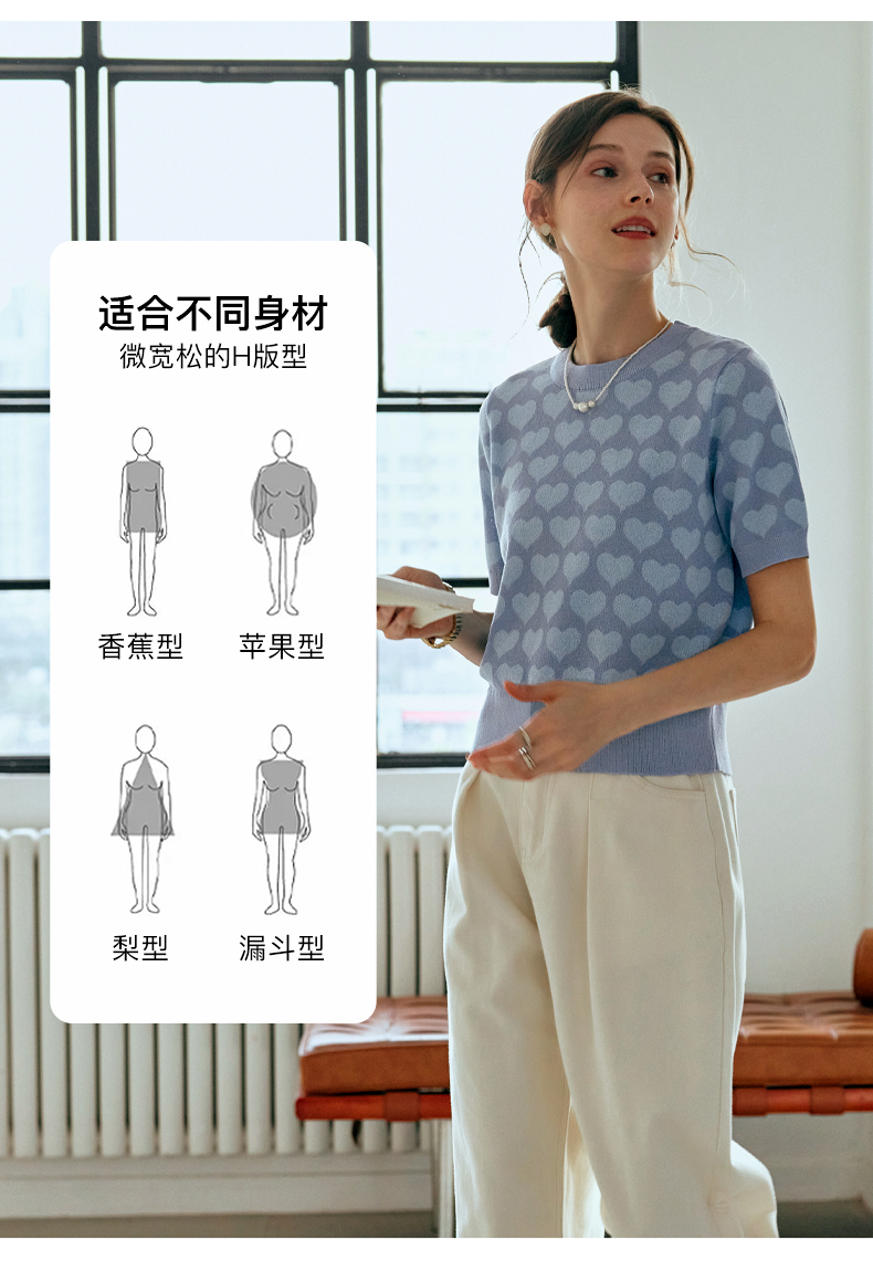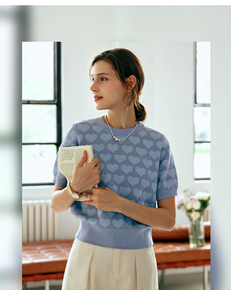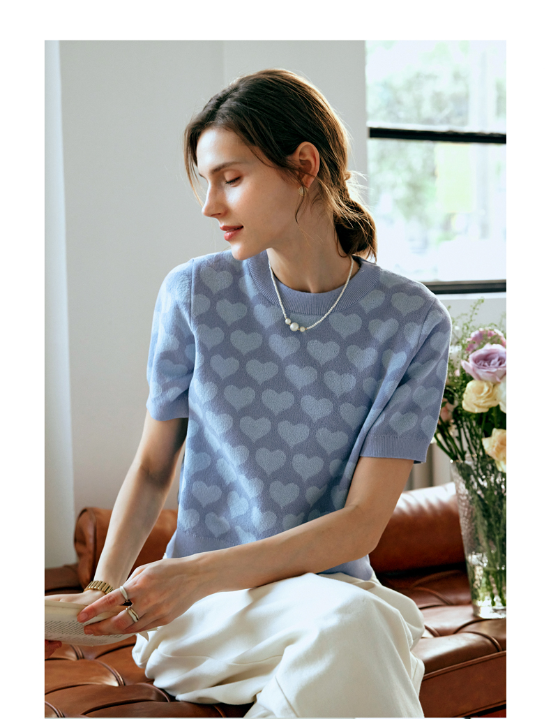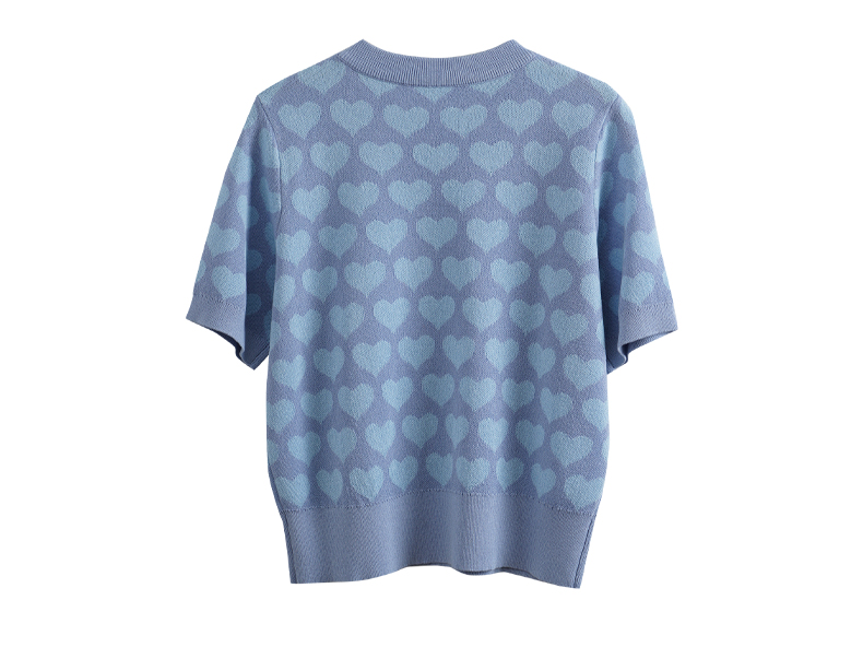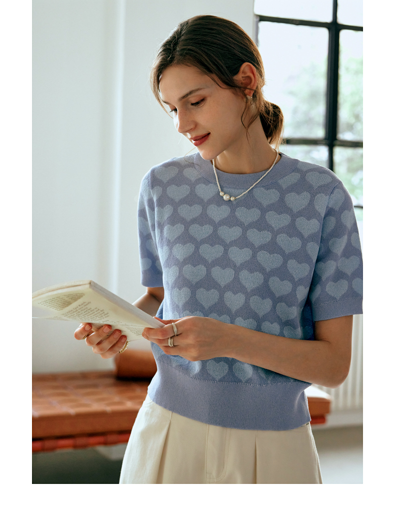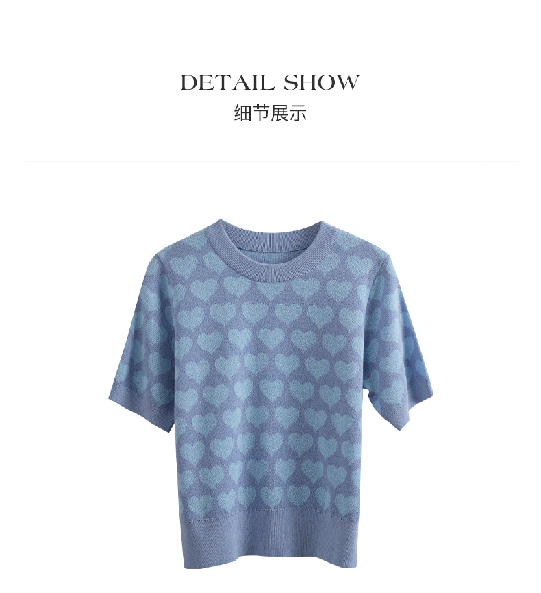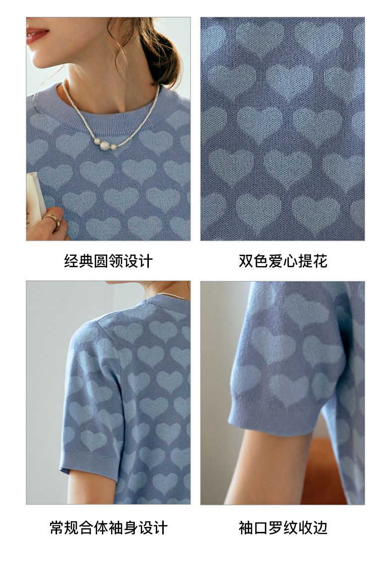 OLrain欧芮儿浅蓝色针织衫女早春2024年新款双色爱心提花短袖上衣