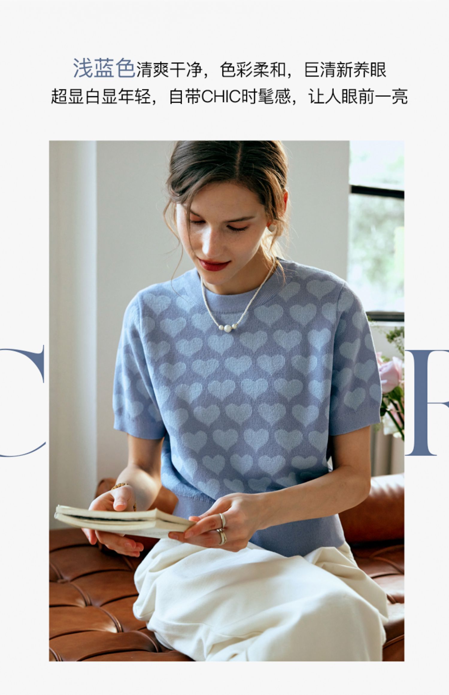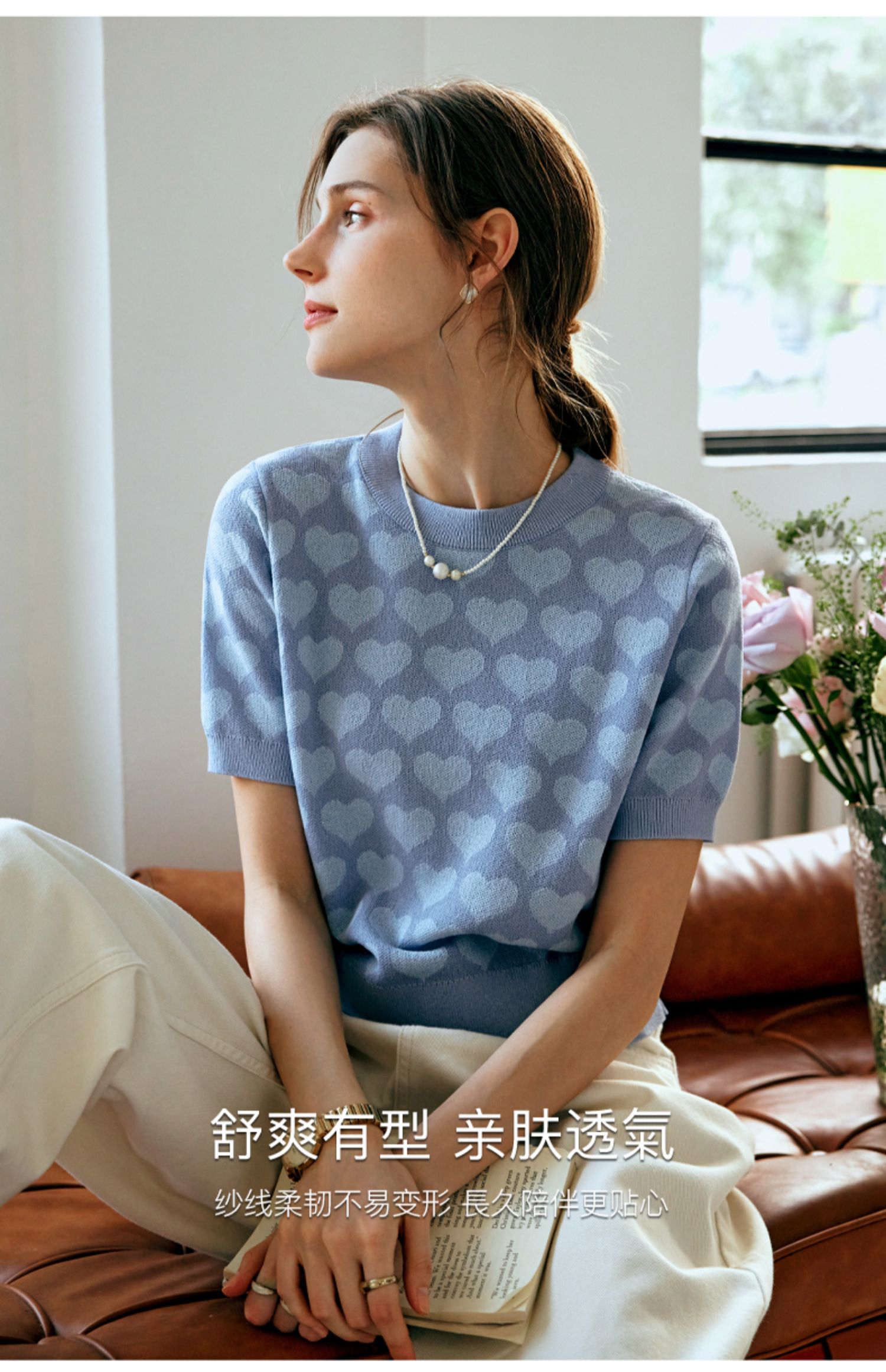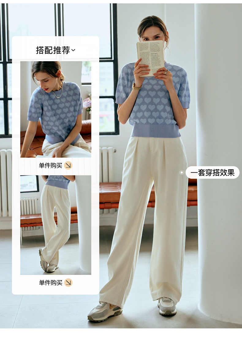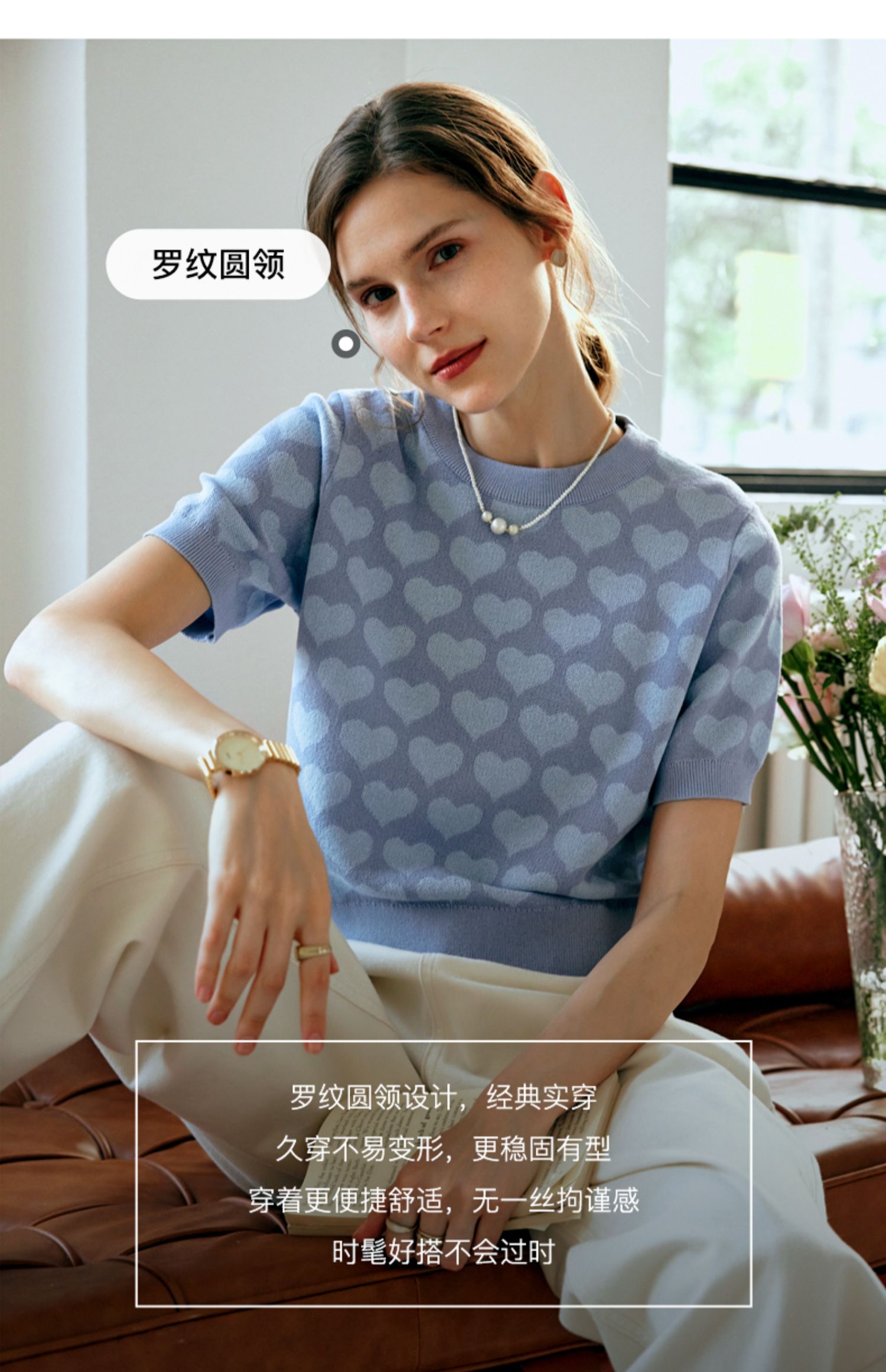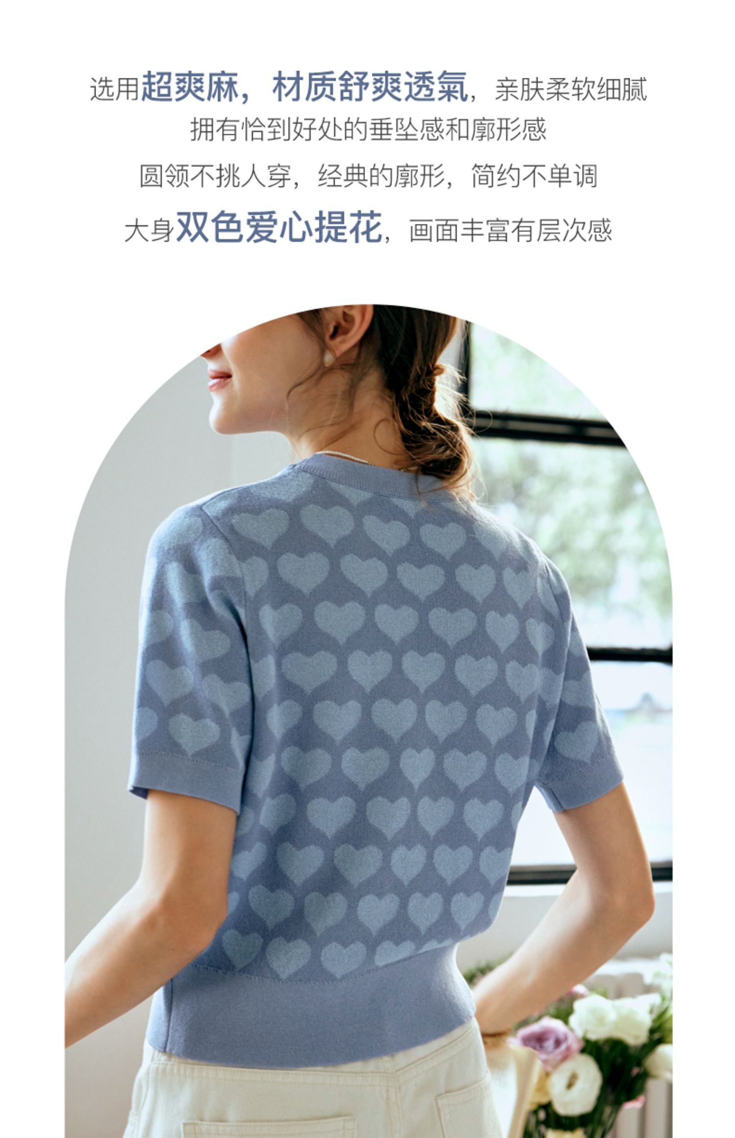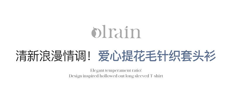 OLrain欧芮儿浅蓝色针织衫女早春2024年新款双色爱心提花短袖上衣