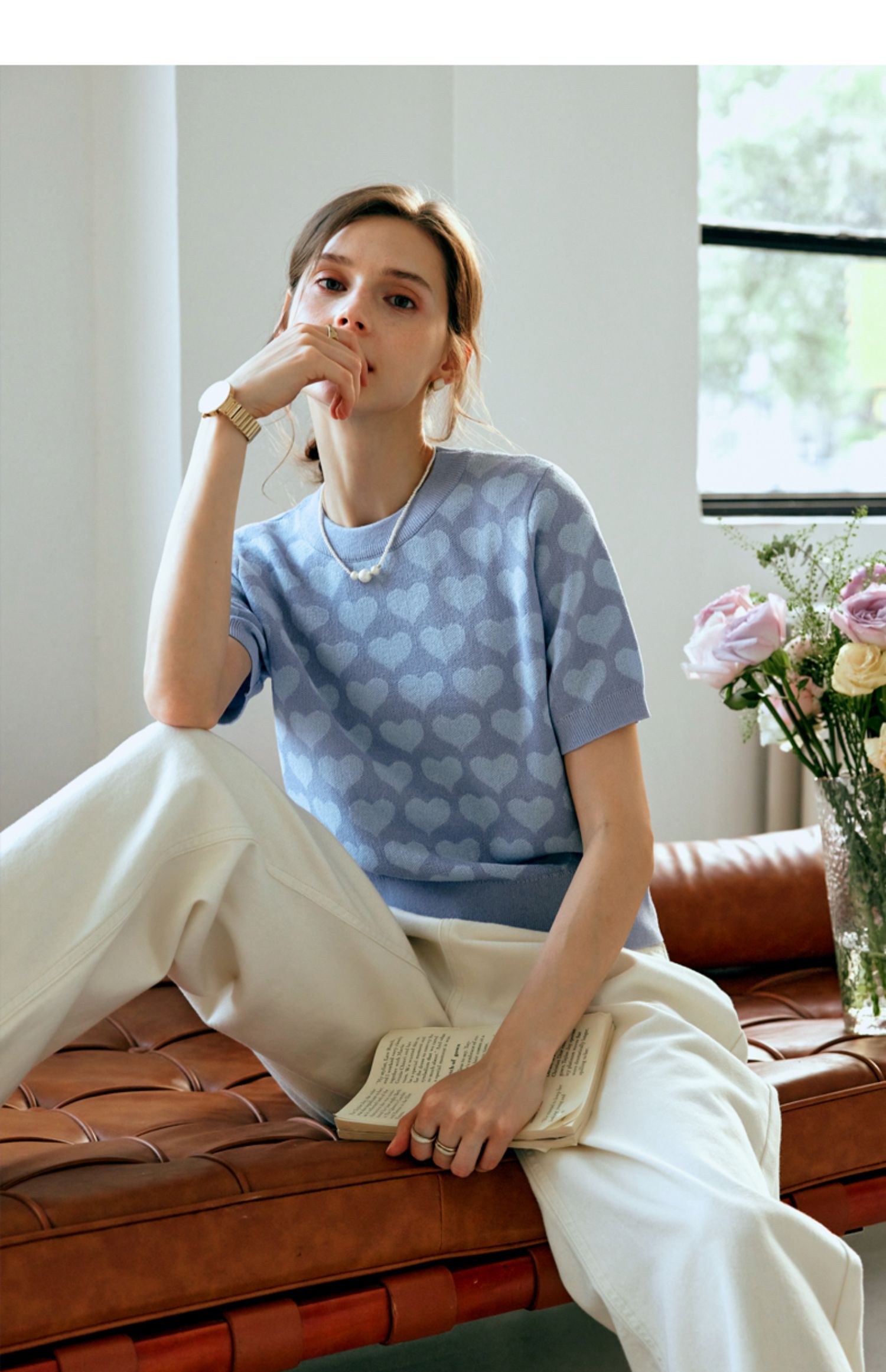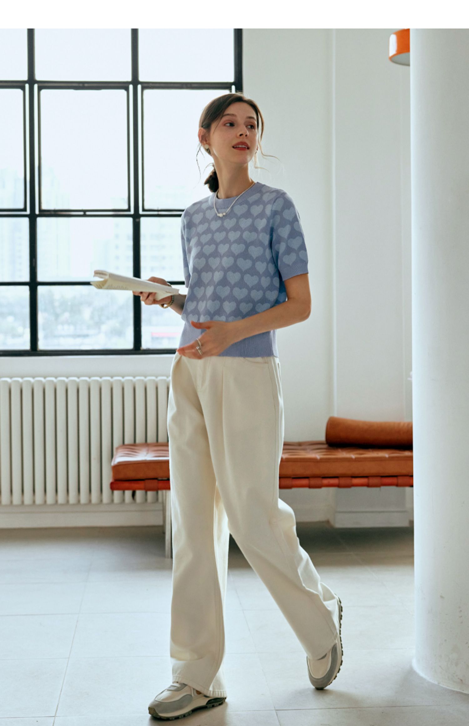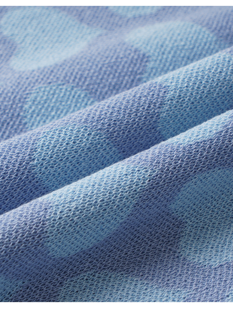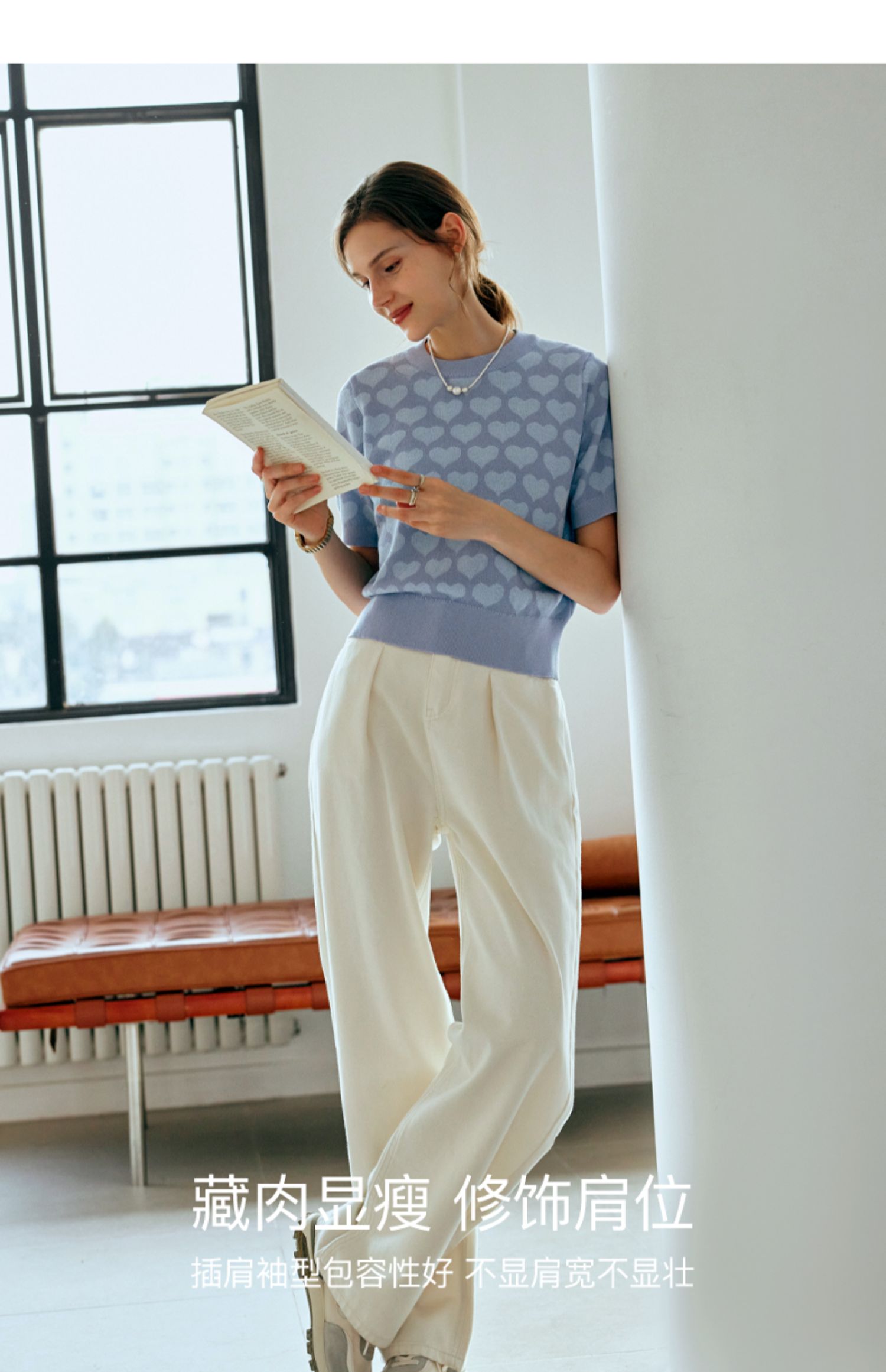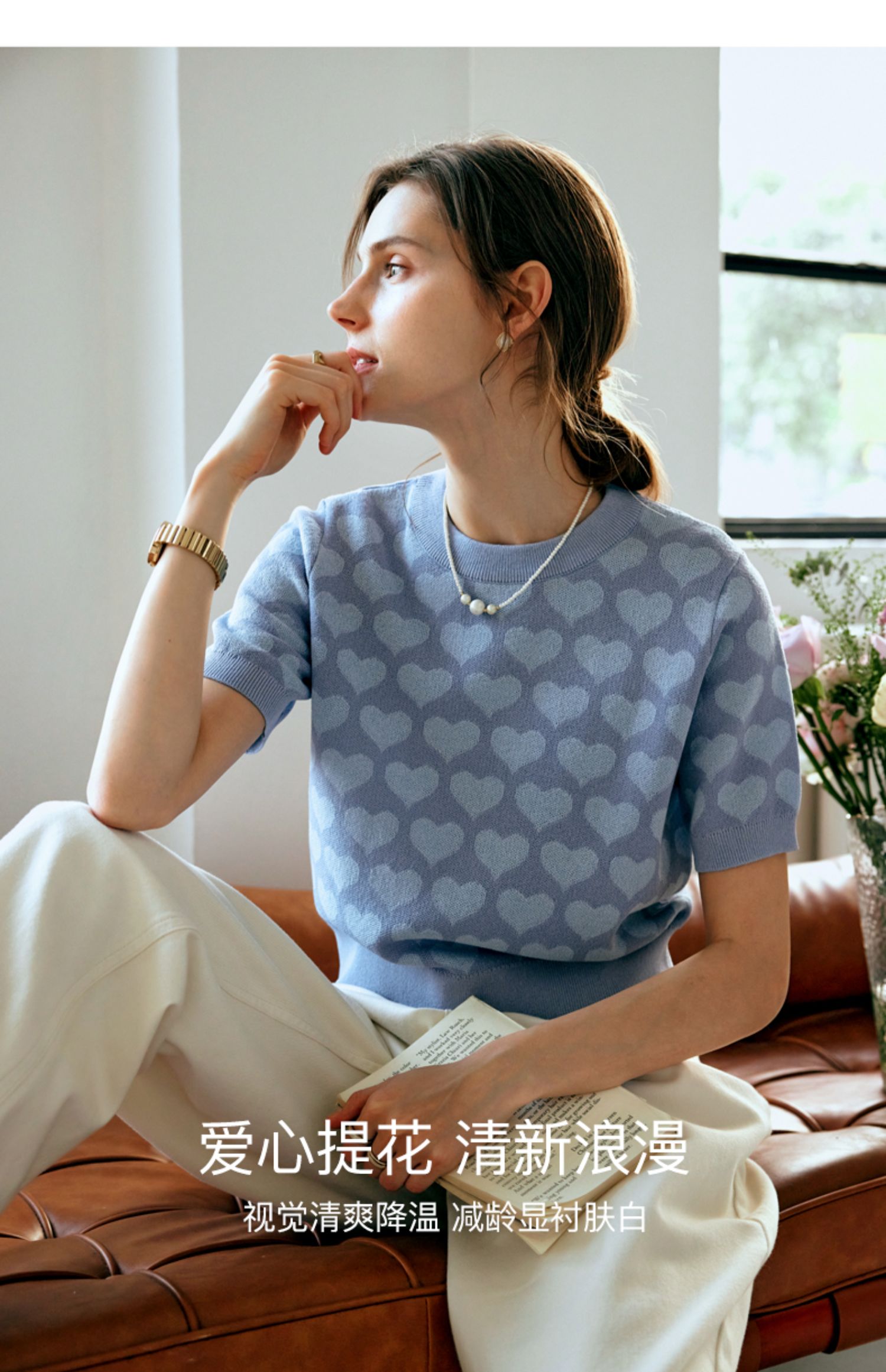 OLrain欧芮儿浅蓝色针织衫女早春2024年新款双色爱心提花短袖上衣