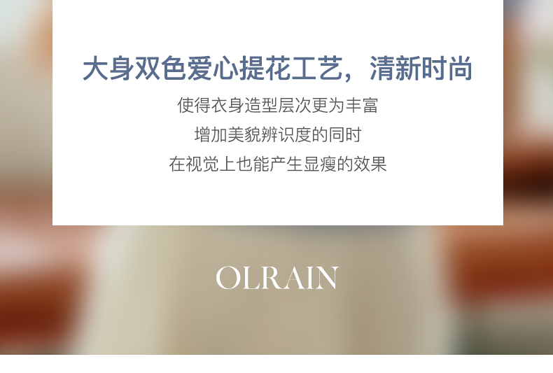 - “精致”是欧芮儿olrain品牌文化的核心,欧芮儿认为,精致的女人,不但要外在动人,更要内在迷人,内外兼修,有魅力、有气质、有内涵,自信而不自傲,优雅而不矫揉,自有万种风情而不轻浮,更不故作矜持。