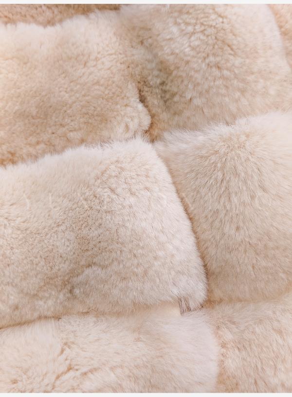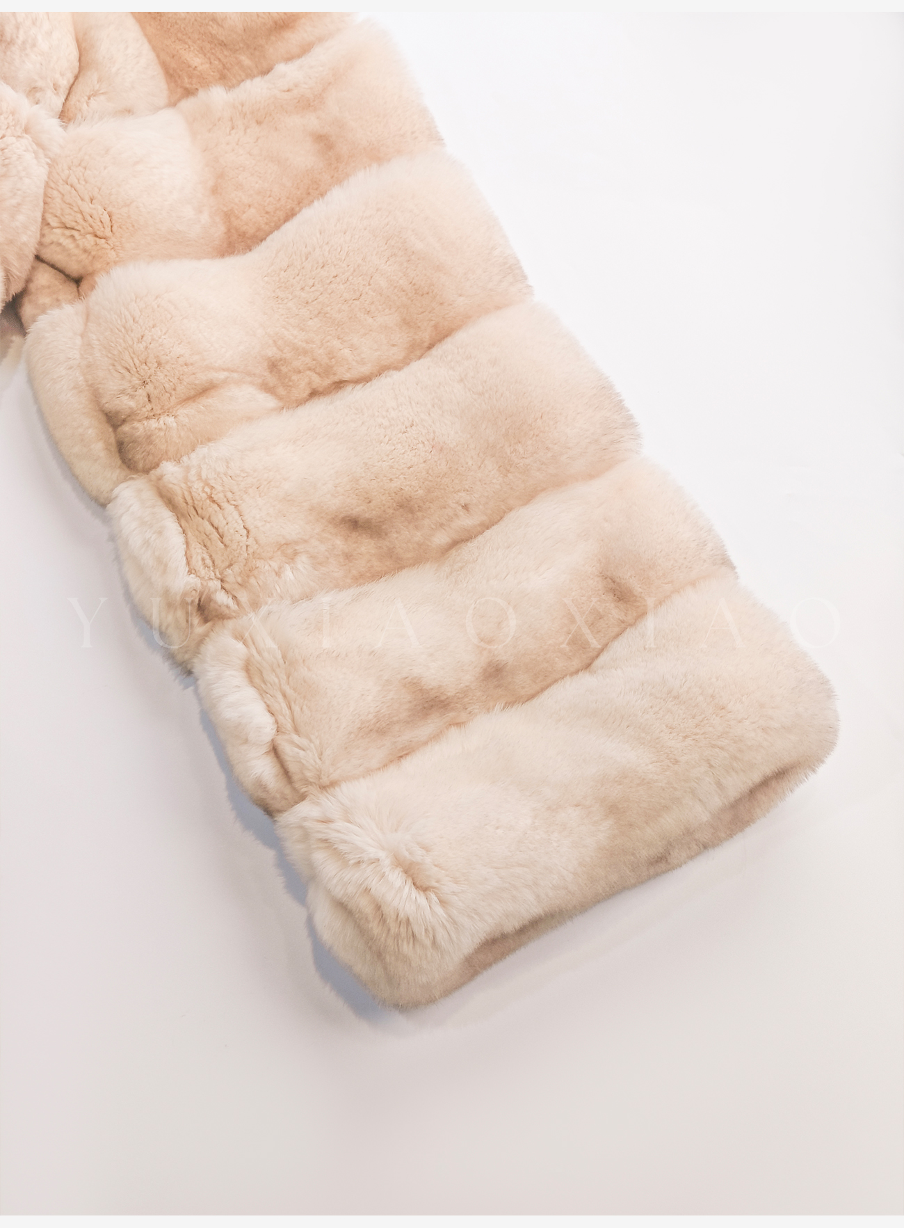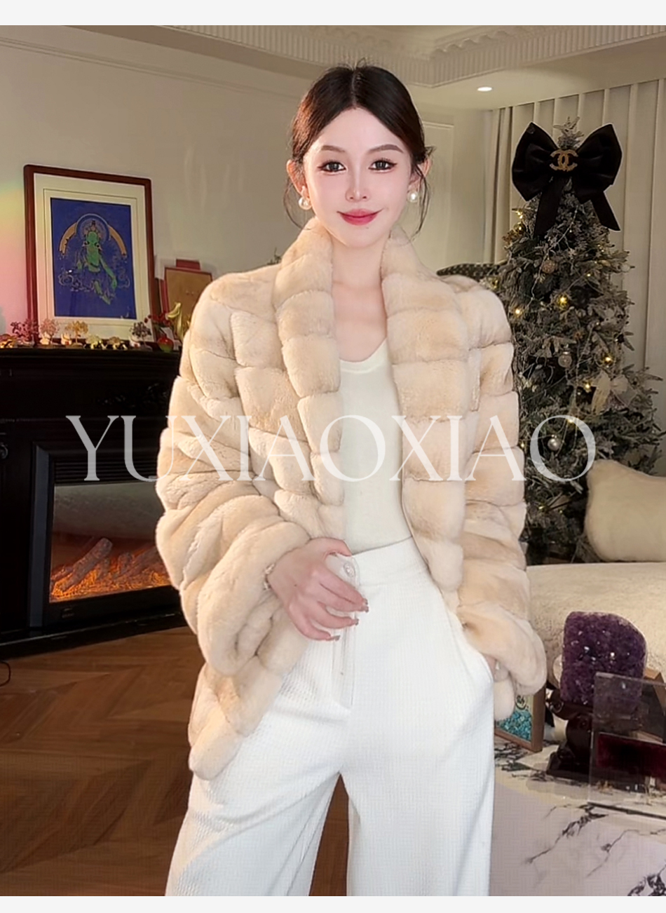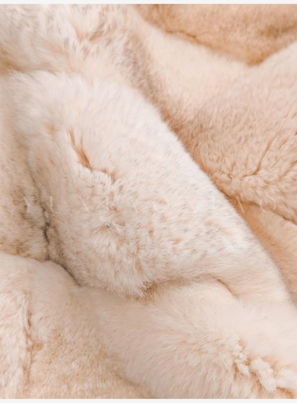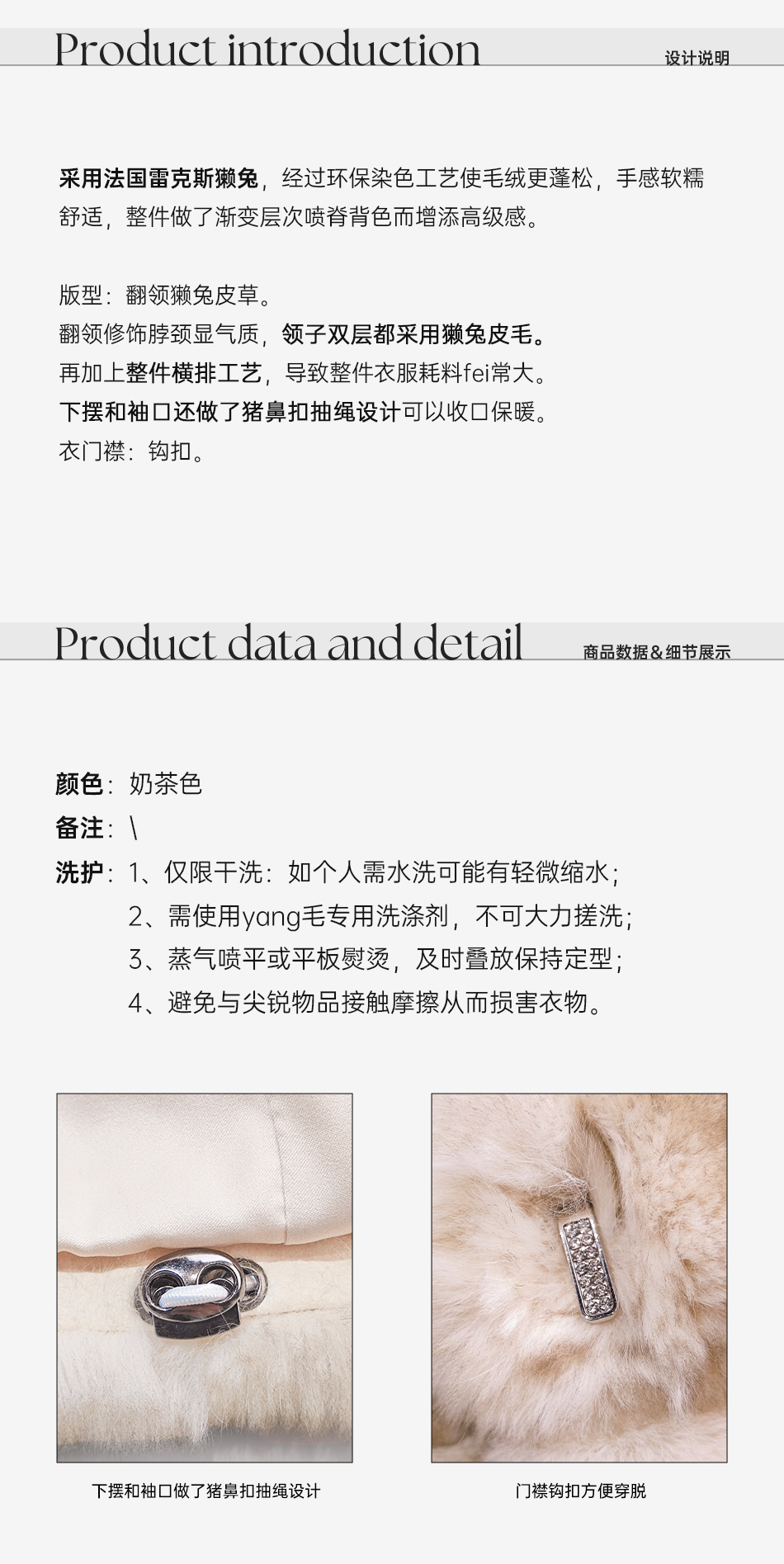 余潇潇【拉菲古堡】渐变层次横排雷克斯獭兔毛V领猪鼻扣抽绳皮草