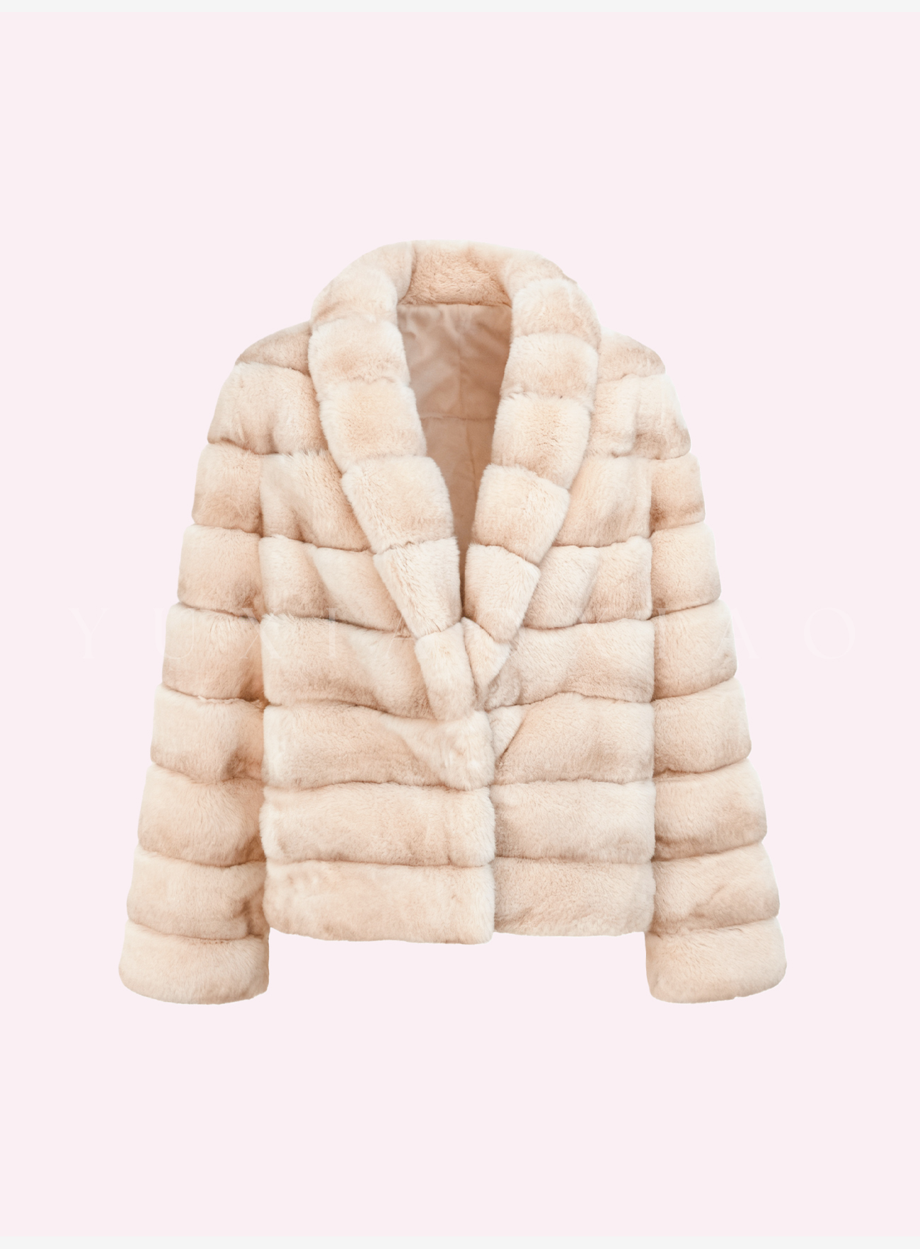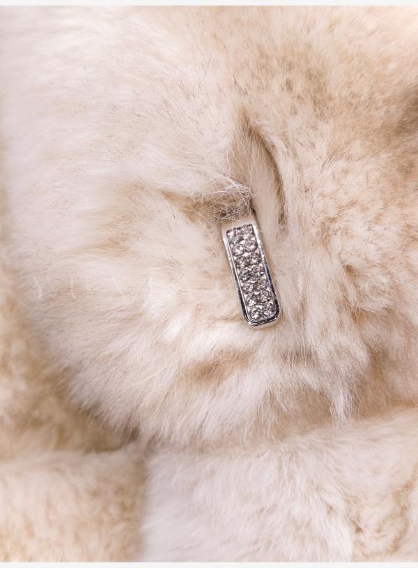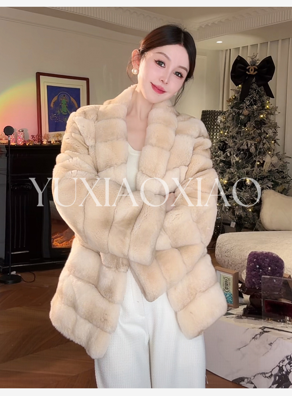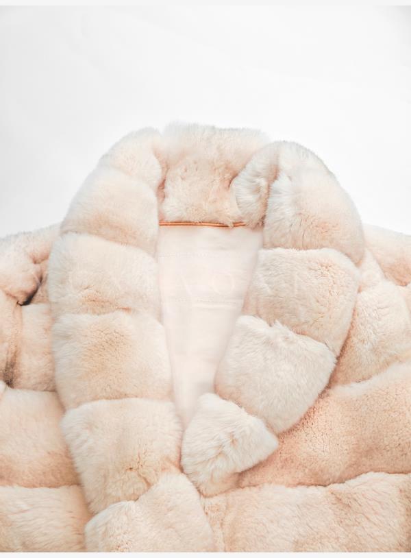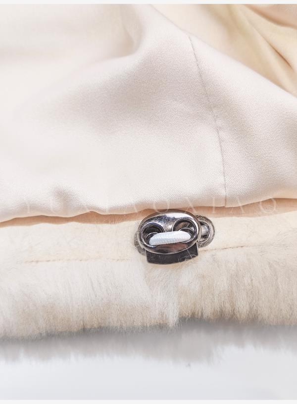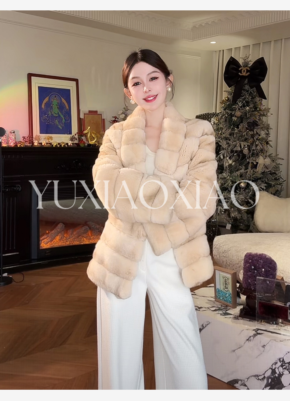 余潇潇【拉菲古堡】渐变层次横排雷克斯獭兔毛V领猪鼻扣抽绳皮草