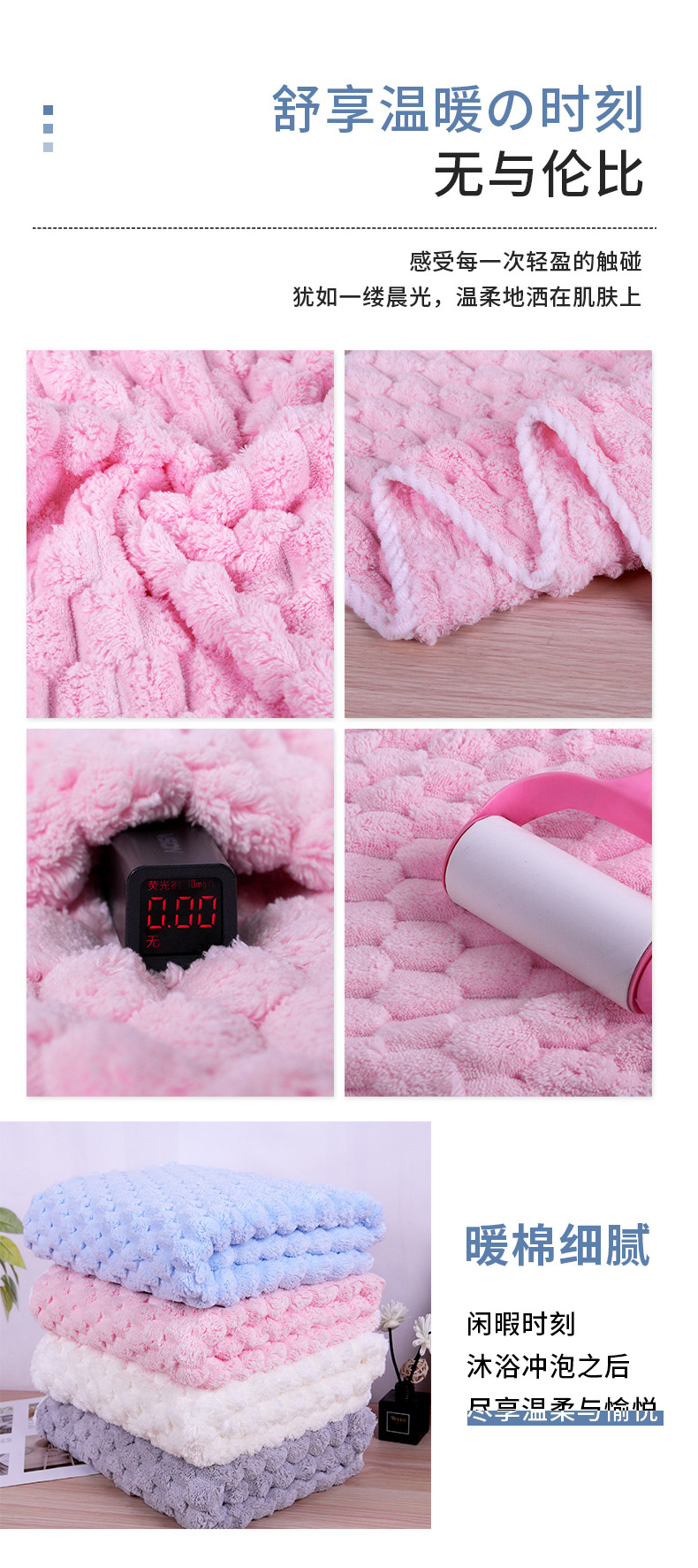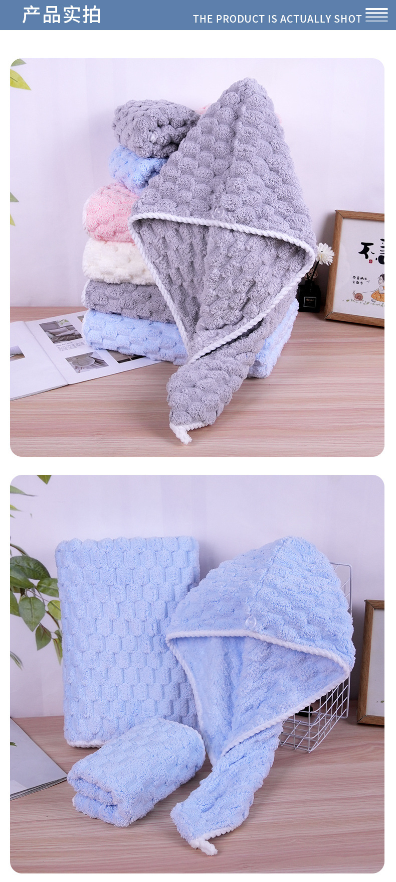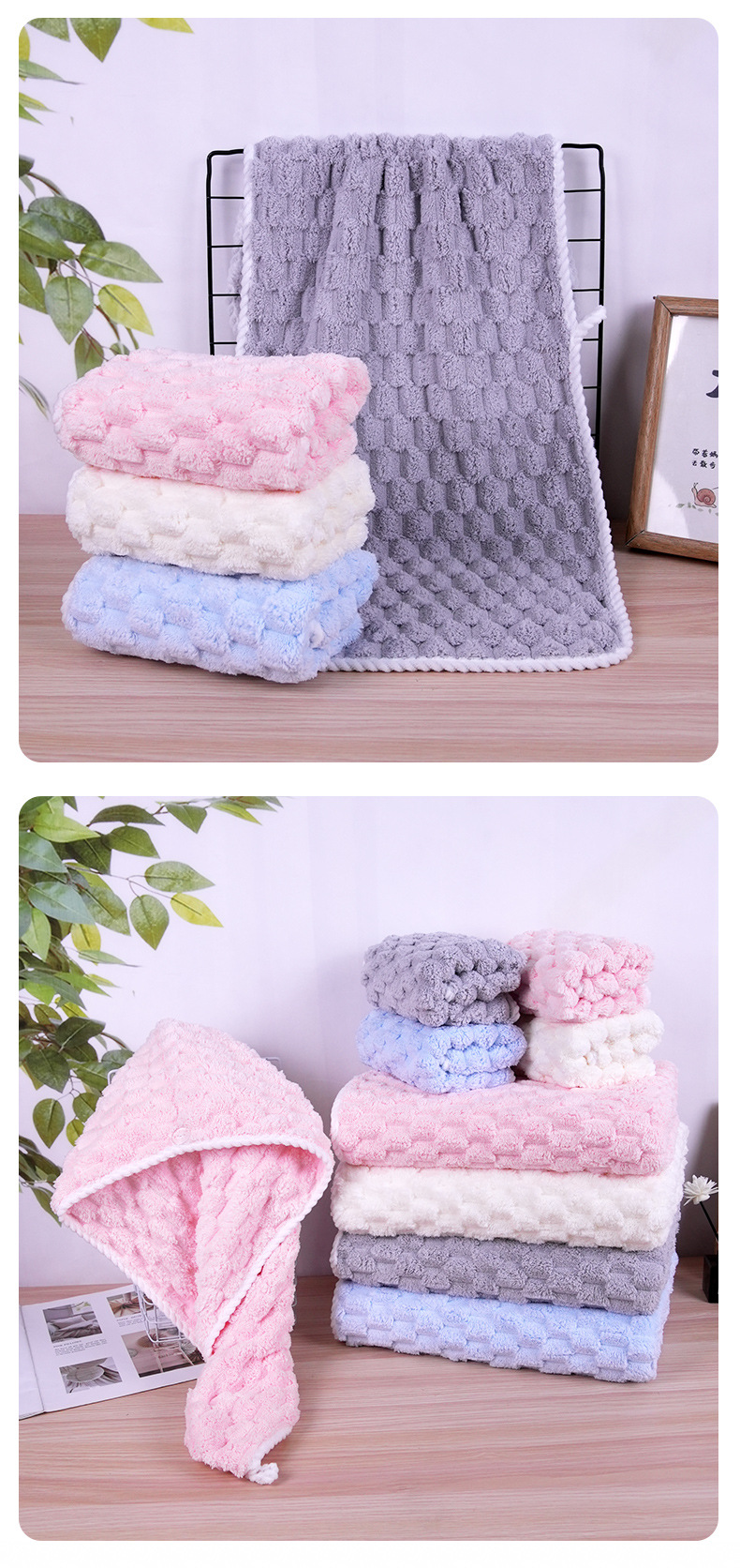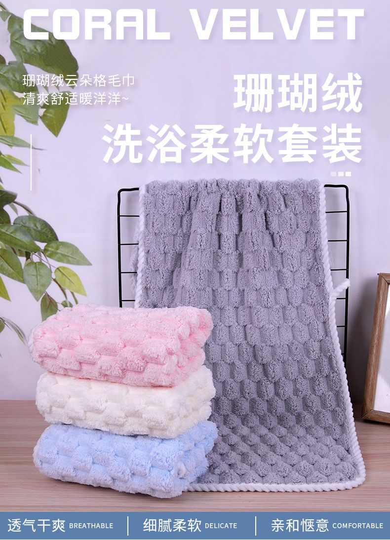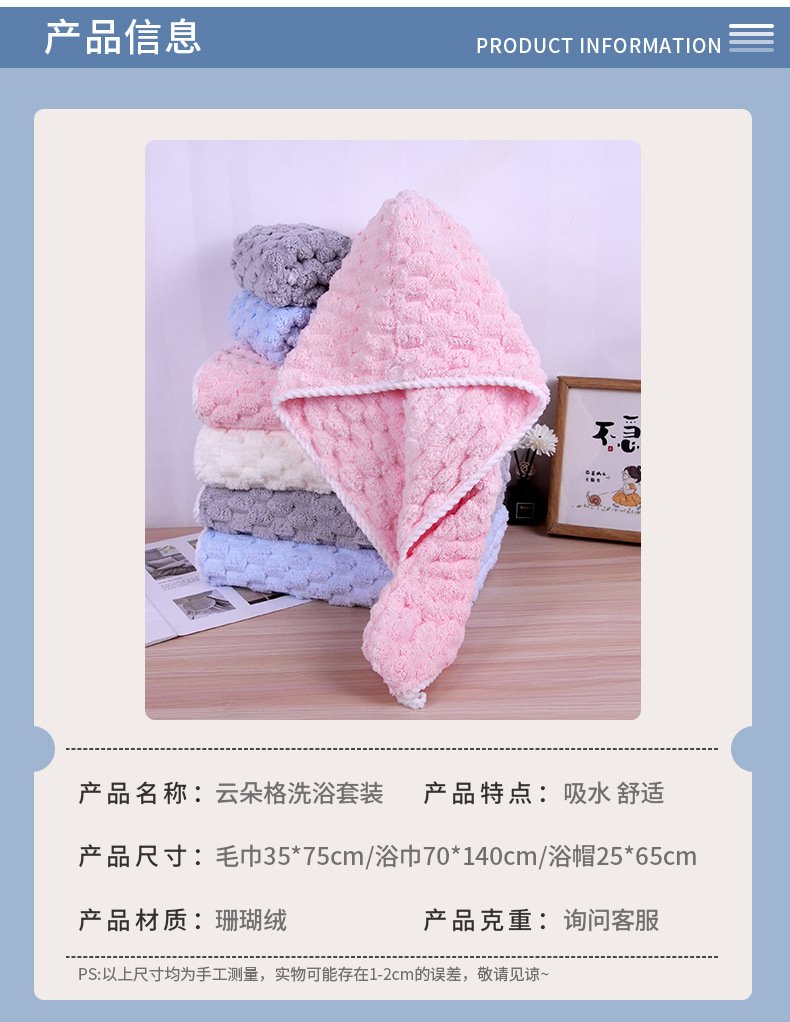 【珊瑚绒云朵格毛巾套装】家用云朵格绒毛巾套巾吸水浴巾干发帽珊瑚绒浴巾柔软吸水毛巾浴巾浴帽。ry