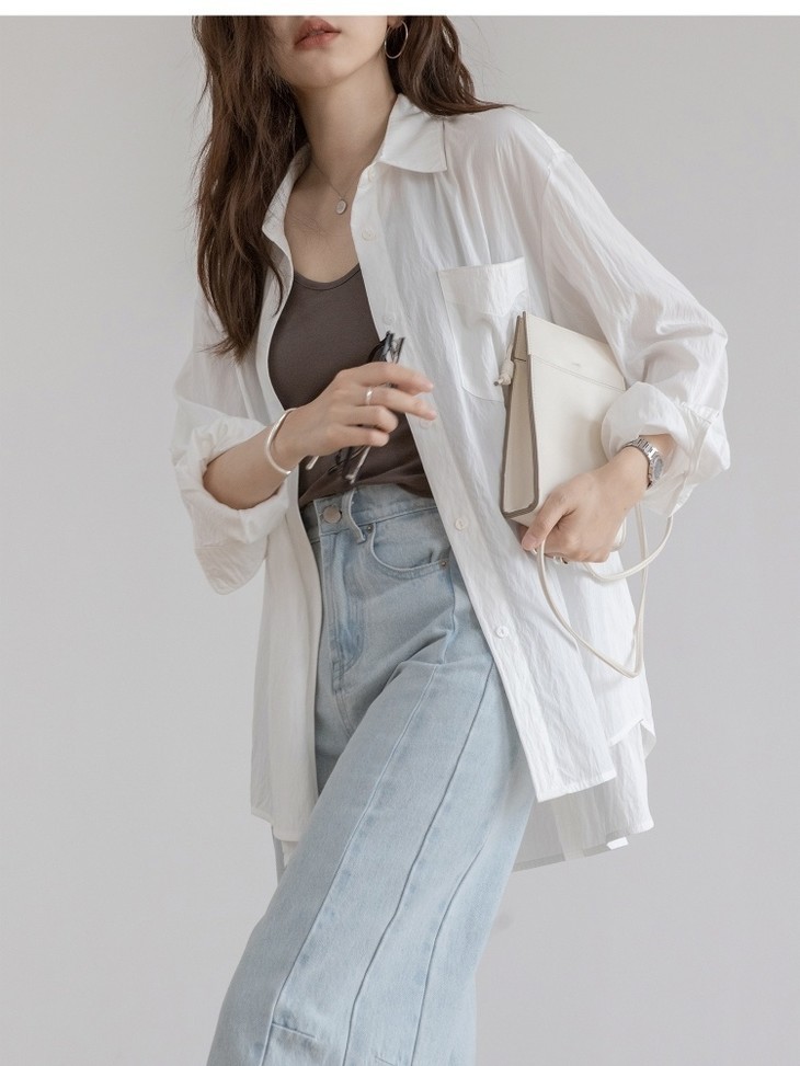 衬衫宽松慵懒的廓形版型,包容性好 余量大很显瘦 左胸前的方形口袋让衬衫看起来不会太过单调 弧形下摆设计很能遮胯修饰臀部线条 平时无需费心搭配,随便一穿氛围感直接封神!
