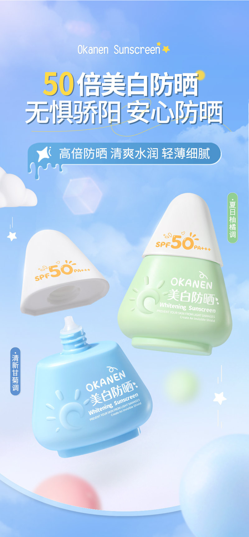 【OK∧N:EN隔离防晒霜乳】三重光盾,美白更防晒;40℃暴晒不黑,追求白皙人生。户外运动、美白达人必备的隔离防晒霜乳,SPF50+高倍防晒,清爽不油腻防水防汗,舒适呵护肌肤!